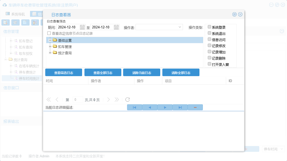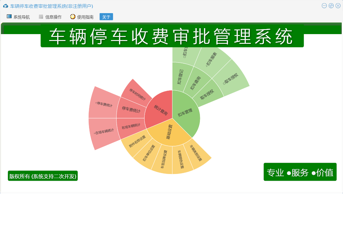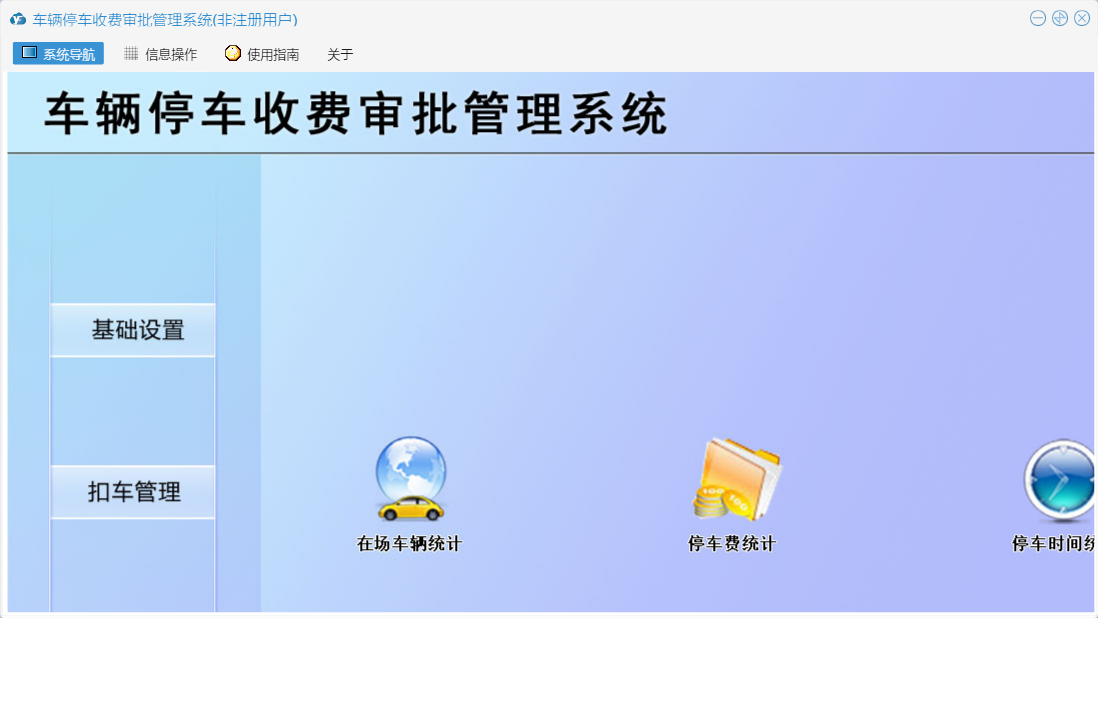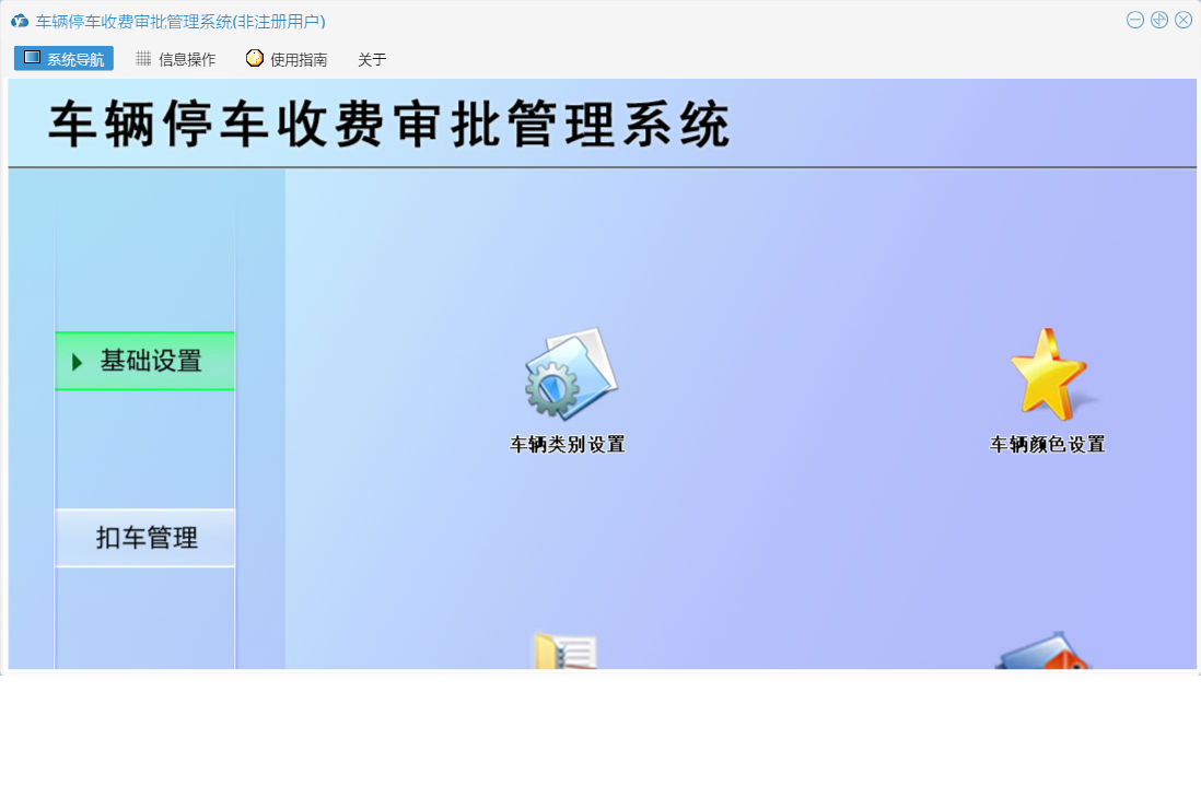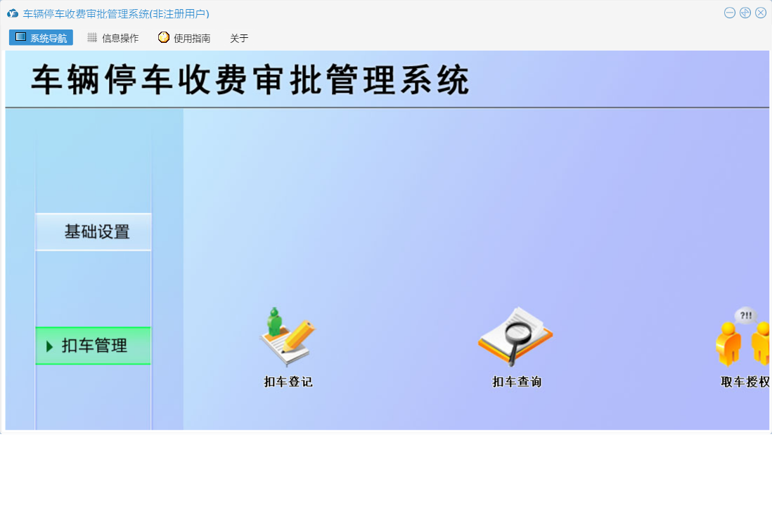 车辆停车收费审批管理系统包含以下功能:基础设置、取车授权、日志、关于、扣车登记、权限设置、统计查询、扣车管理等