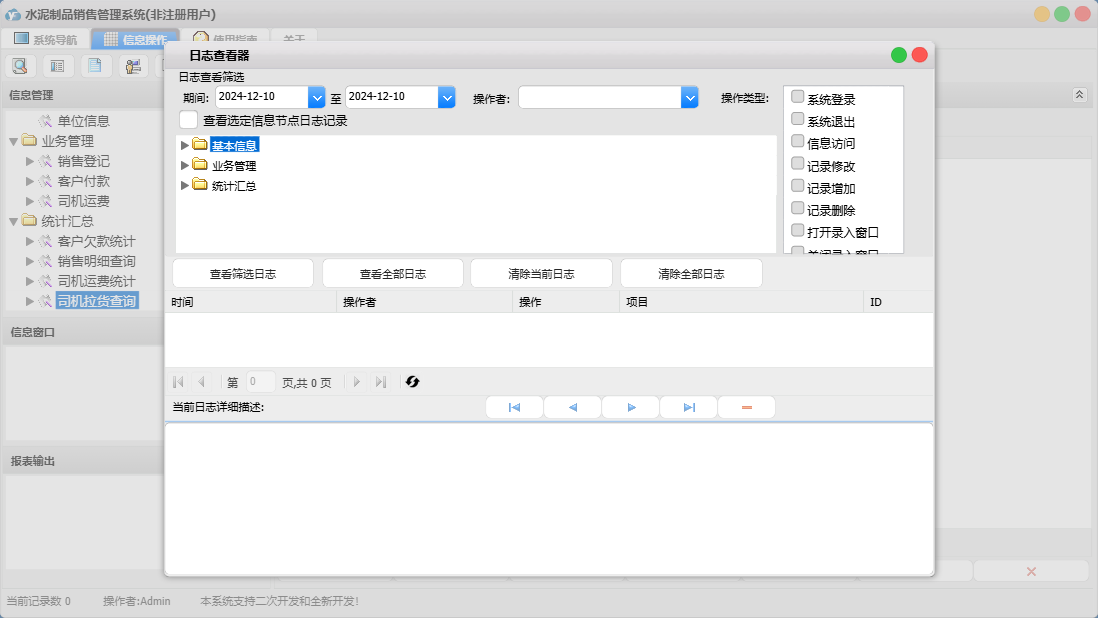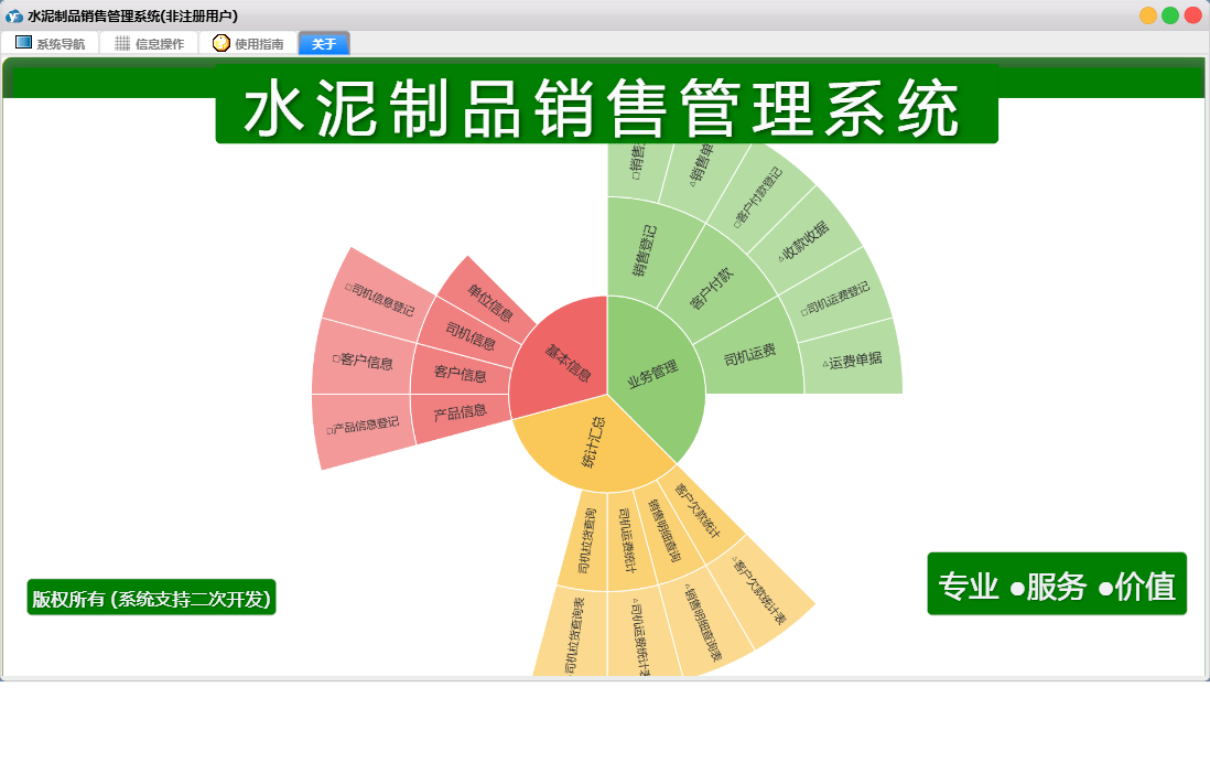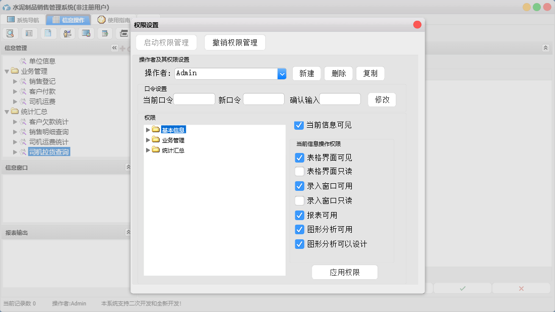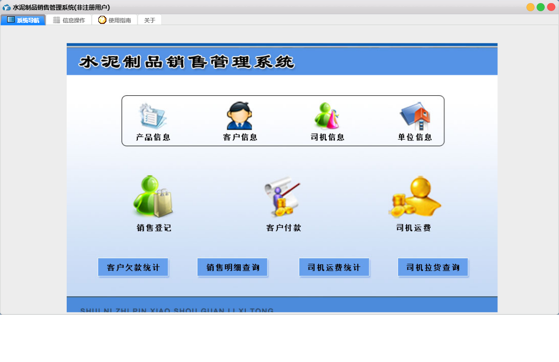 水泥制品销售管理系统包含以下功能:客户信息、客户付款、司机信息、日志、关于、销售登记、权限设置、司机运费、基本信息、产品信息等