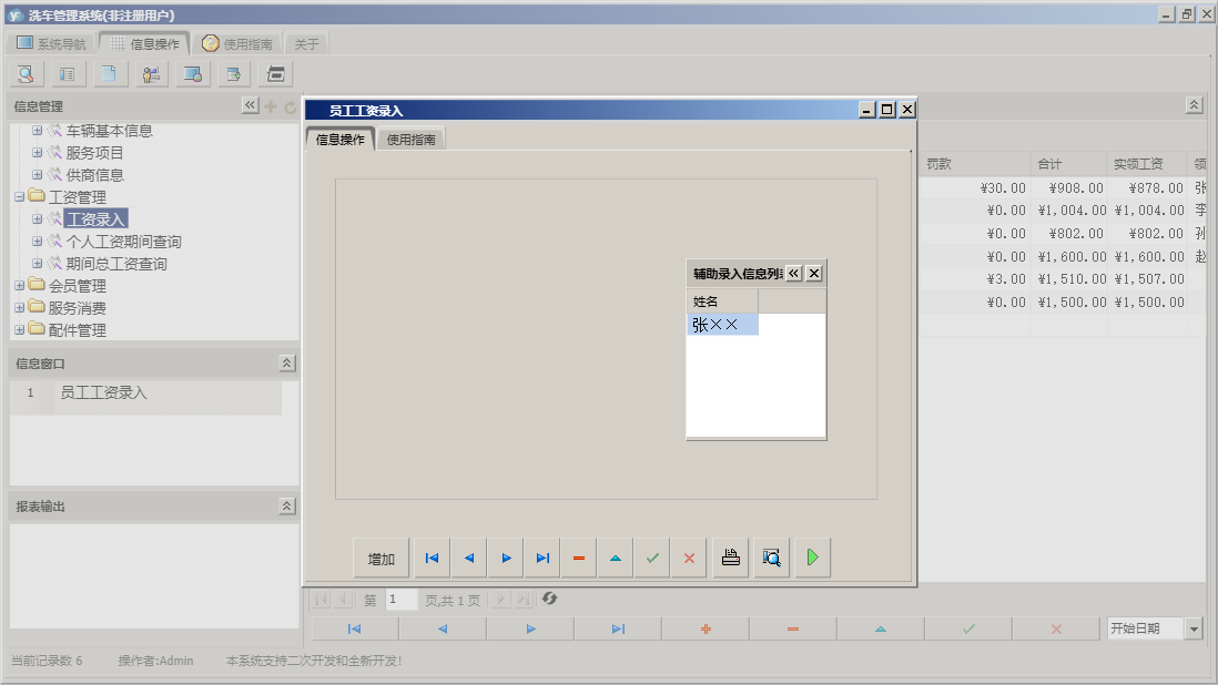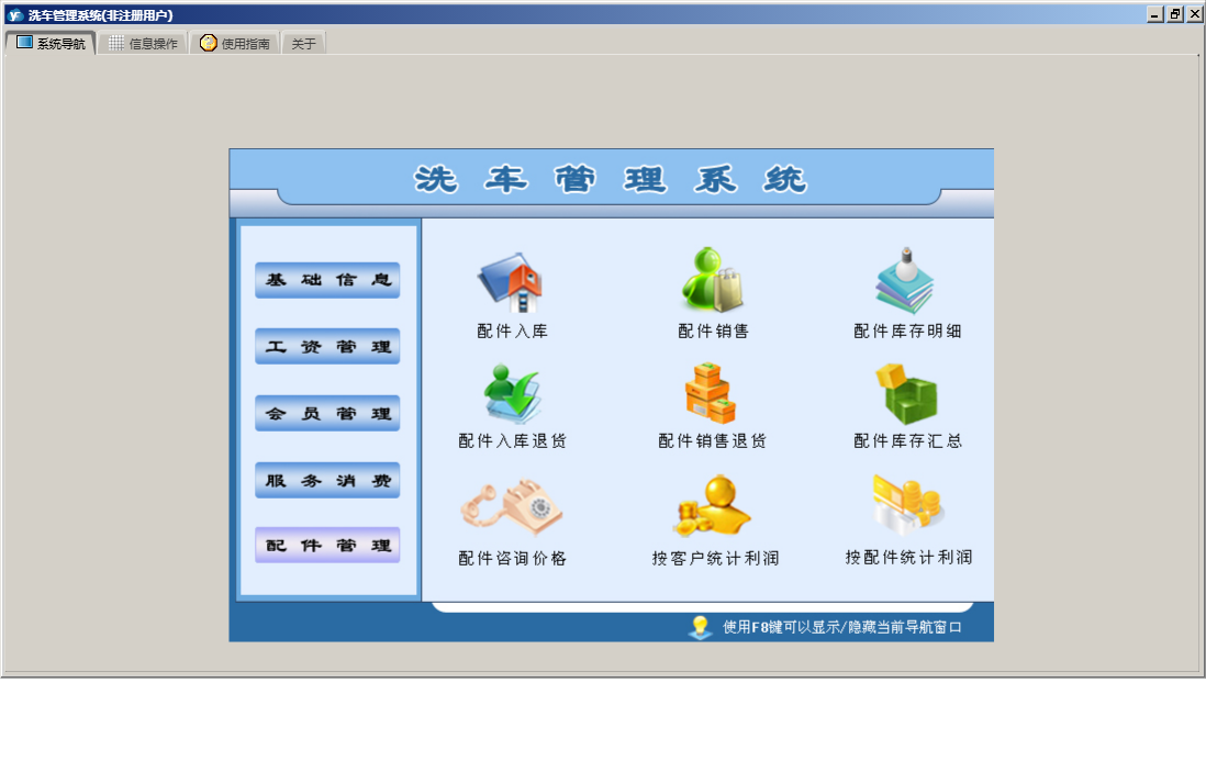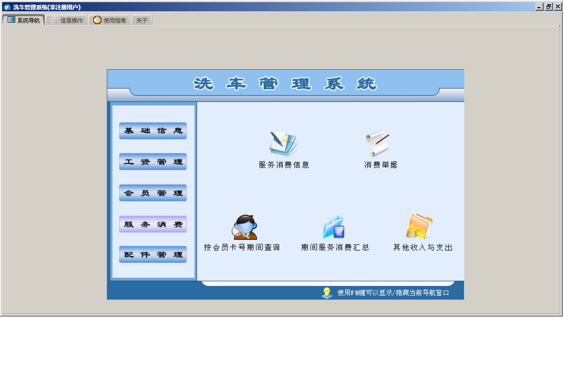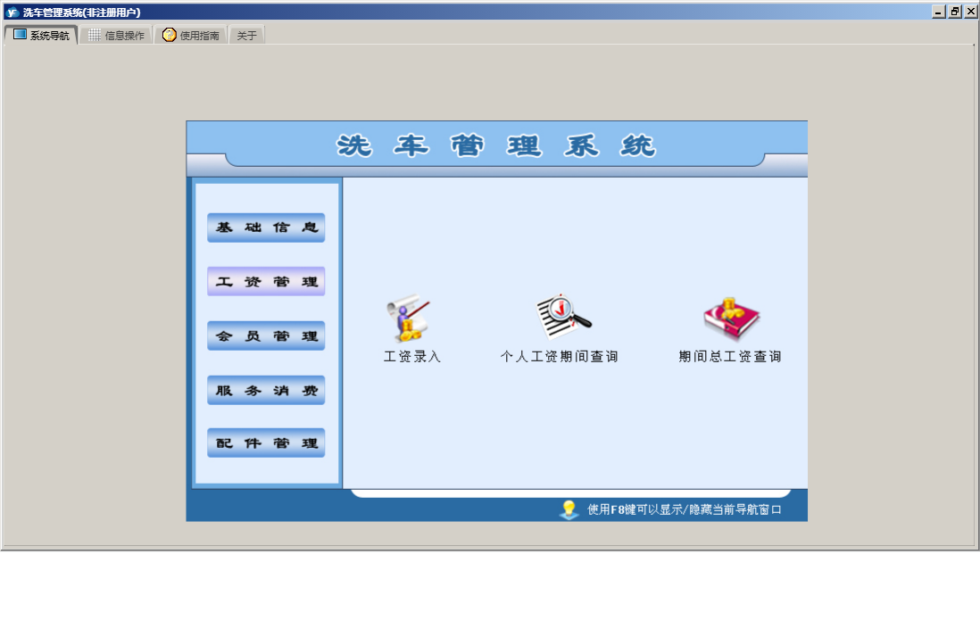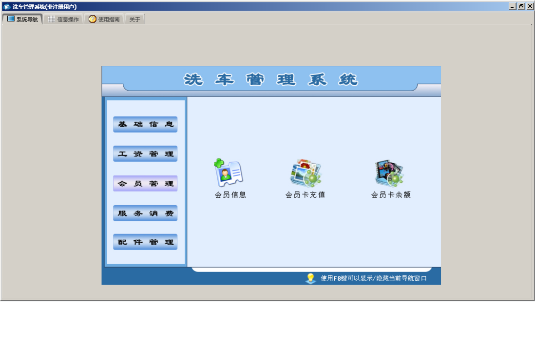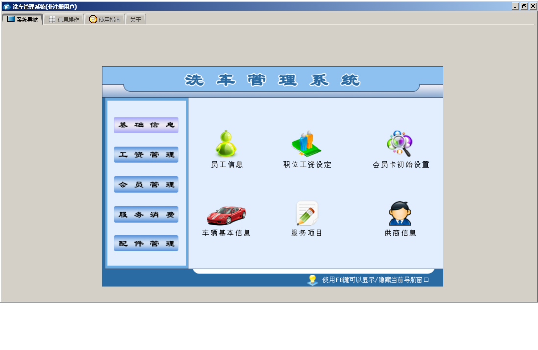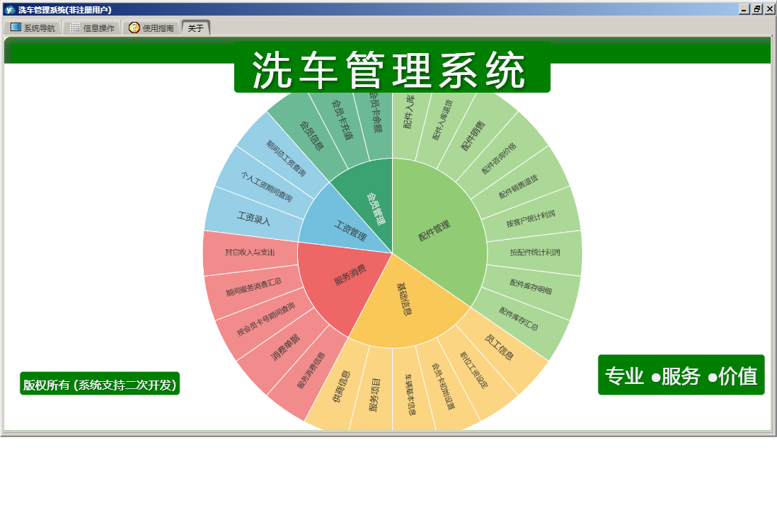 洗车管理系统包含以下功能:基础信息、会员信息、会员卡充值、会员管理、配件管理、工资管理、服务消费信息、车辆基本信息、员工信息、服务消费、服务项目、关于、会员卡初始设置、职位工资设定、工资录入、供商信息等