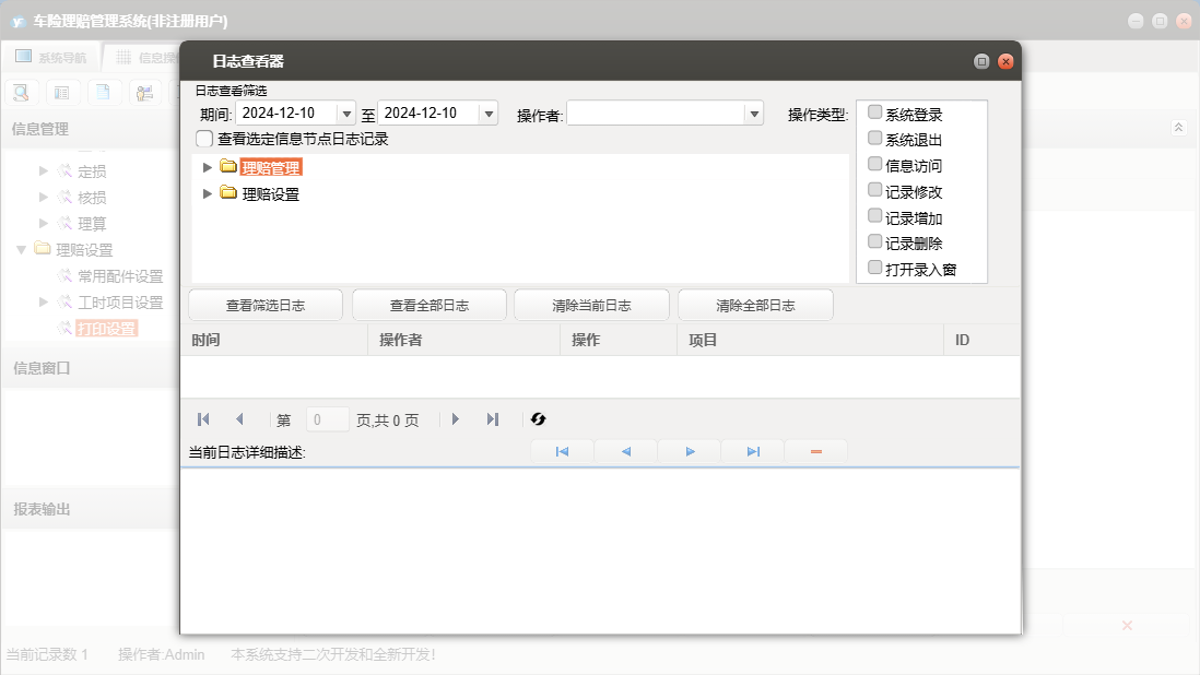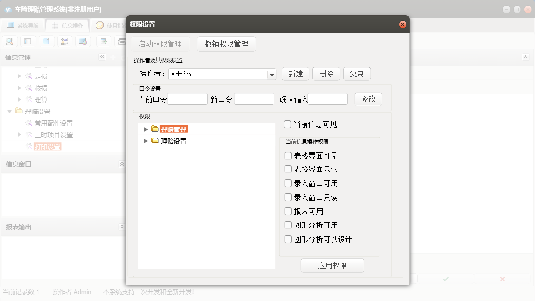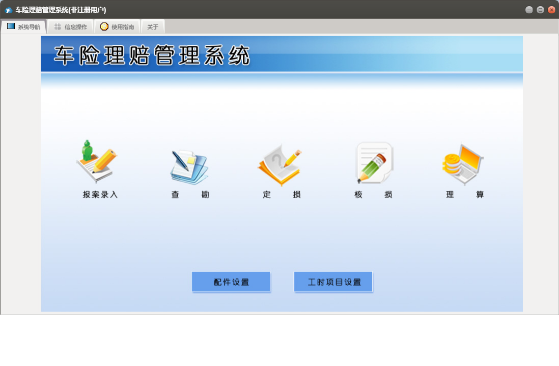 车险理赔管理系统包含以下功能:面板1、工时项目设置、定损、日志、理算、关于、权限设置、查勘、核损、报案录入等