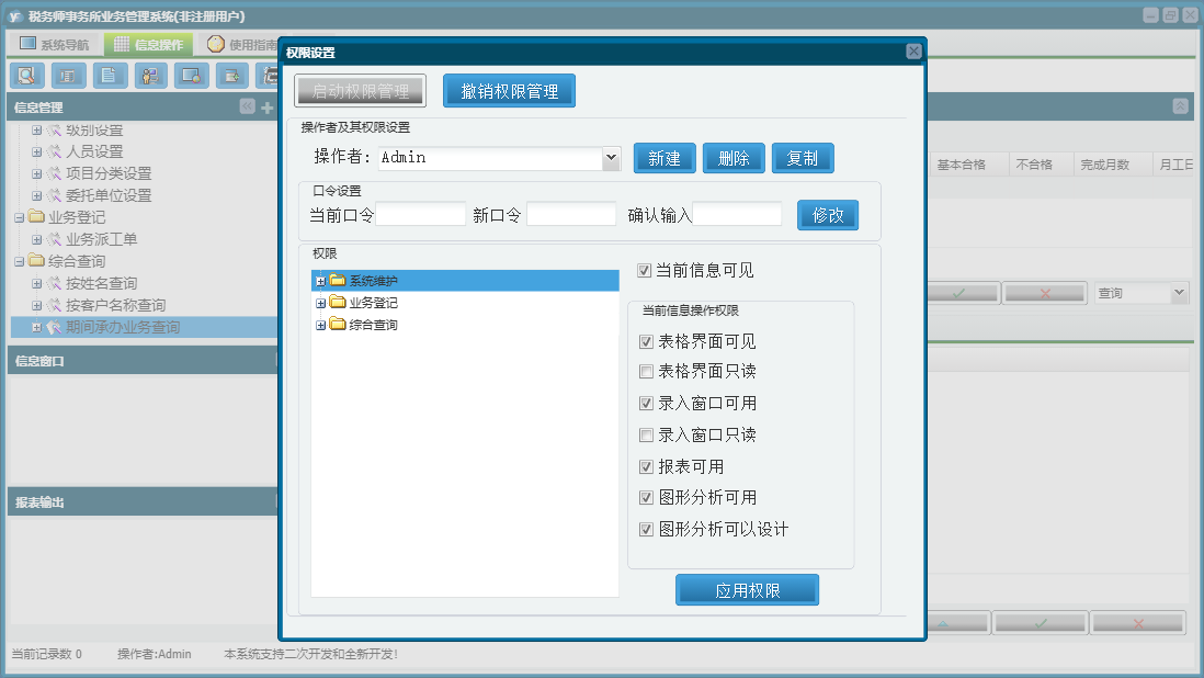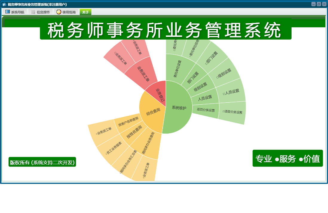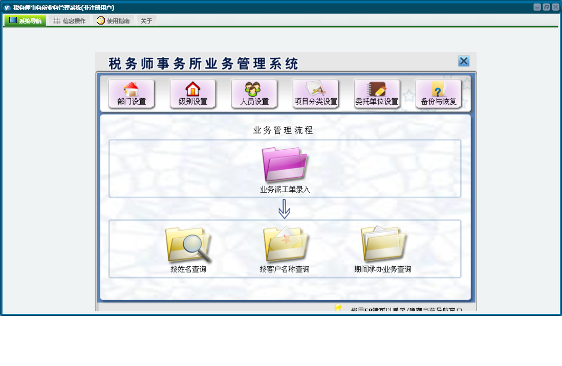 税务师事务所业务管理系统包含以下功能:部门设置、导航、级别设置、日志、委托单位设置、人员设置、关于、项目分类设置、权限设置、业务派工单等