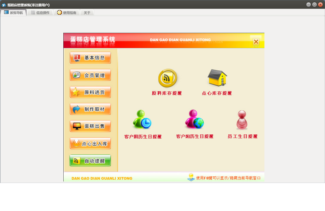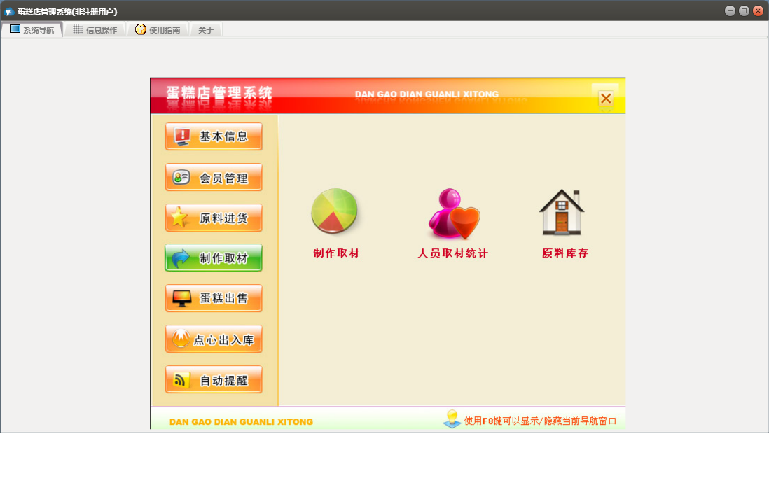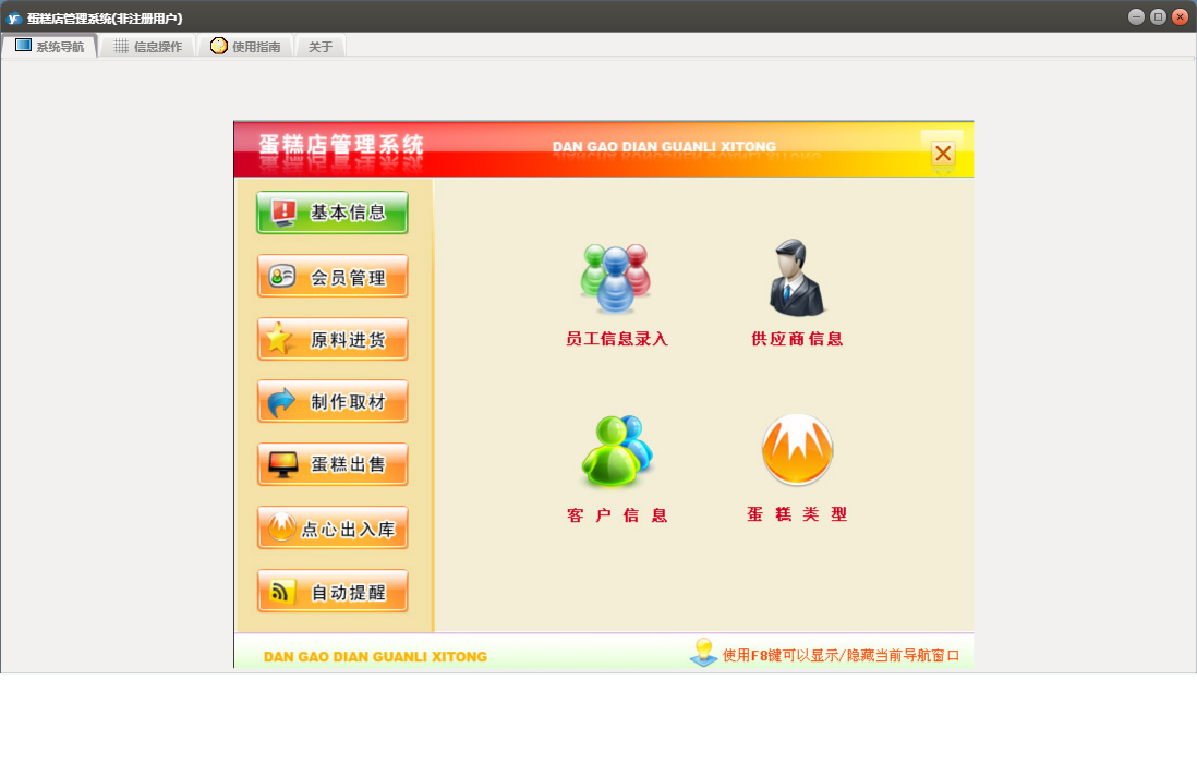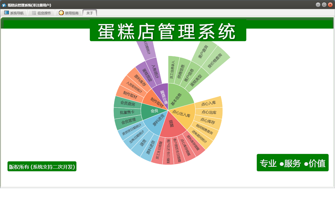 蛋糕店管理系统包含以下功能:蛋糕类型、点心入库、批量售卡、点心出库、蛋糕出售、权限设置、蛋糕预定、退货、点心出入库、员工信息录入、制作取材、关于、基本信息、客户信息、会员管理、供商信息、日志、提醒、原料进货等