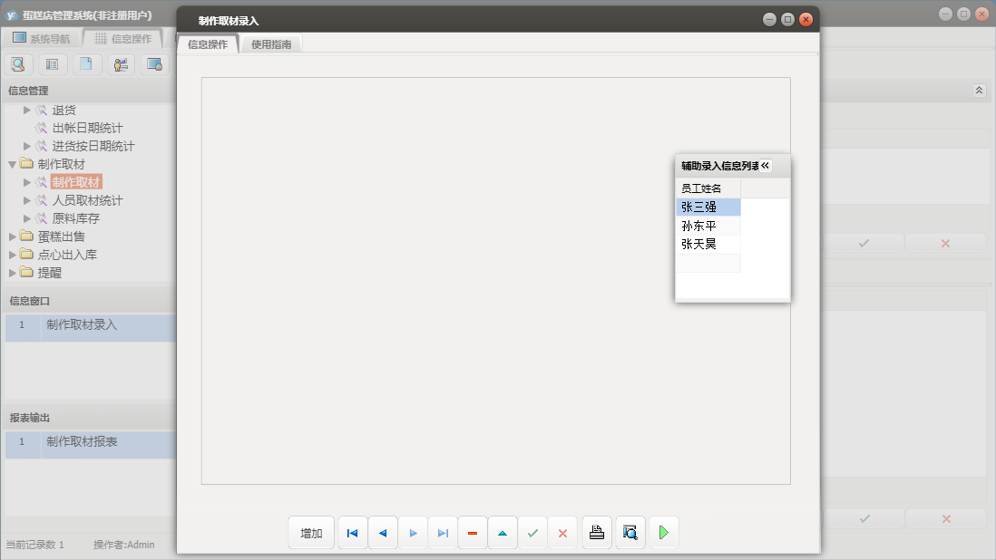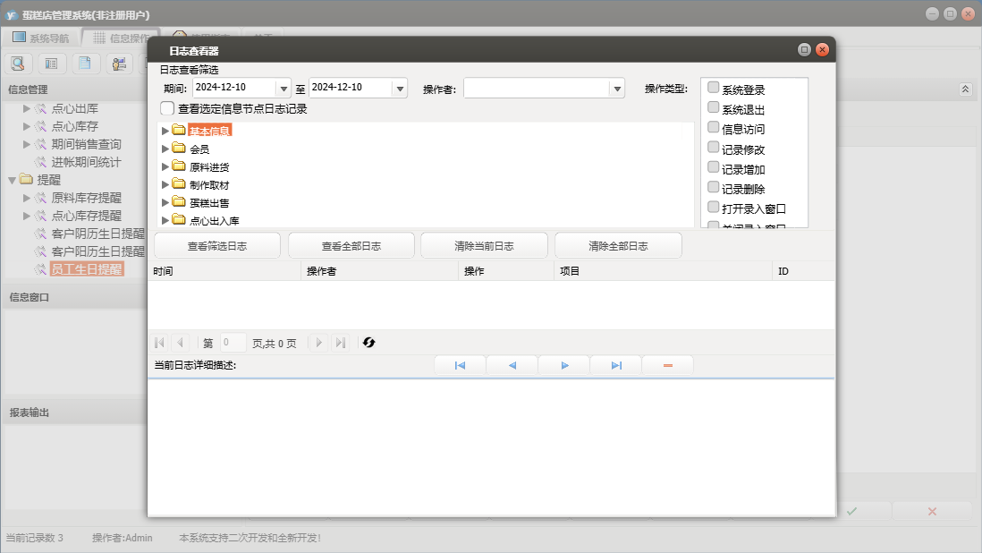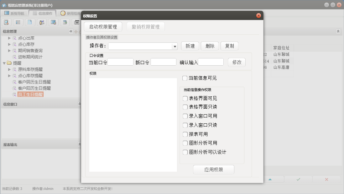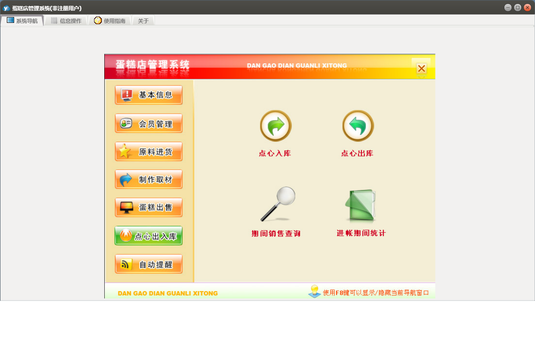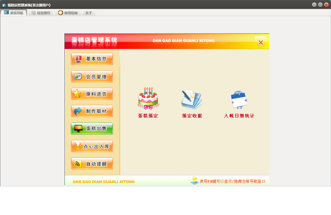 蛋糕店管理系统包含以下功能:蛋糕类型、点心入库、批量售卡、点心出库、蛋糕出售、权限设置、蛋糕预定、退货、点心出入库、员工信息录入、制作取材、关于、基本信息、客户信息、会员管理、供商信息、日志、提醒、原料进货等