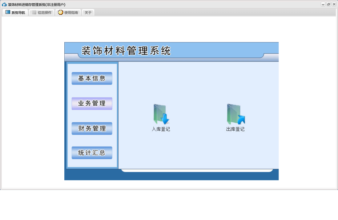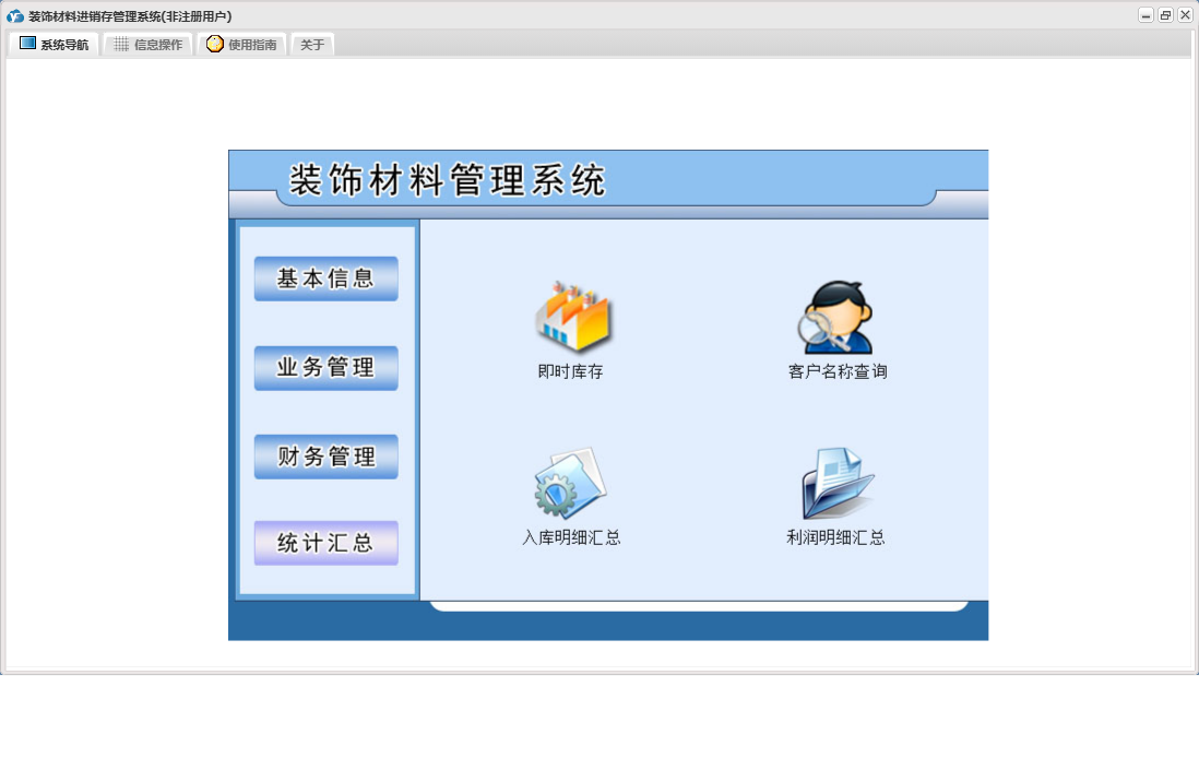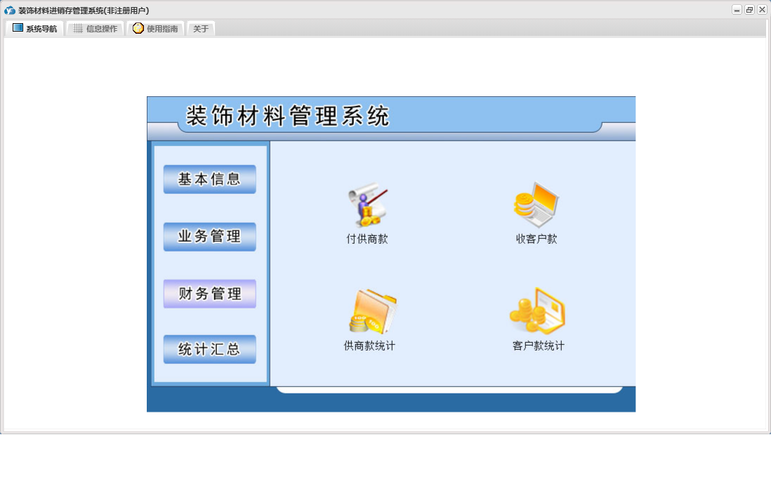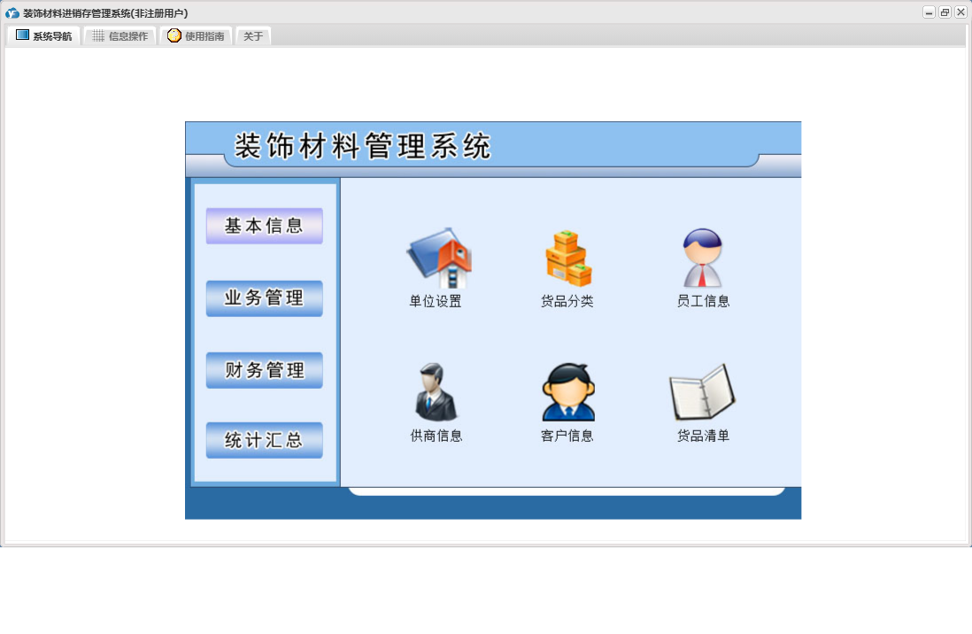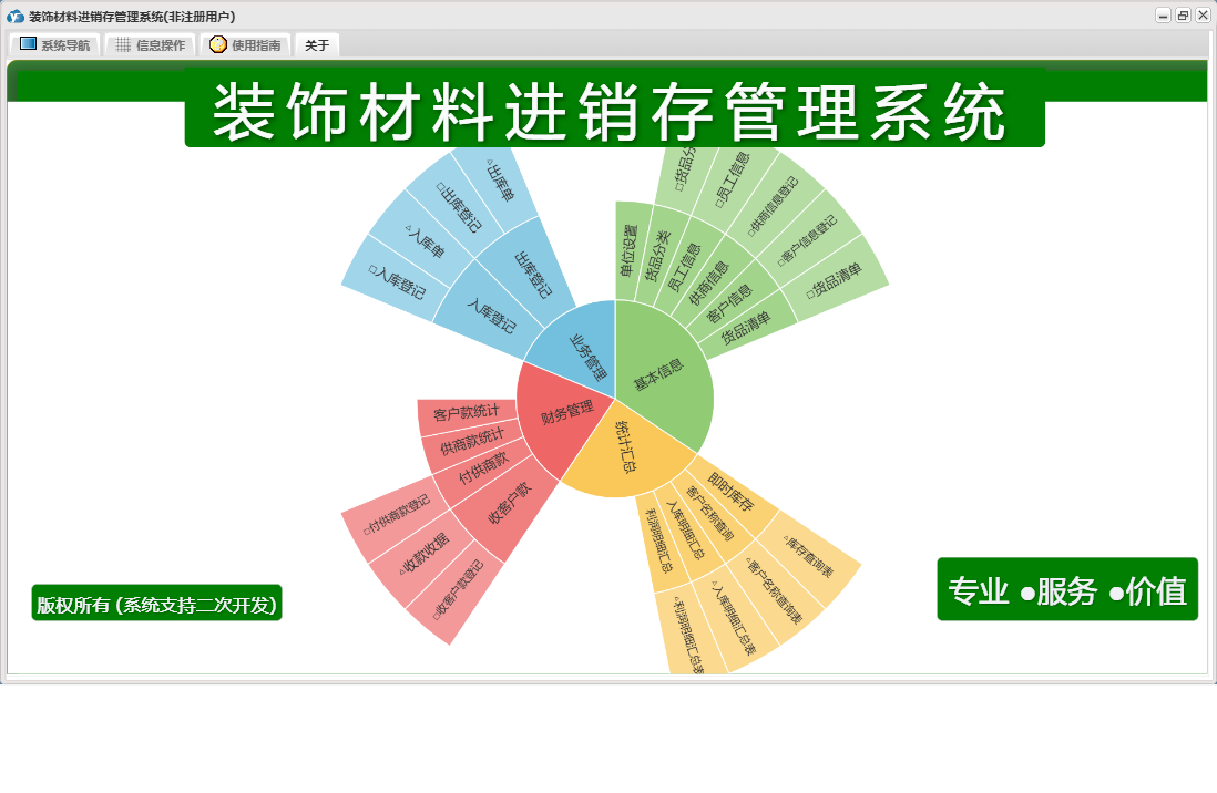 装饰材料进销存管理系统包含以下功能:日志、关于、基本信息、权限设置、统计汇总、财务管理、业务管理等