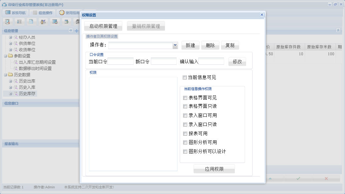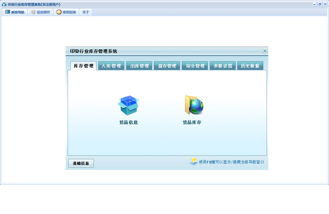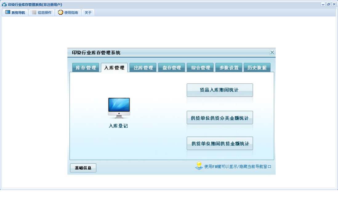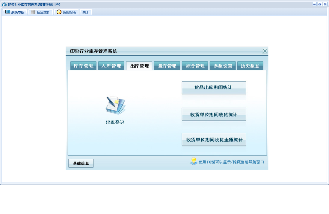 印染行业库存管理系统包含以下功能:货品信息、出库登记、入库登记、历史数据、收货单位、权限设置、仓库信息、出库管理、经办人员、库存管理、盘存管理、关于、入库管理、基础信息、供货单位、综合管理、日志、盘存录入、参数设置等