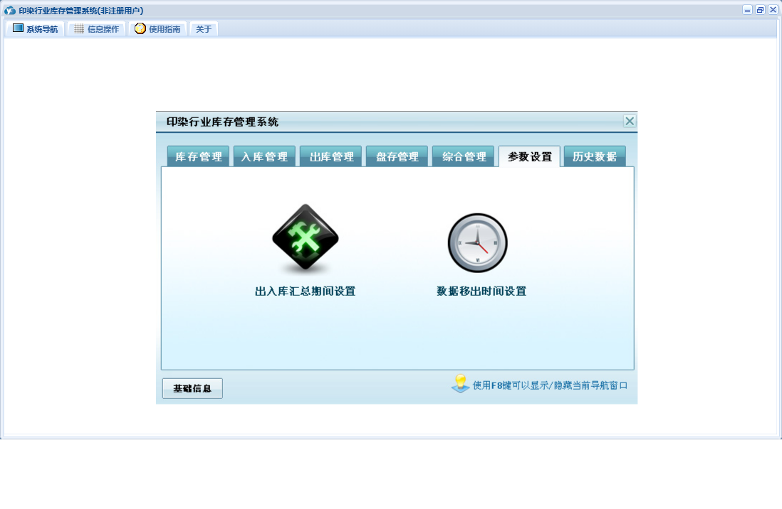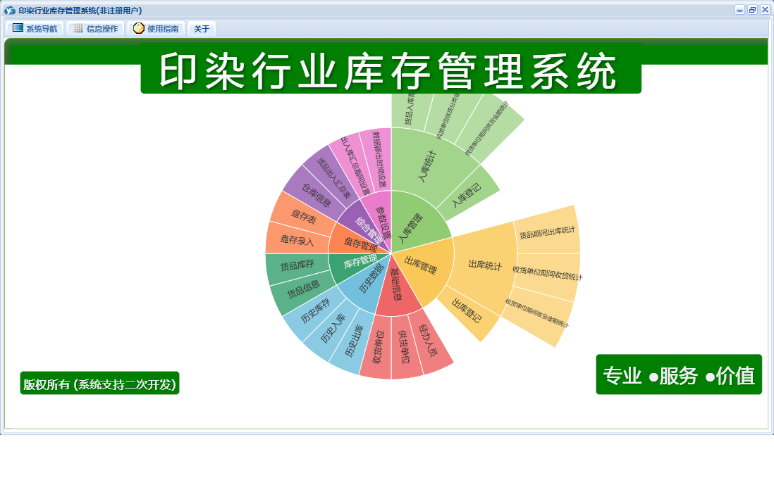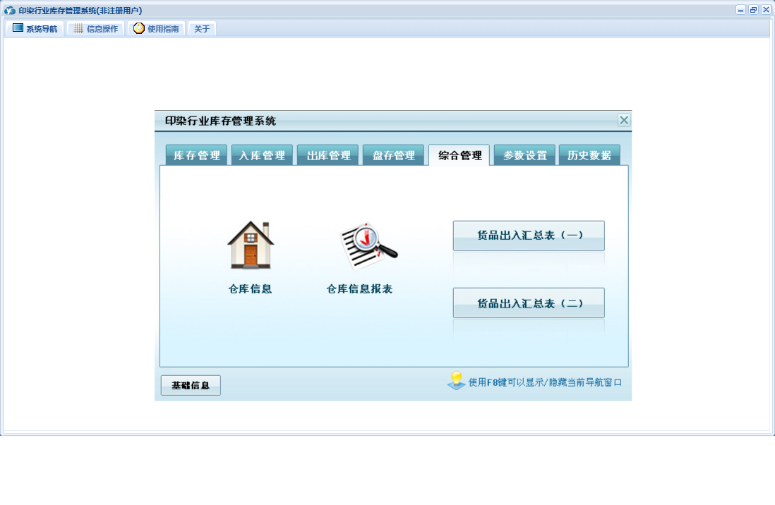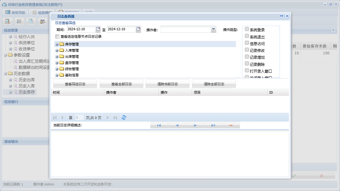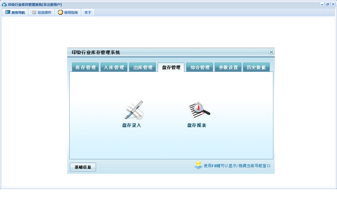 印染行业库存管理系统包含以下功能:货品信息、出库登记、入库登记、历史数据、收货单位、权限设置、仓库信息、出库管理、经办人员、库存管理、盘存管理、关于、入库管理、基础信息、供货单位、综合管理、日志、盘存录入、参数设置等