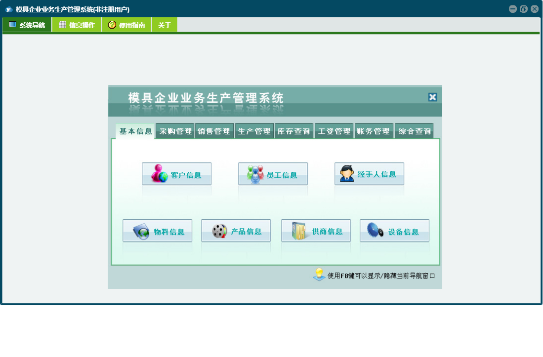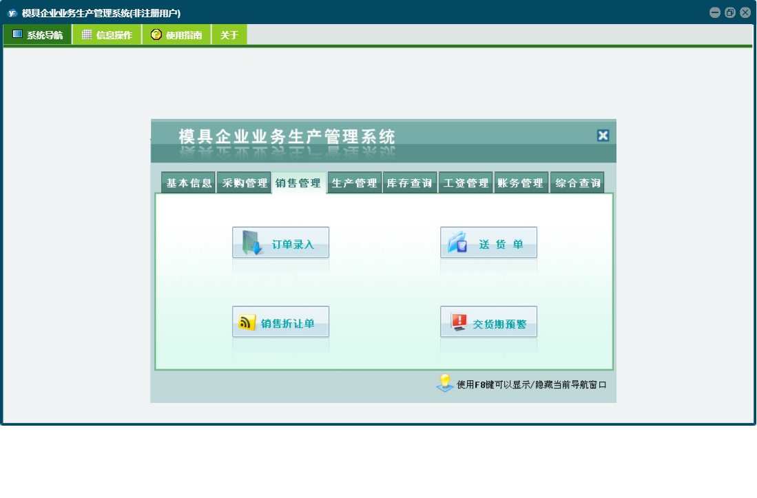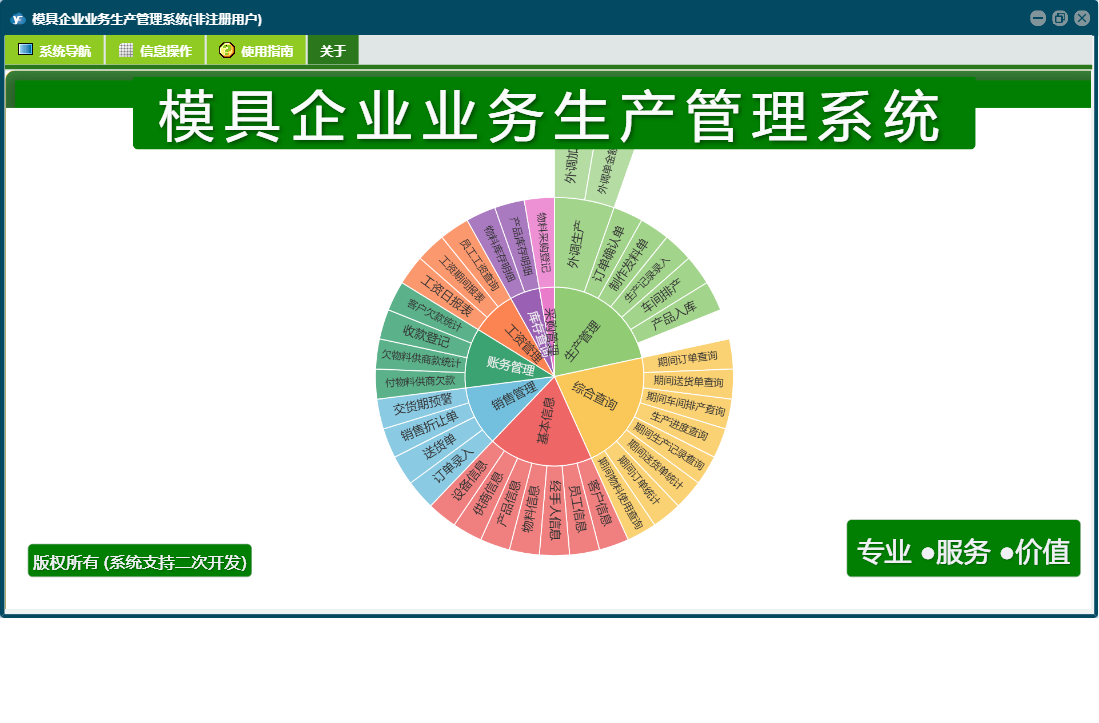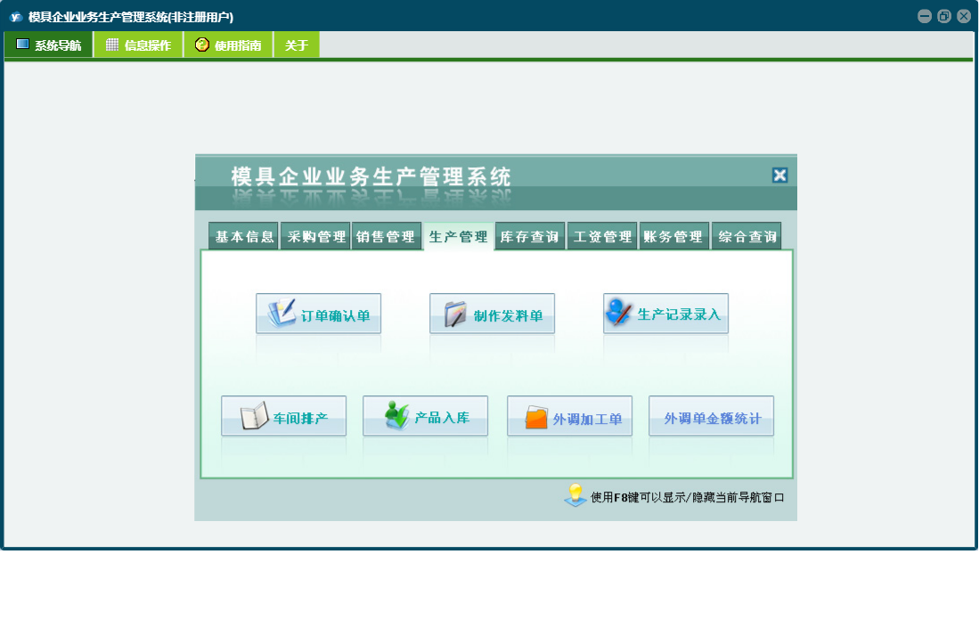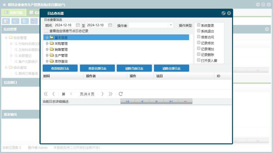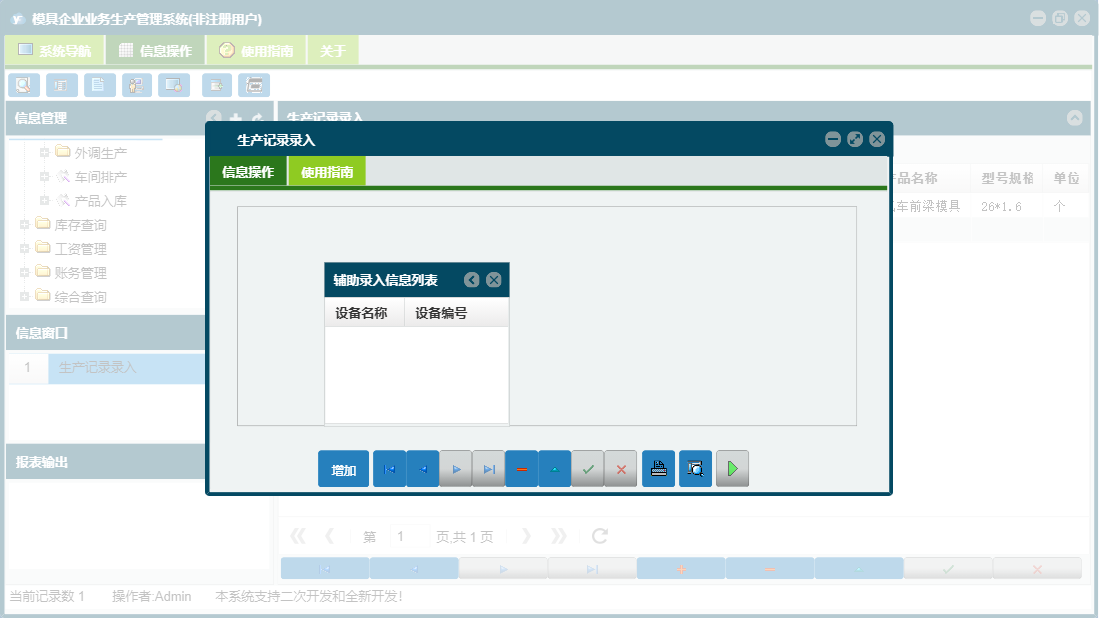 模具企业业务生产管理系统包含以下功能:销售管理、送货单、订单确认单、产品信息、生产记录录入、物料信息、综合查询、付物料供商欠款、经手人信息、权限设置、收款登记、工资管理、设备信息、库存管理、关于、基本信息、订单录入、客户信息、账务管理、外调加工单、销售折让单、员工信息、产品入库、日志、采购管理、制作发料单、物料采购登记、车间排产、生产管理、供商信息等