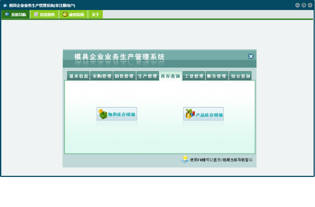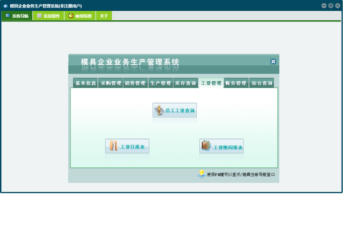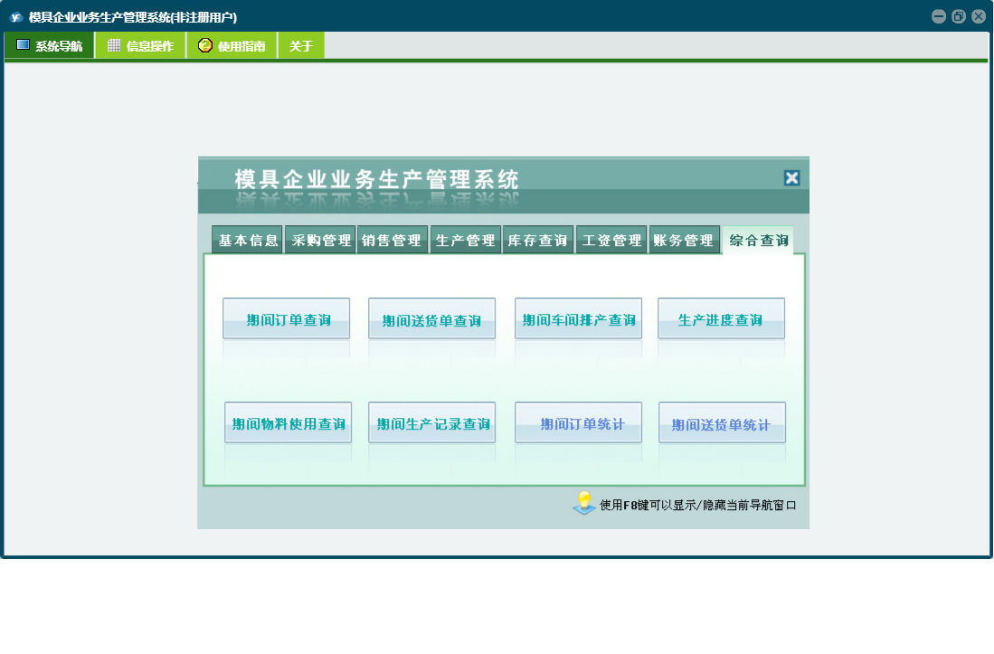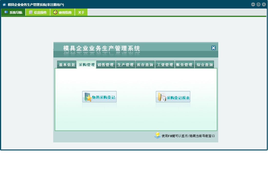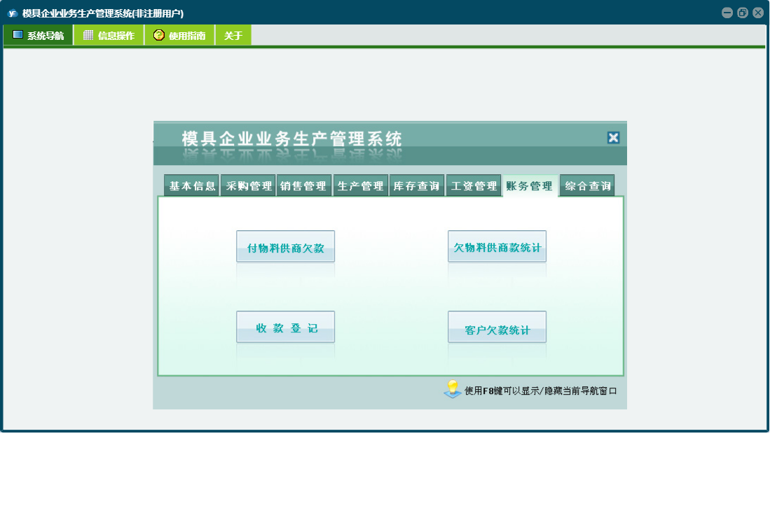 模具企业业务生产管理系统包含以下功能:销售管理、送货单、订单确认单、产品信息、生产记录录入、物料信息、综合查询、付物料供商欠款、经手人信息、权限设置、收款登记、工资管理、设备信息、库存管理、关于、基本信息、订单录入、客户信息、账务管理、外调加工单、销售折让单、员工信息、产品入库、日志、采购管理、制作发料单、物料采购登记、车间排产、生产管理、供商信息等
