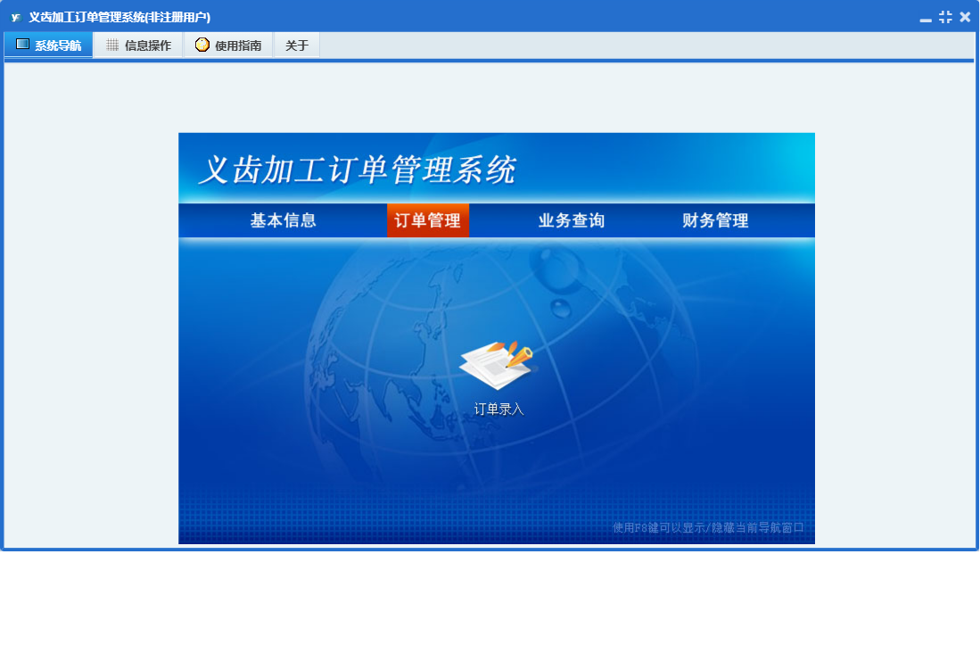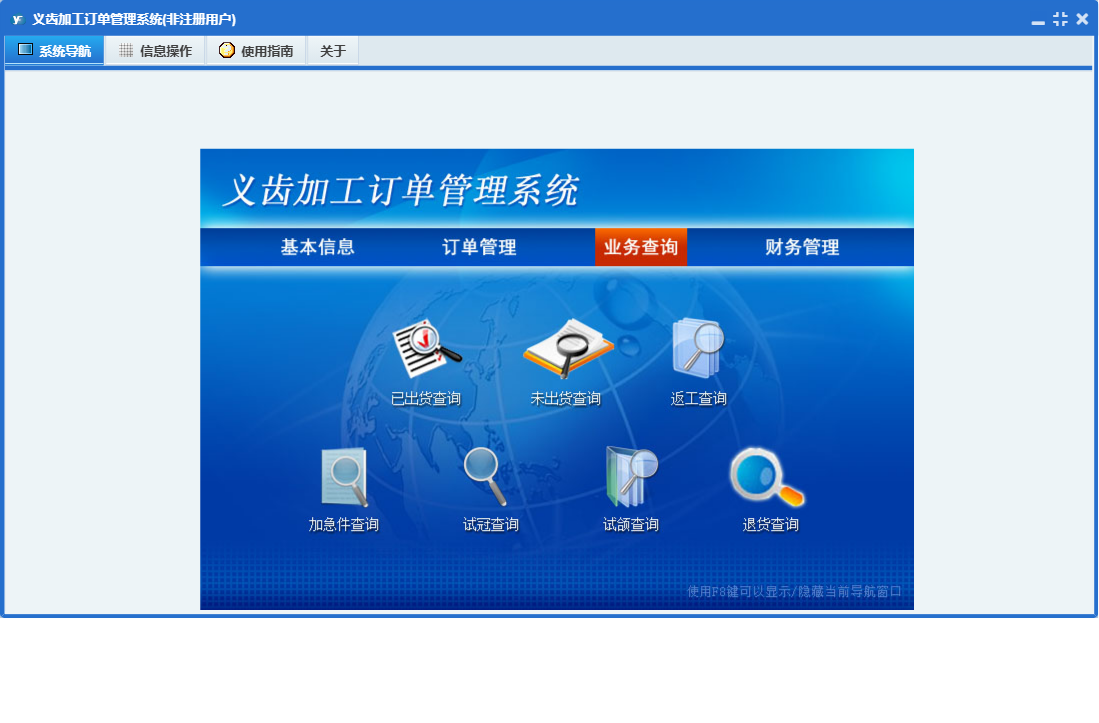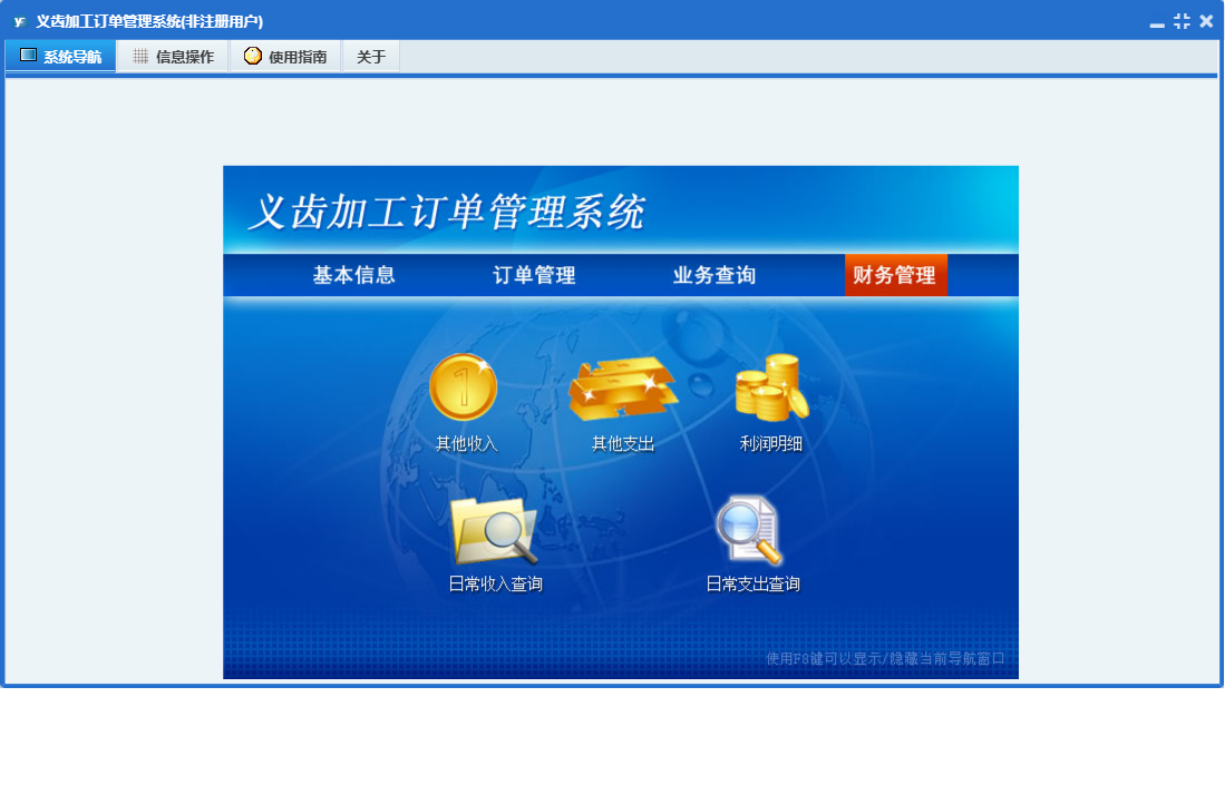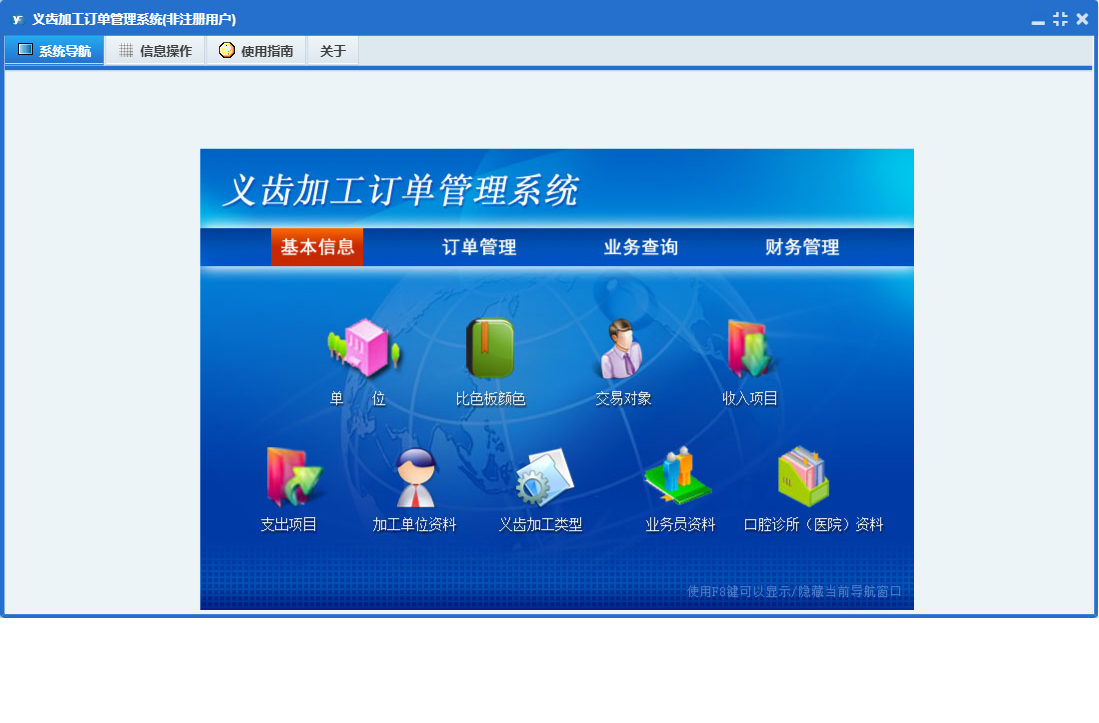 义齿加工订单管理系统包含以下功能:其他收入、财务管理、口腔诊所(或医院)资料、其他支出、收入项目、业务员资料、权限设置、交易对象、支出项目、订单管理、关于、基本信息、比色板颜色、订单录入、义齿加工类型、加工单位资料、日志、业务查询、单位等