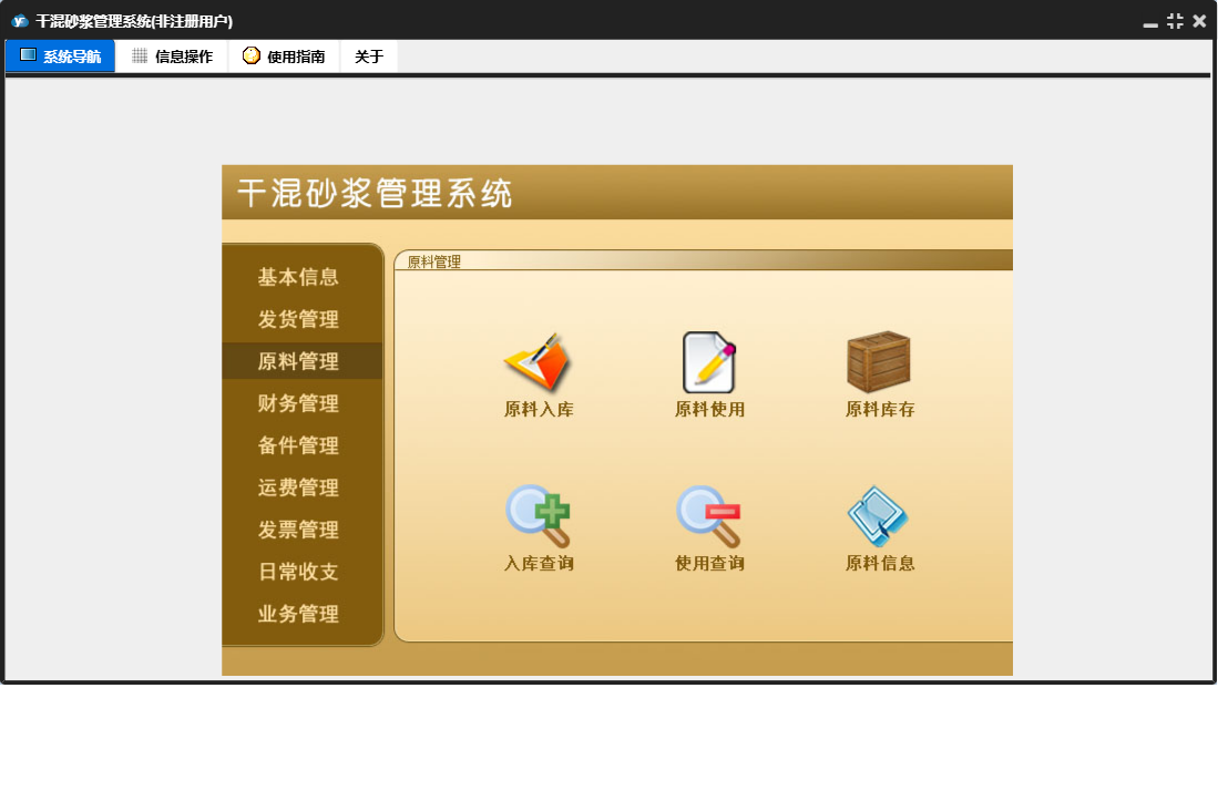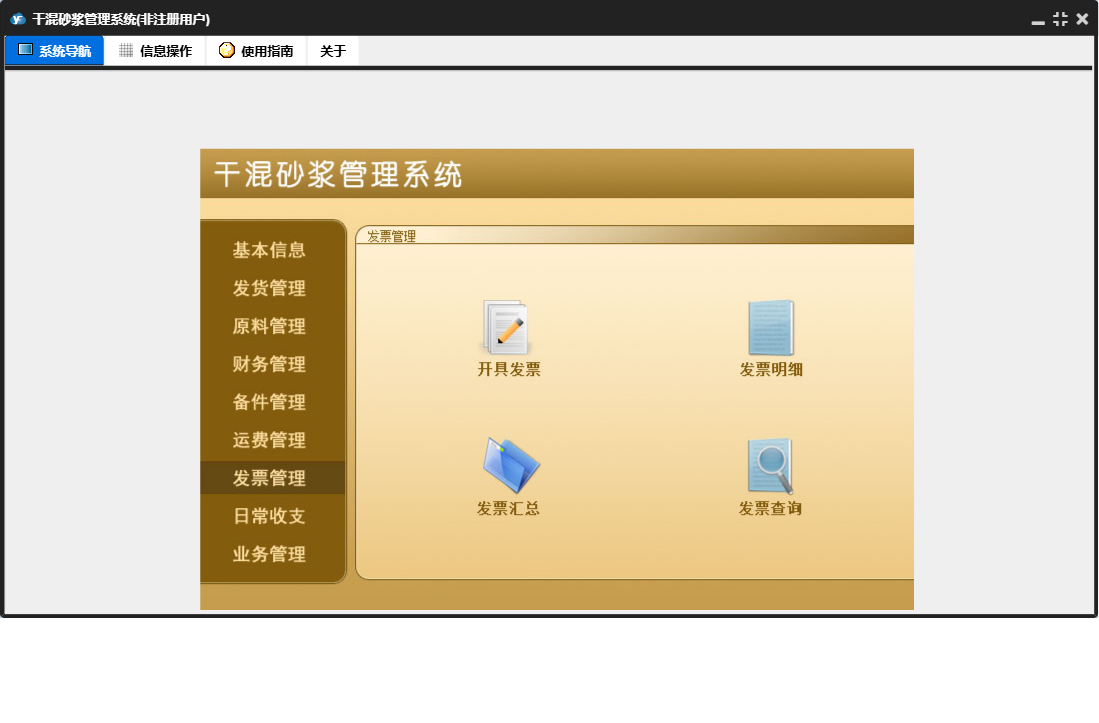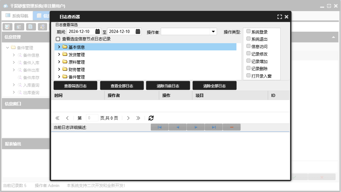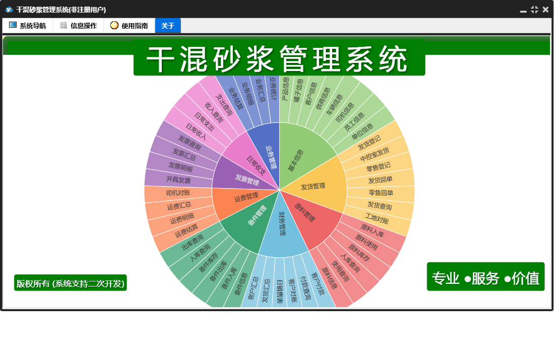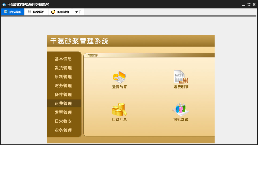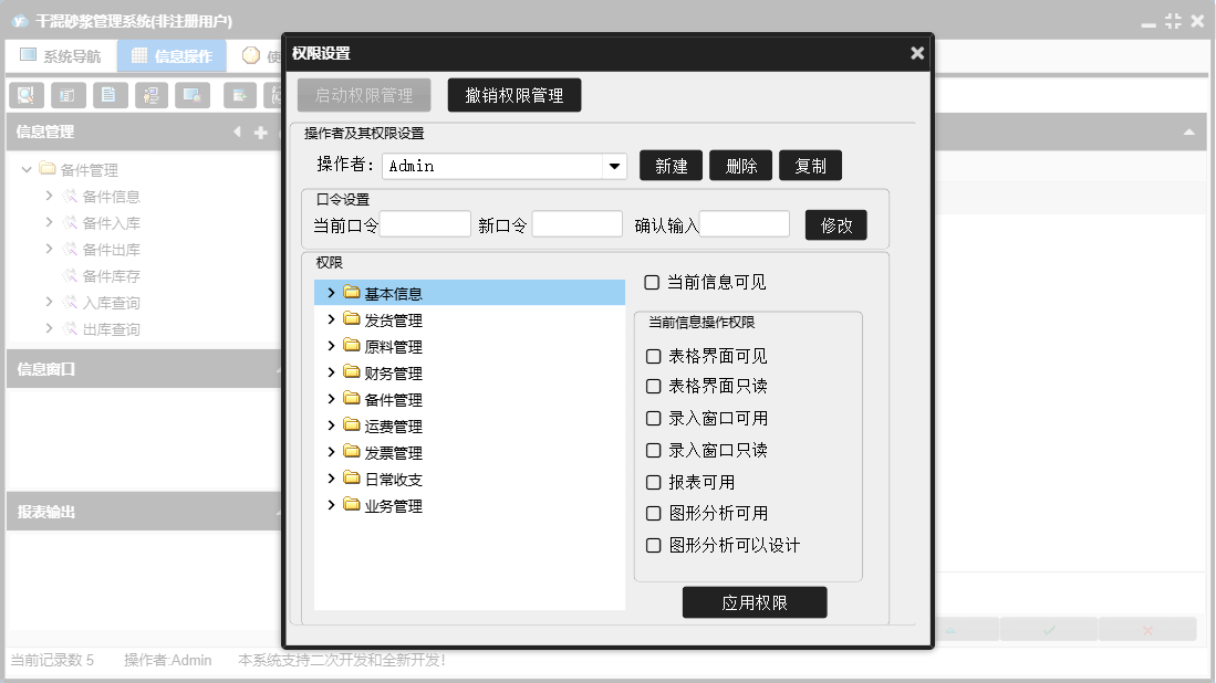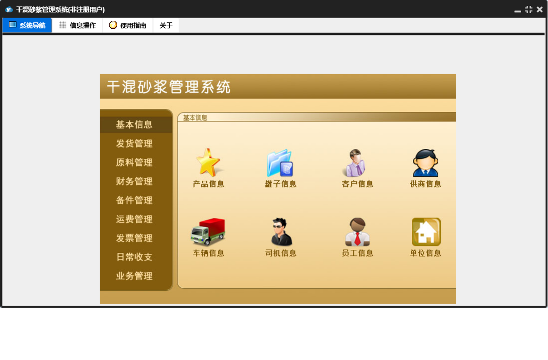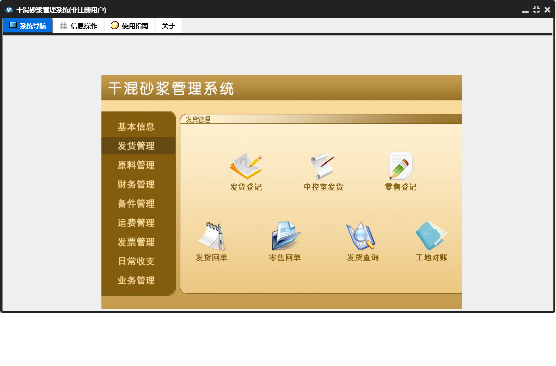 干混砂浆管理系统包含以下功能:运费结算、发票管理、日常支出、备件信息、原料入库、产品信息、发货登记、备件出库、财务管理、开具发票、中控室发货、原料使用、权限设置、业务结算、原料管理、运费管理、原料信息、零售登记、日常收支、关于、基本信息、罐子信息、日常收入、备件管理、客户信息、发货管理、车辆信息、业务管理、客户付款、司机信息、员工信息、日志、备件入库、供商信息等