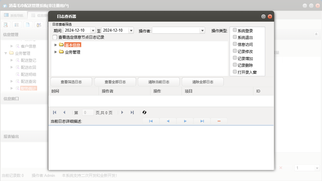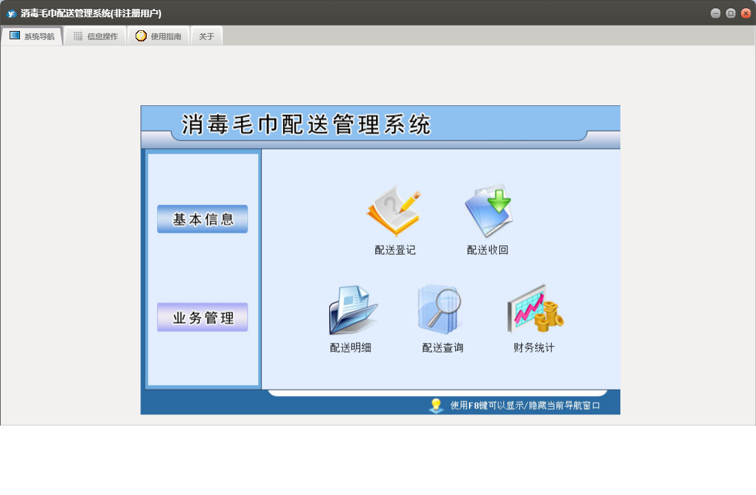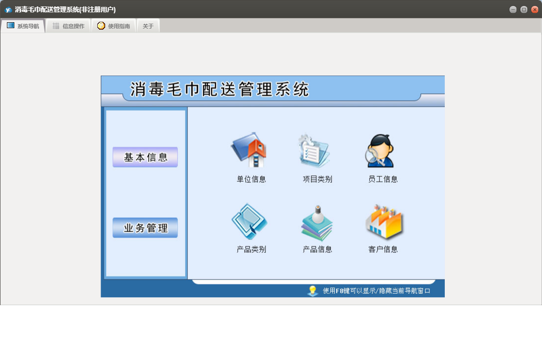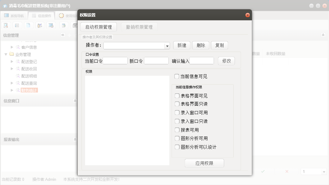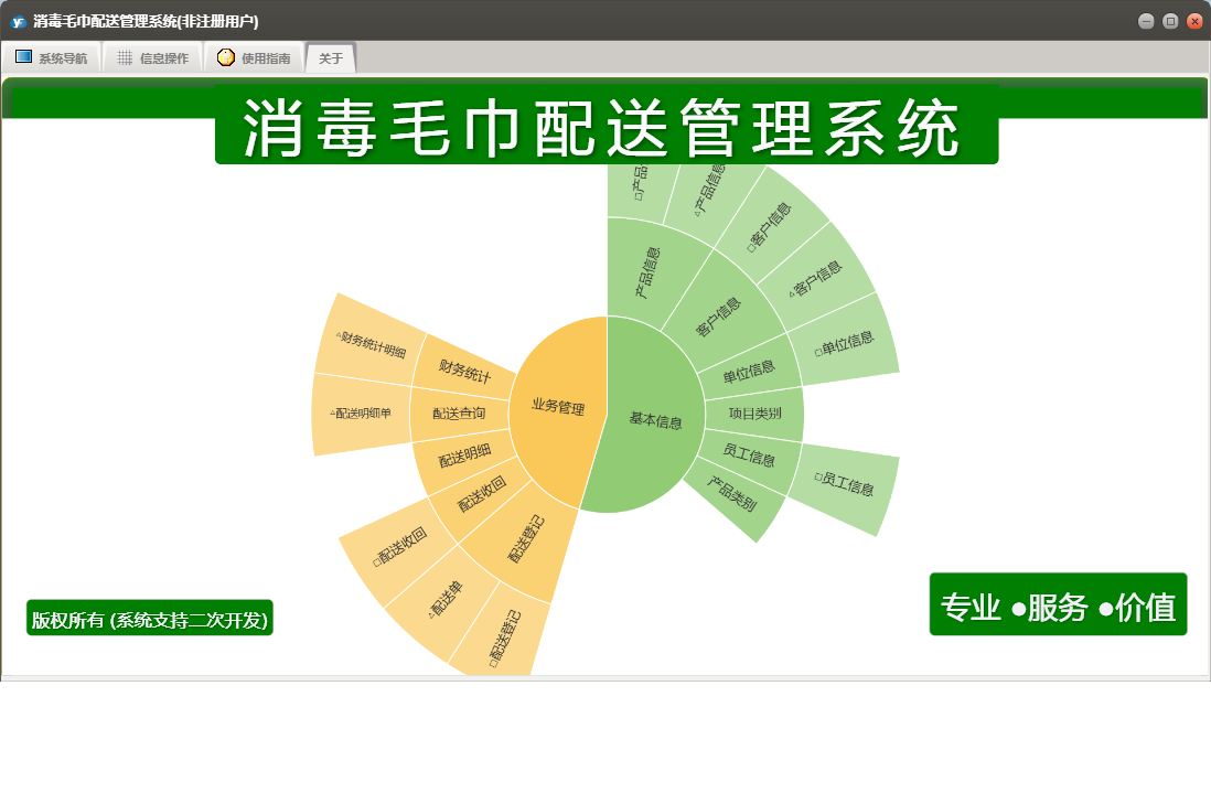 消毒毛巾配送管理系统包含以下功能:单位信息、配送收回、配送登记、员工信息、日志、关于、产品信息、权限设置、基本信息、客户信息、业务管理等