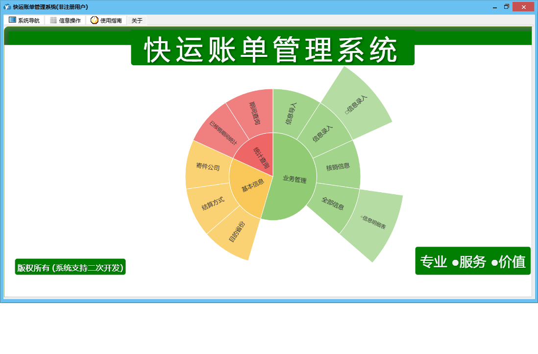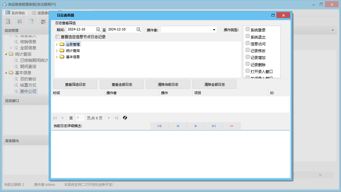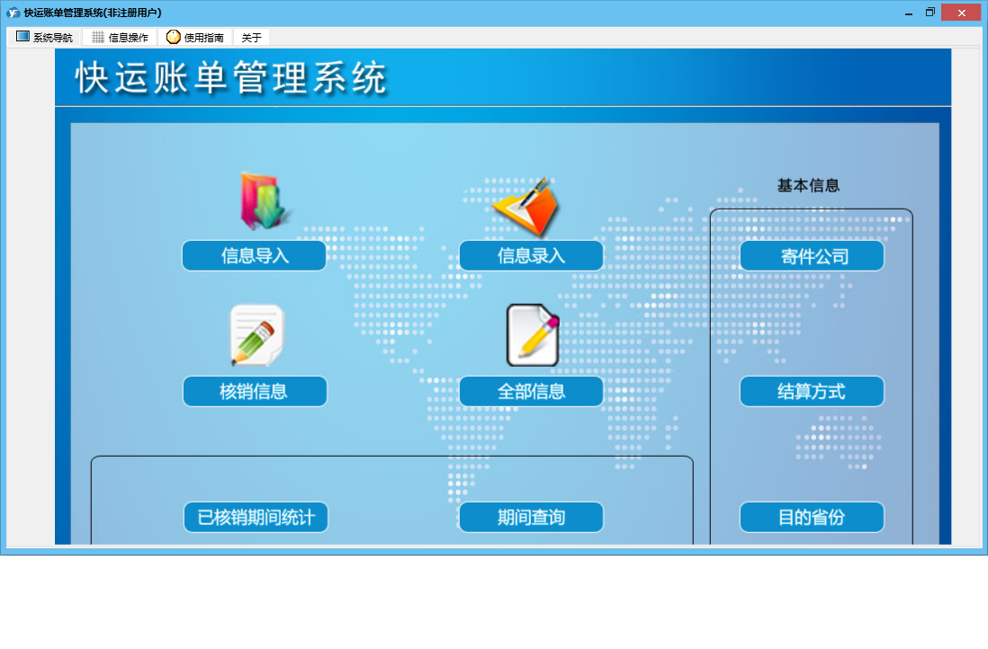 快运账单管理系统包含以下功能:信息录入、面板、日志、关于、权限设置等