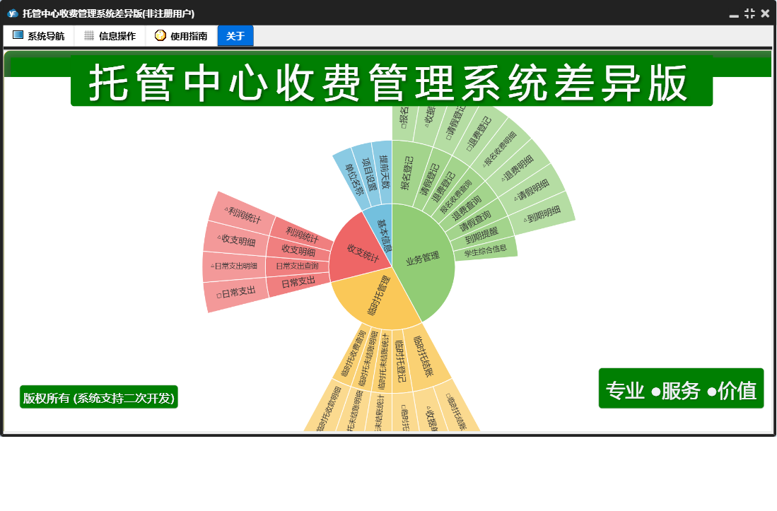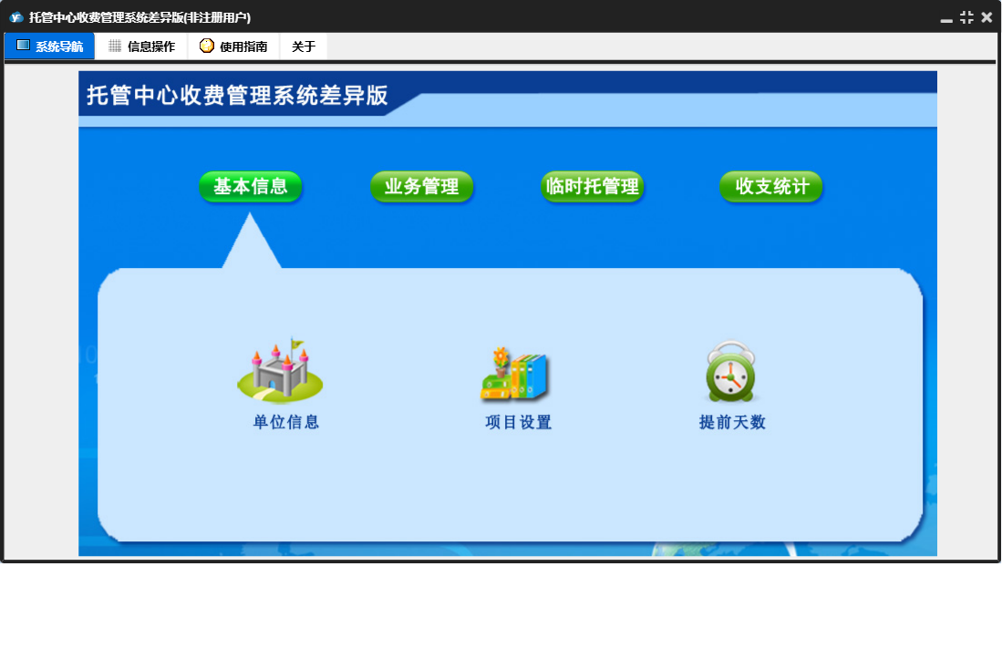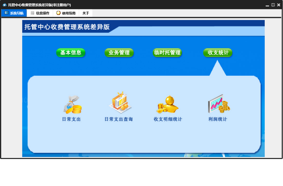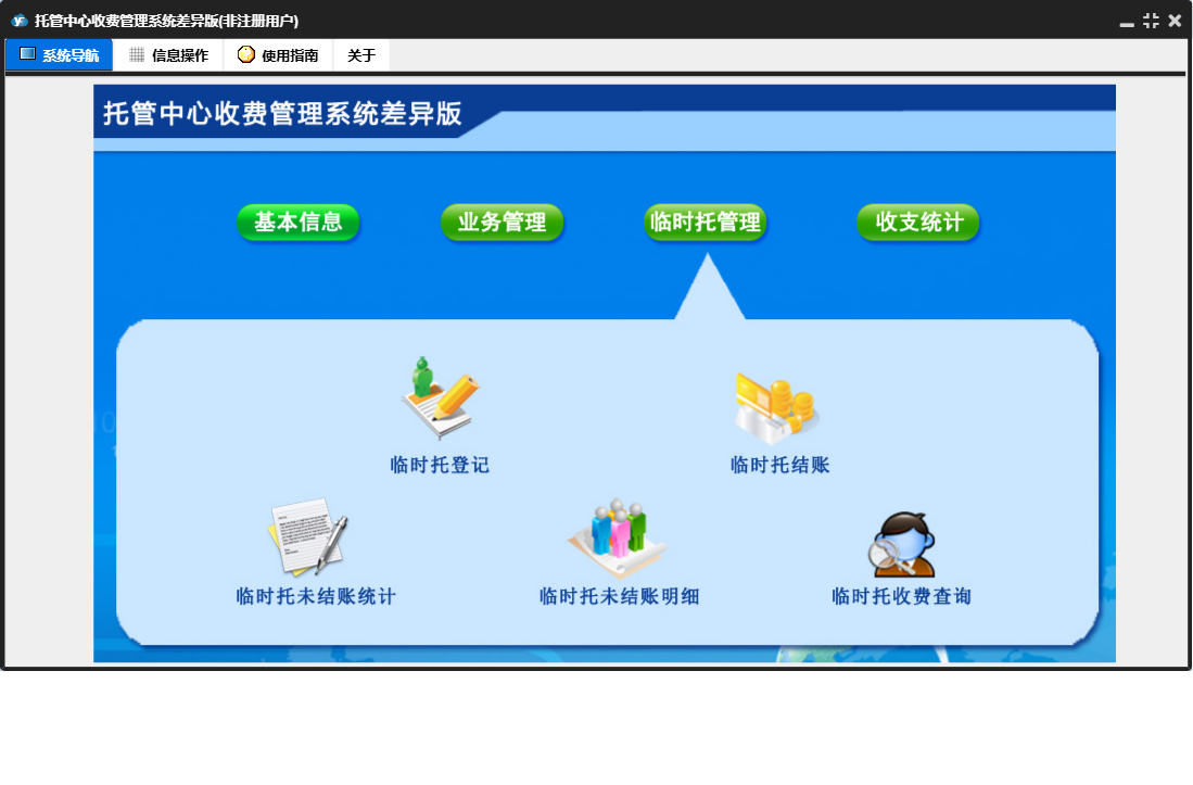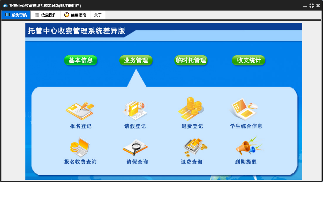 托管中心收费管理系统差异版包含以下功能:收支统计、报名登记、临时托登记、日常支出、临时托管理、日志、退费登记、关于、基本信息、权限设置、临时托结账、业务管理、请假登记等