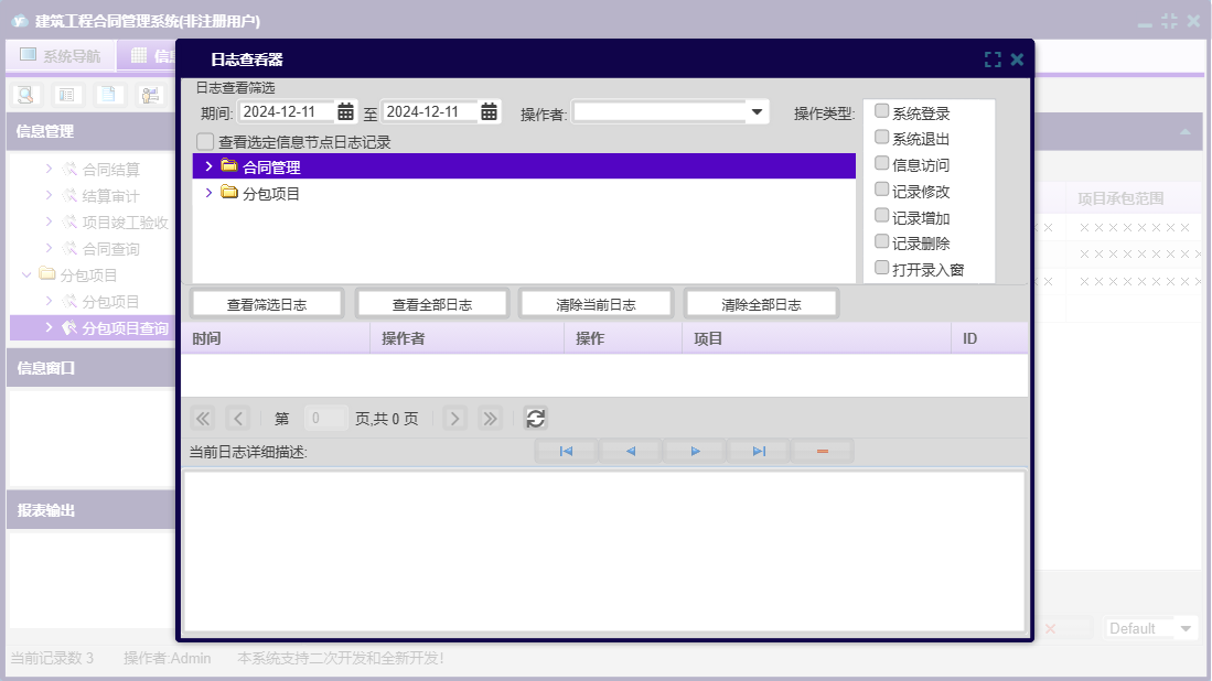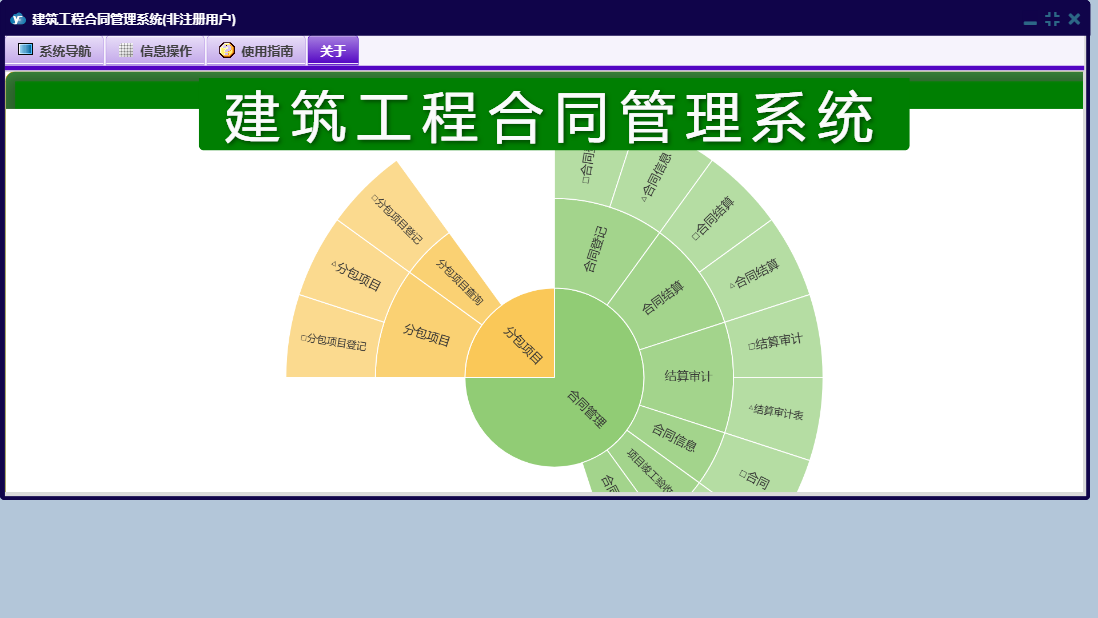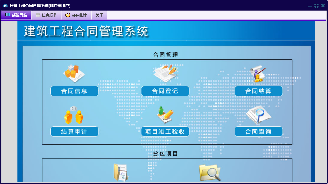 建筑工程合同管理系统包含以下功能:结算审计、面板、分包项目查询、日志、关于、合同结算、权限设置、合同登记、项目竣工验收、分包项目、合同查询等