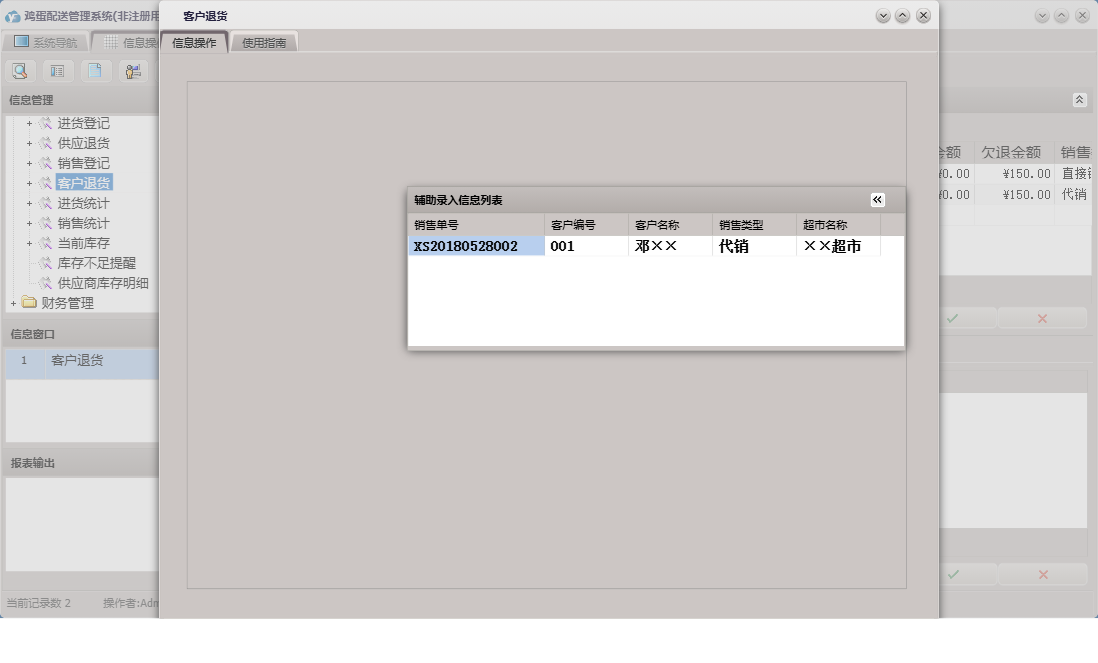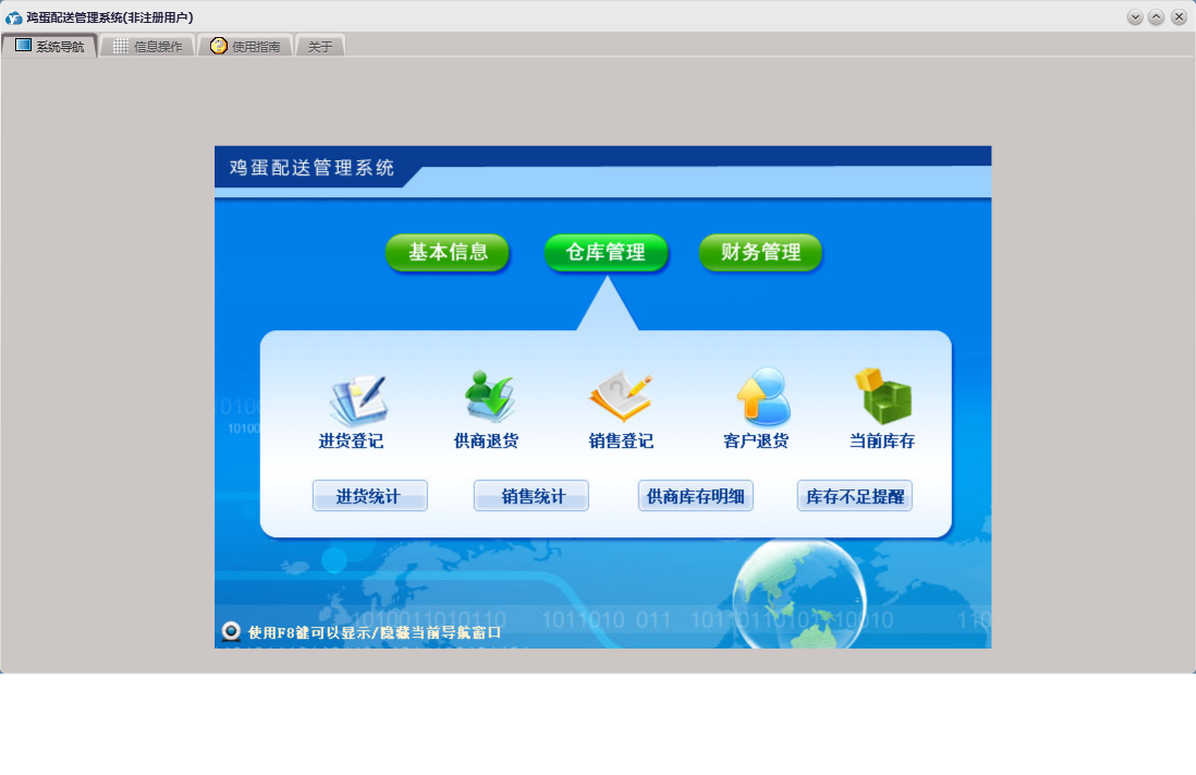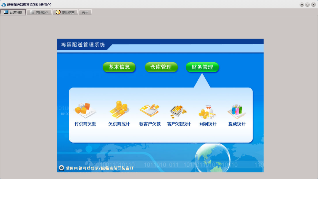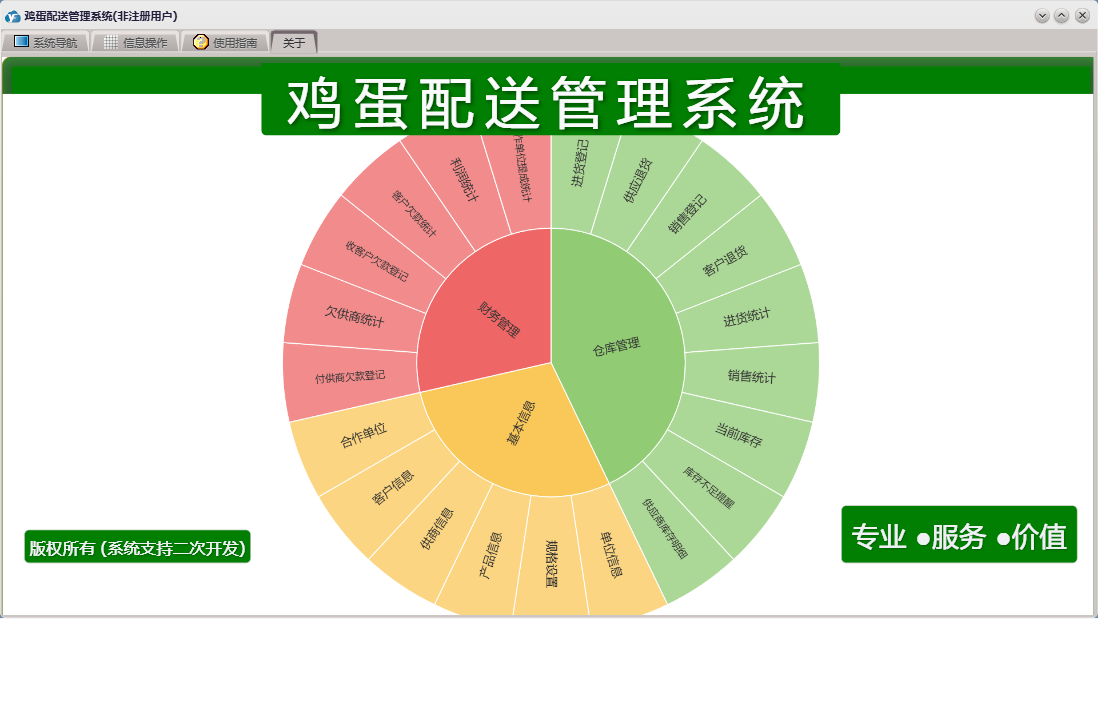 鸡蛋配送管理系统包含以下功能:付供商欠款登记、单位信息、财务管理、供商信息、供应退货、客户退货、日志、仓库管理、关于、销售登记、基本信息、权限设置、产品信息、客户信息、收客户欠款登记、进货登记等