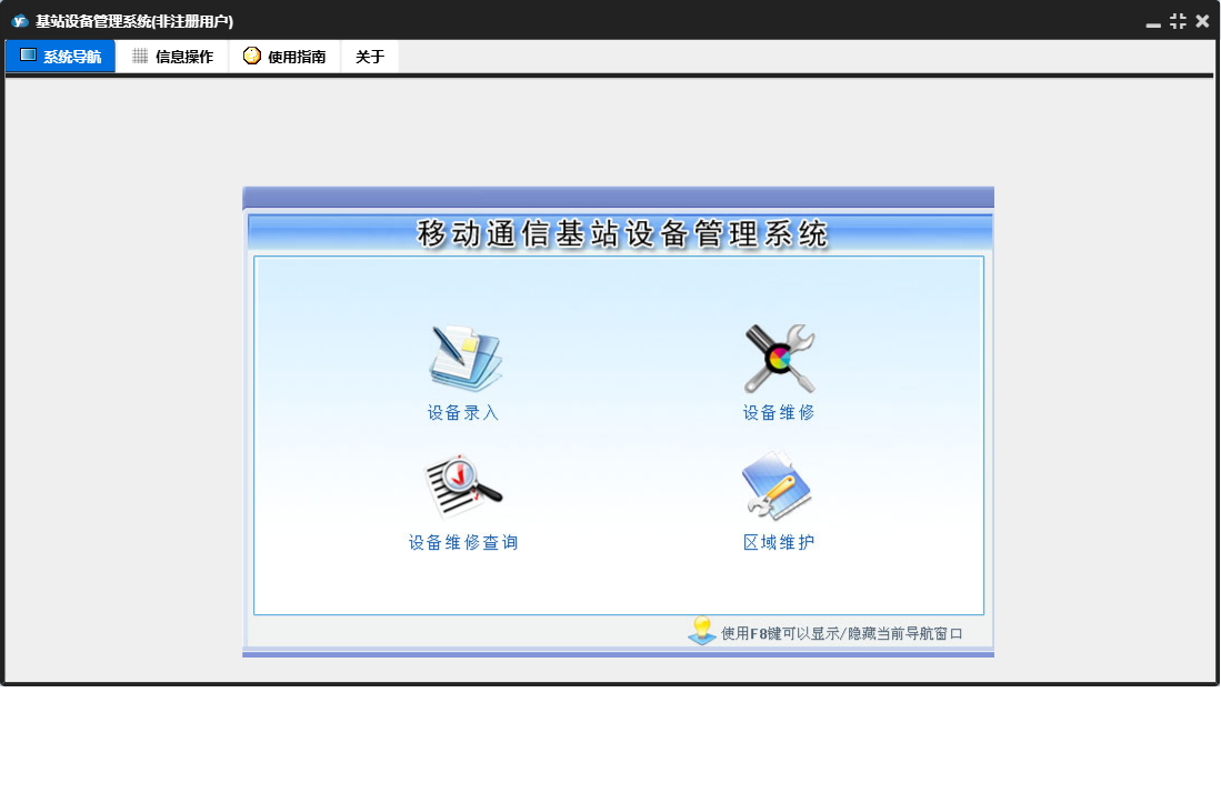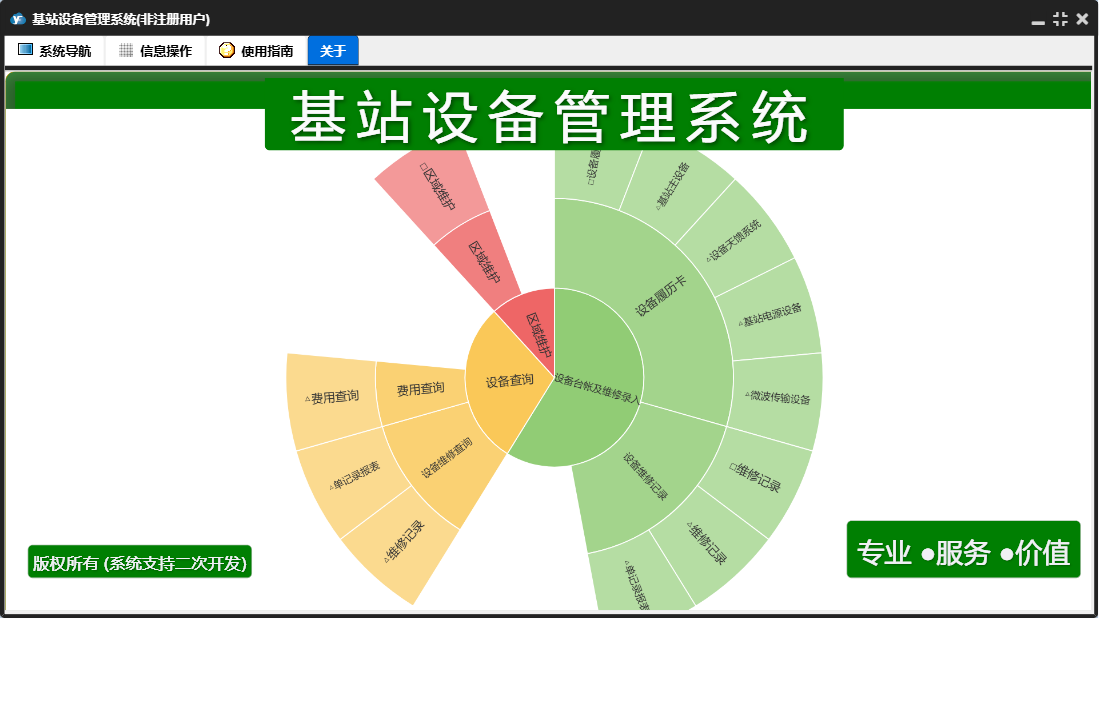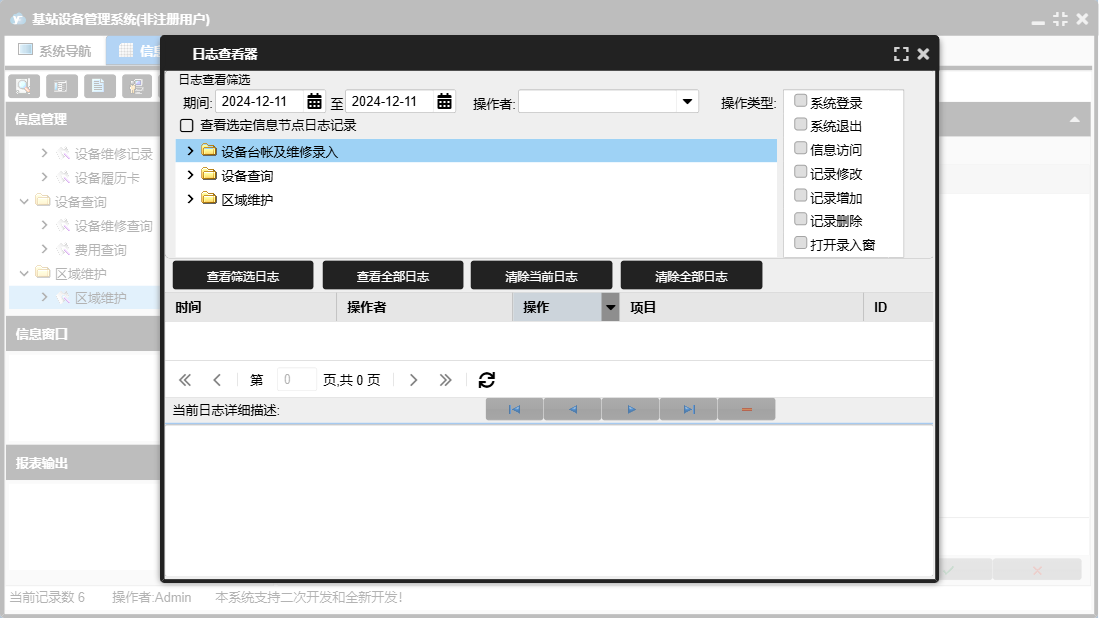 基站设备管理系统包含以下功能:面板、设备维修记录、日志、区域维护、关于、权限设置、设备履历卡等