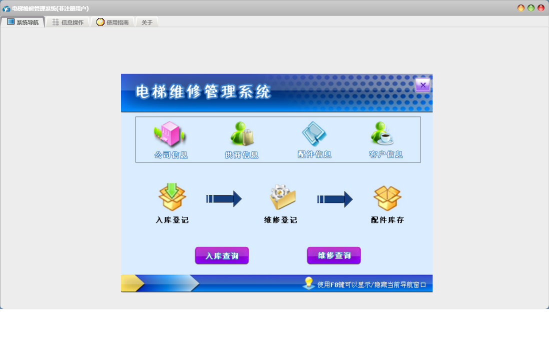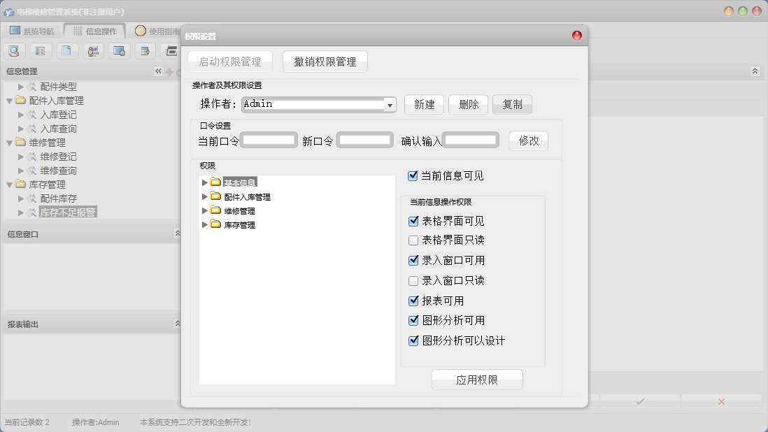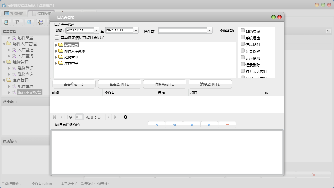 电梯维修管理系统包含以下功能:面板、入库登记、维修登记、公司信息、日志、关于、权限设置、配件类型、客户信息、配件信息、供商信息等