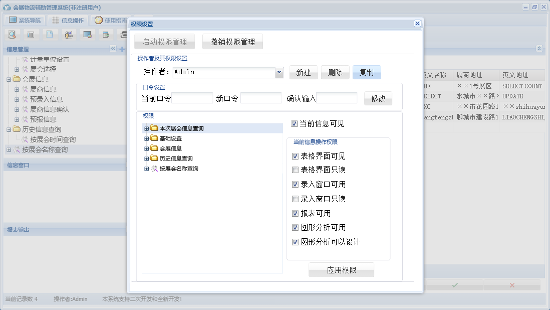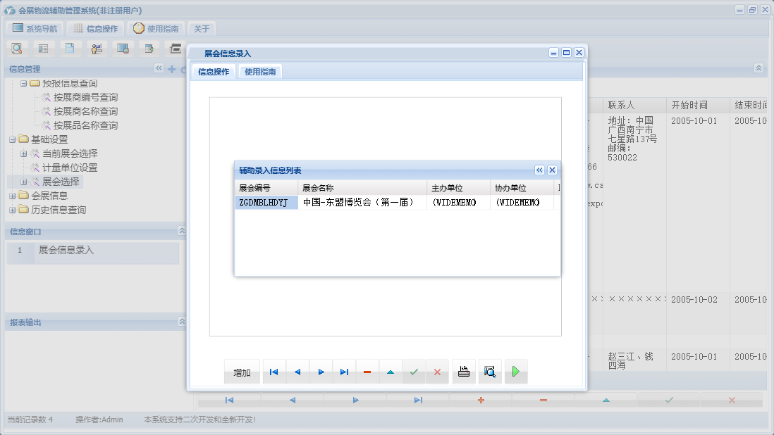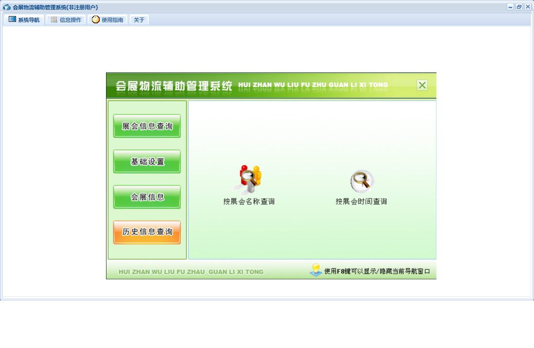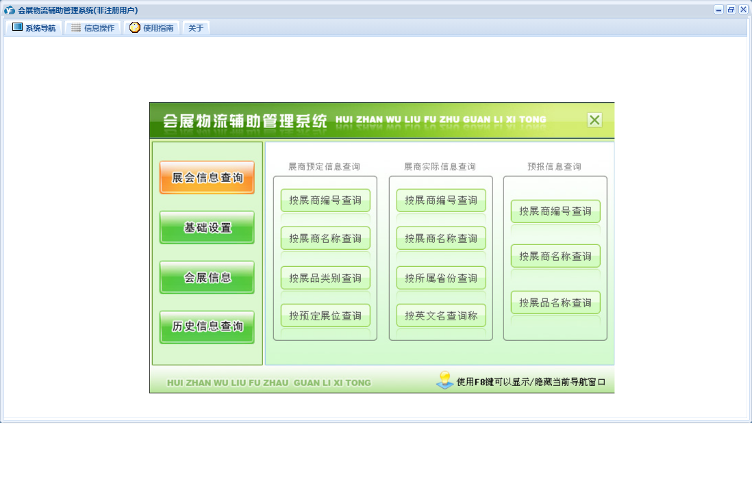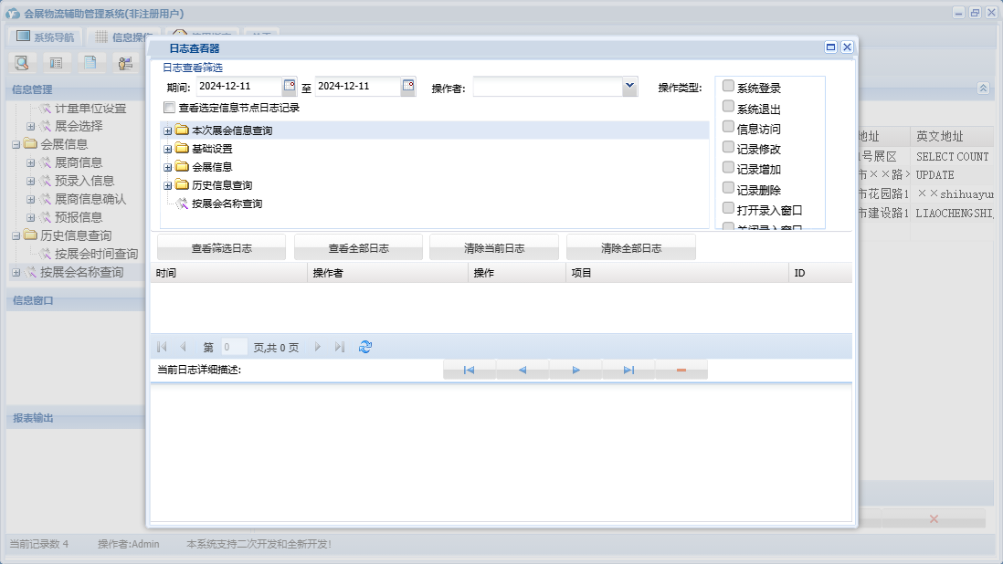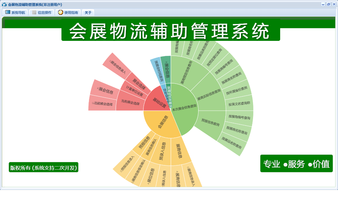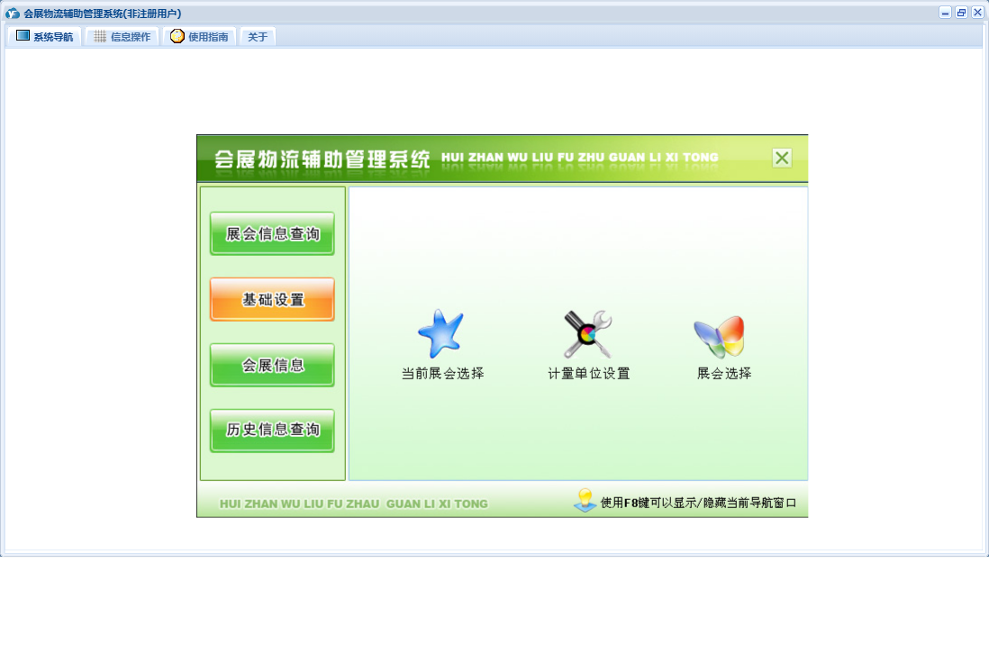 会展物流辅助管理系统包含以下功能:基础设置、会展信息、历史信息查询、展商信息确认、日志、展会信息查询、关于、权限设置、当前展会选择、展会选择等