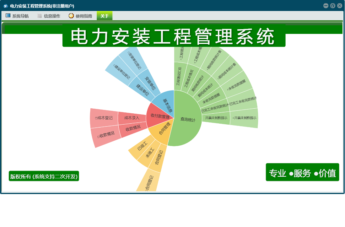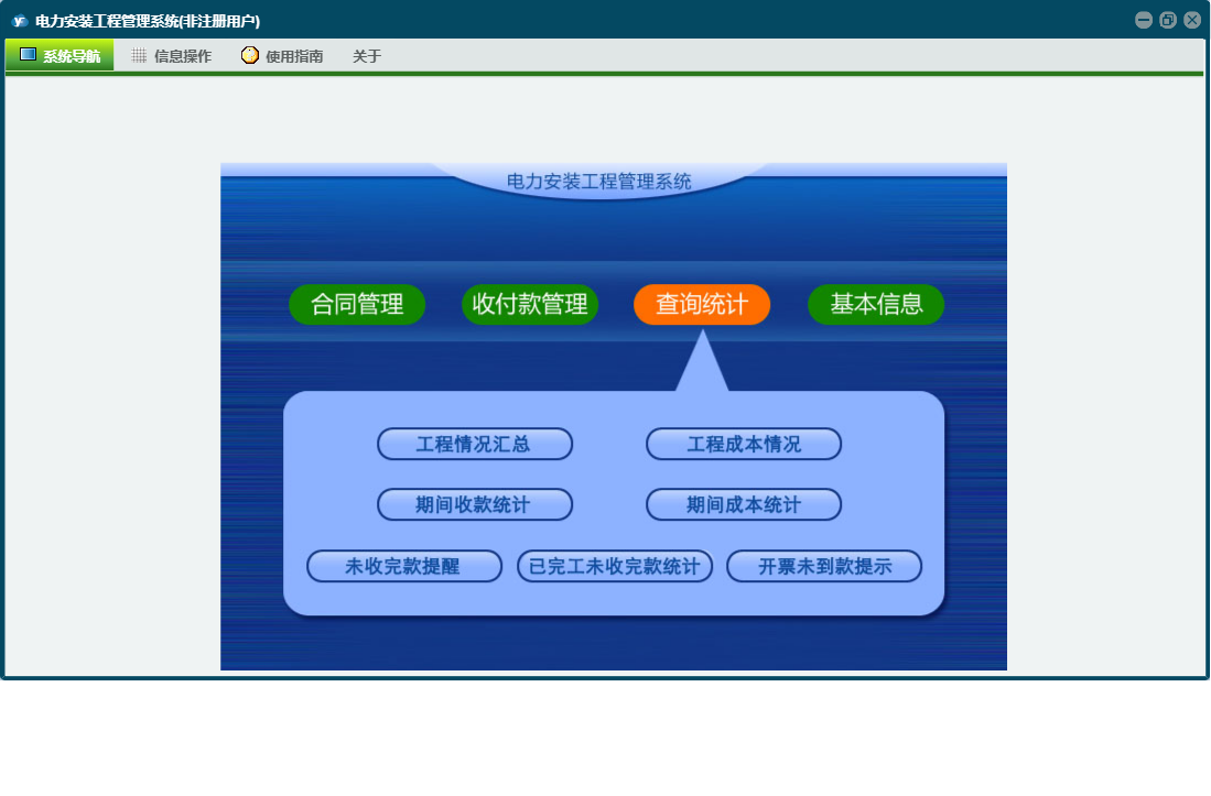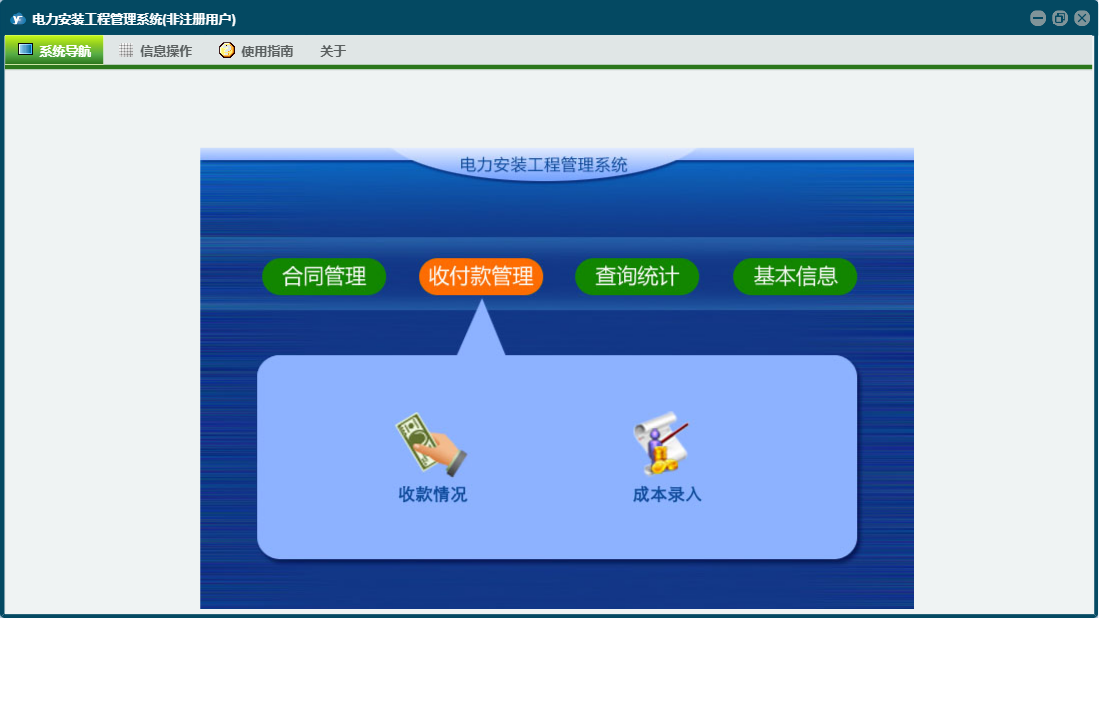 电力安装工程管理系统包含以下功能:收付款管理、查询统计、成本录入、收款情况、关于、基本信息、合同登记、合同管理等