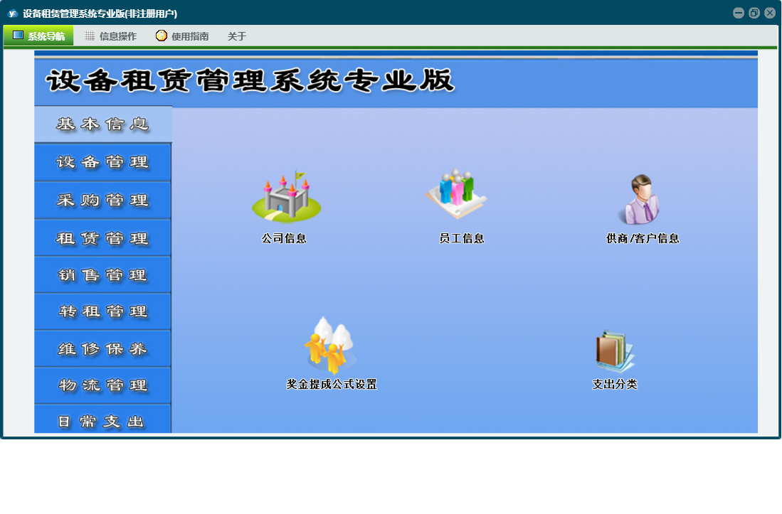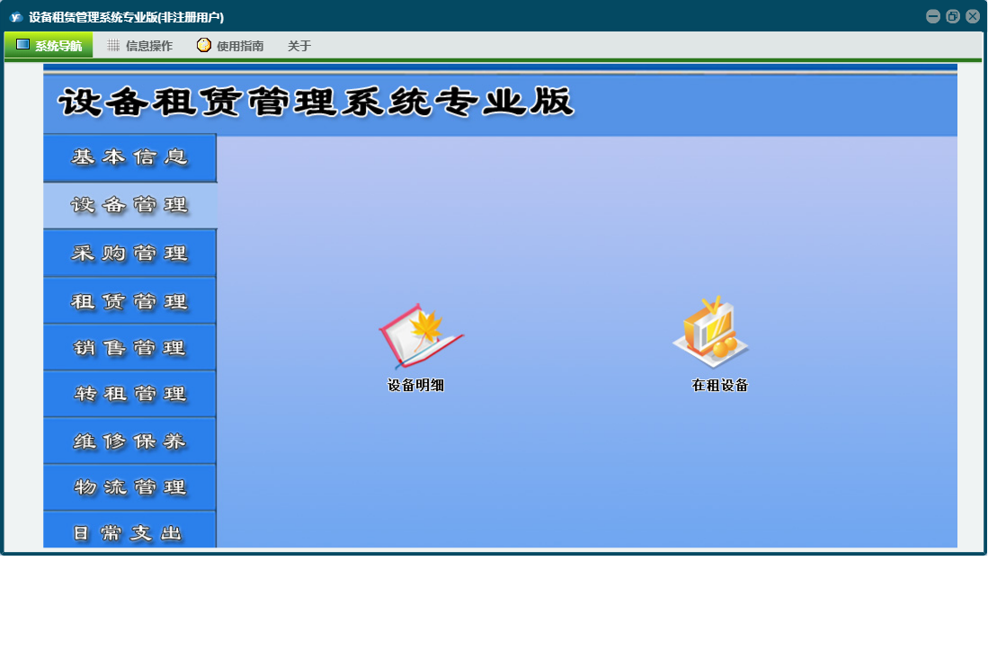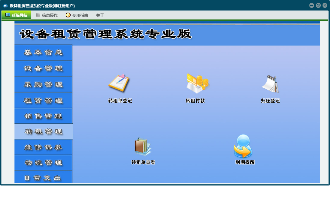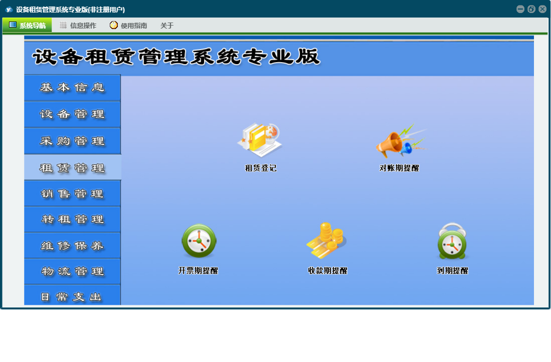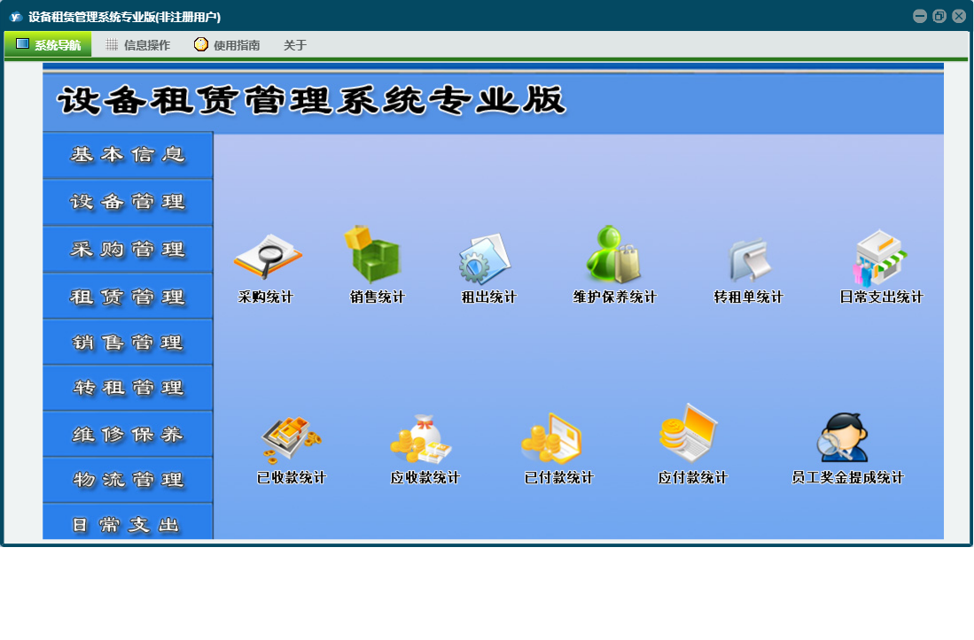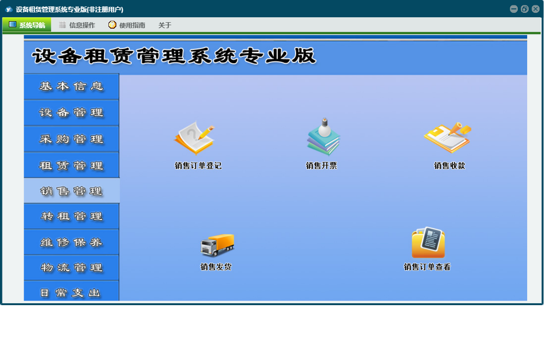设备租赁管理系统专业版包含以下功能:销售管理、查询统计、日常支出、租赁管理、销售订单查看、销售订单登记、归还登记、销售开票、转租管理、权限设置、销售发货、销售收款、关于、基本信息、维护保养、设备管理、物流管理、日志、采购管理等
