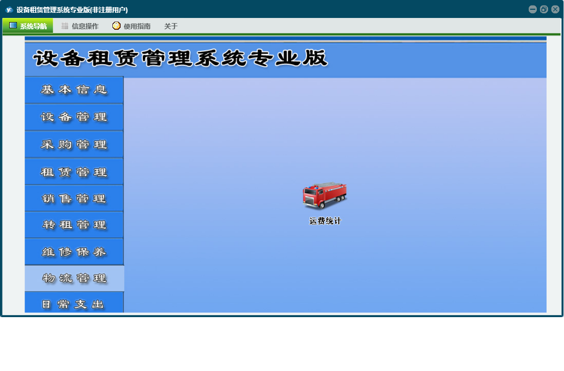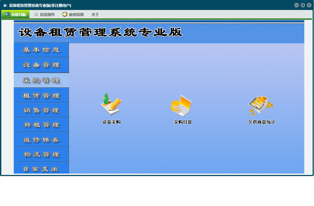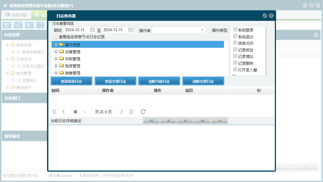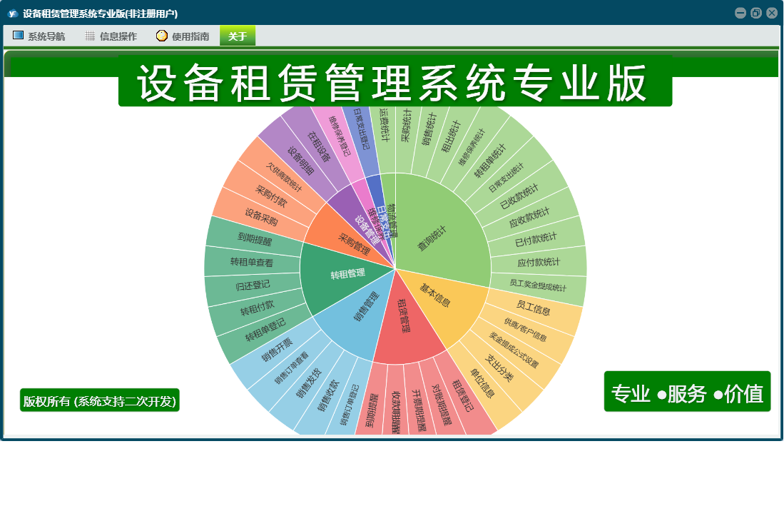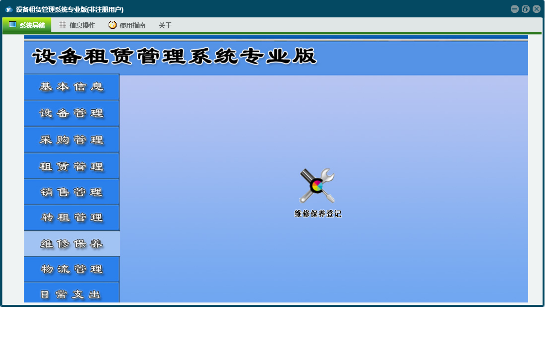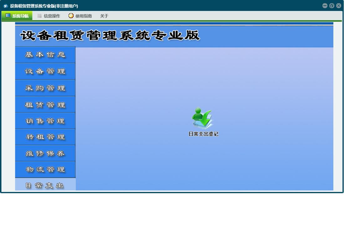 设备租赁管理系统专业版包含以下功能:销售管理、查询统计、日常支出、租赁管理、销售订单查看、销售订单登记、归还登记、销售开票、转租管理、权限设置、销售发货、销售收款、关于、基本信息、维护保养、设备管理、物流管理、日志、采购管理等