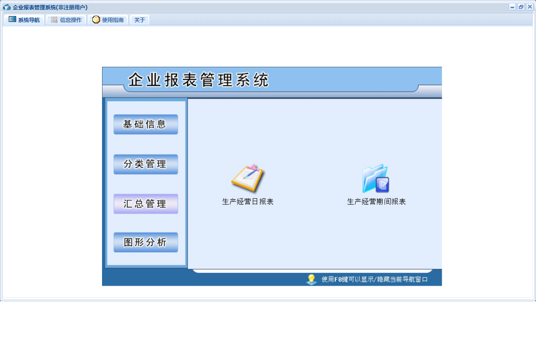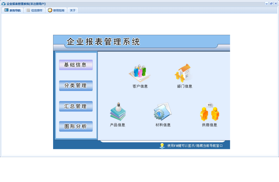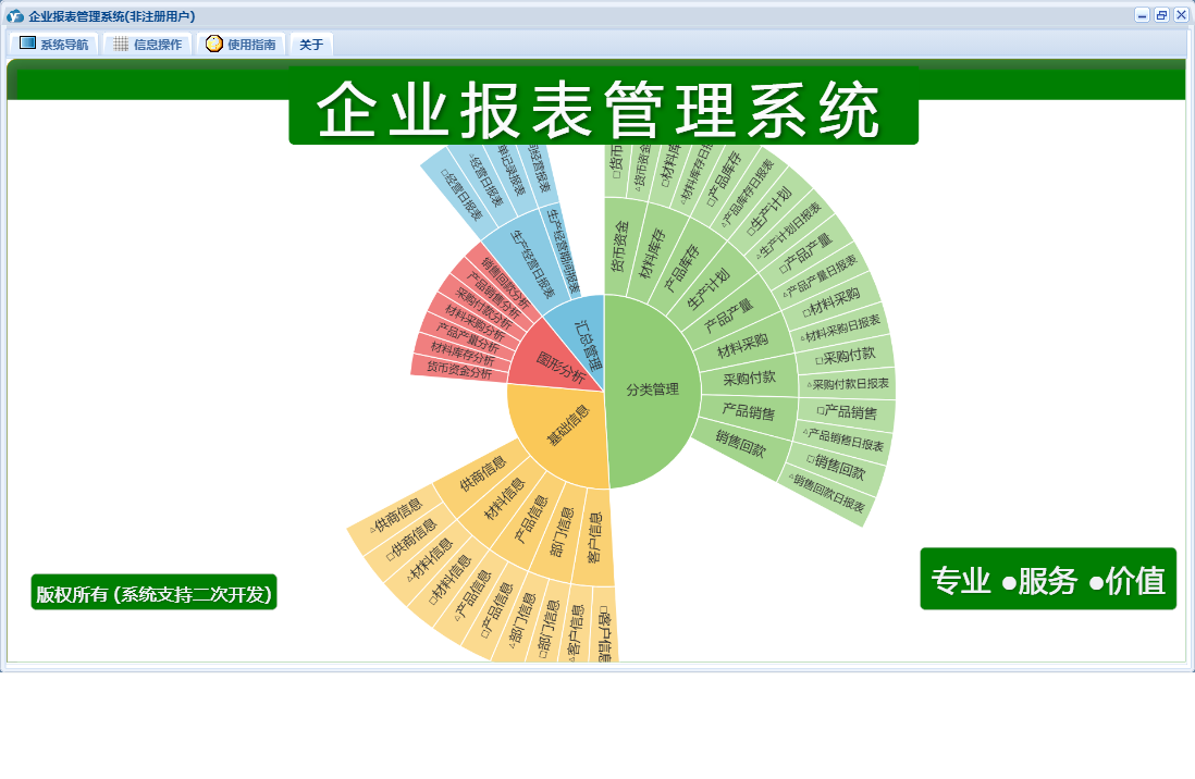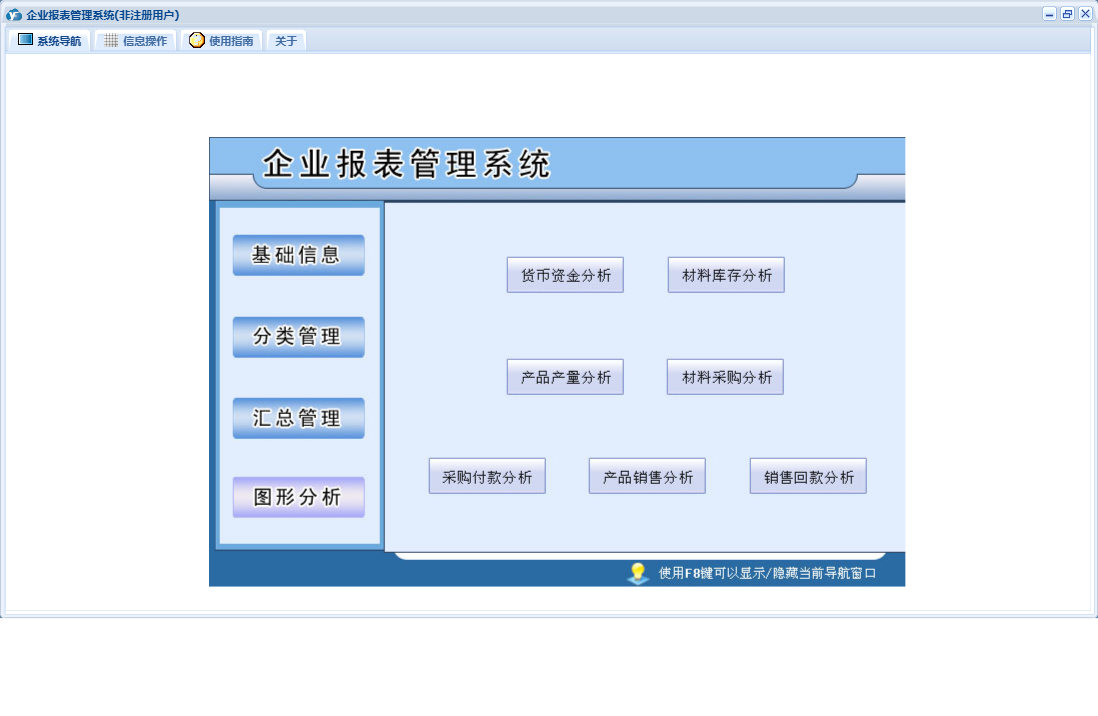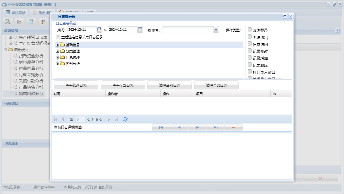 企业报表管理系统包含以下功能:产品产量、采购付款、货币资金、产品信息、分类管理、生产经营日、销售回款、材料信息、汇总管理、权限设置、部门信息、材料库存、产品库存、关于、客户信息、产品销售、图形分析、基础信息、材料采购、生产计划、日志、供商信息等