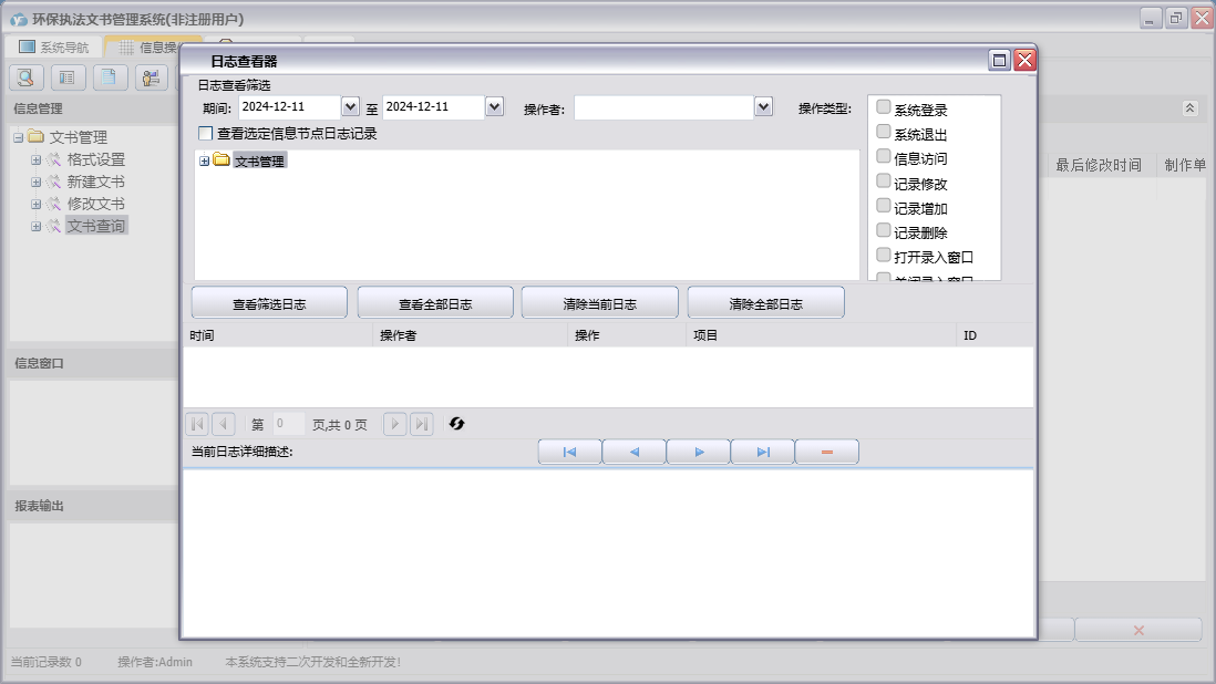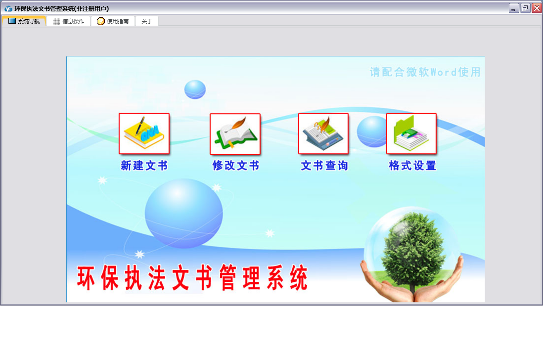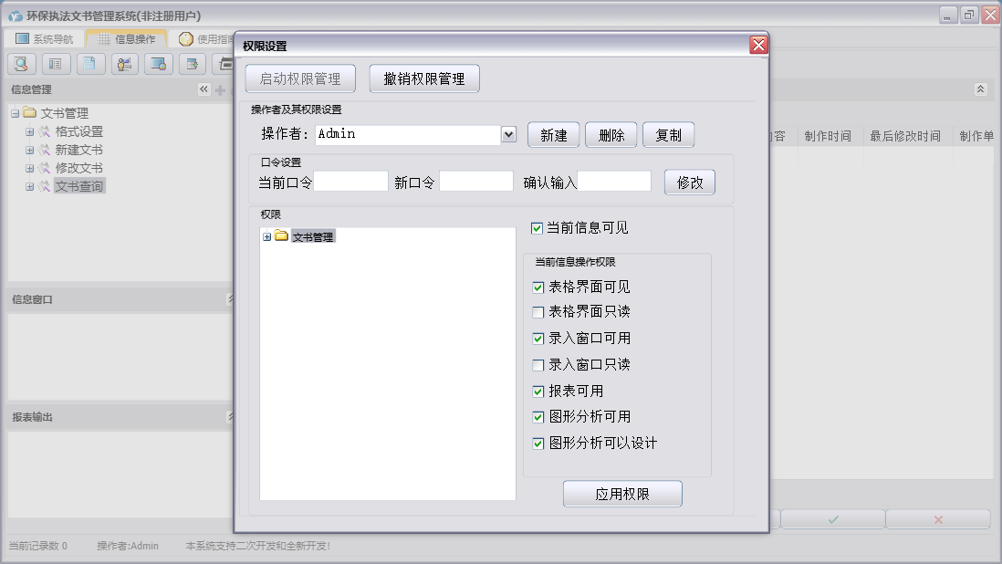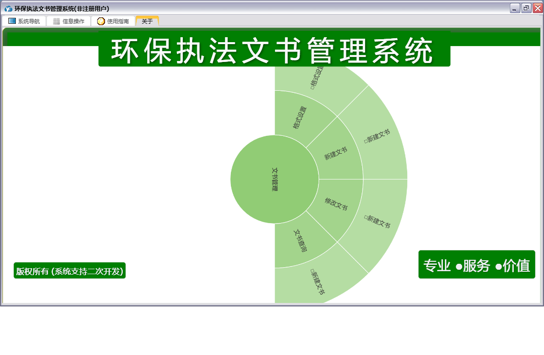 环保执法文书管理系统包含以下功能:文书查询、新建文书、文书管理、格式设置、修改文书、日志、关于、权限设置等