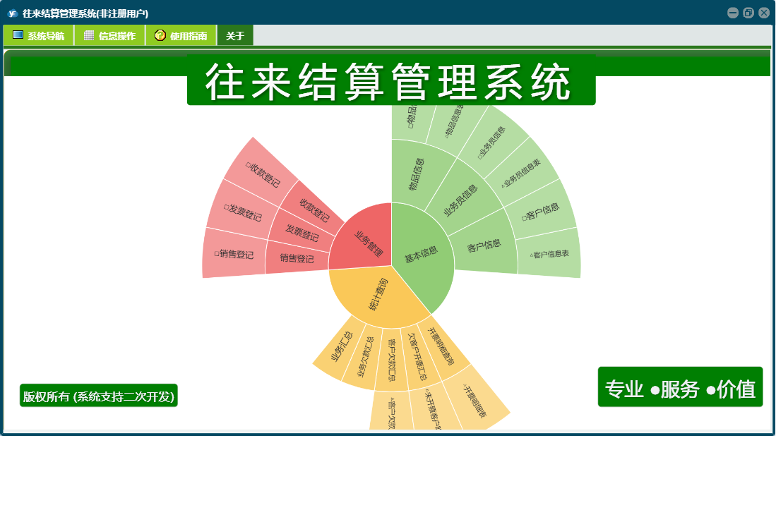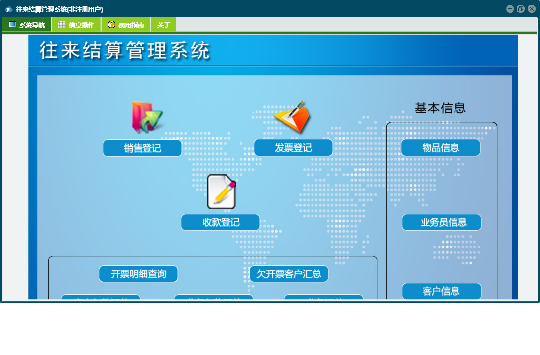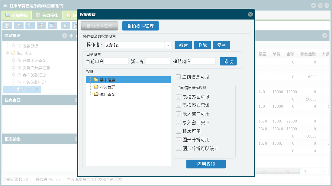 往来结算管理系统包含以下功能:面板、日志、关于、销售登记、权限设置、发票登记、收款登记等