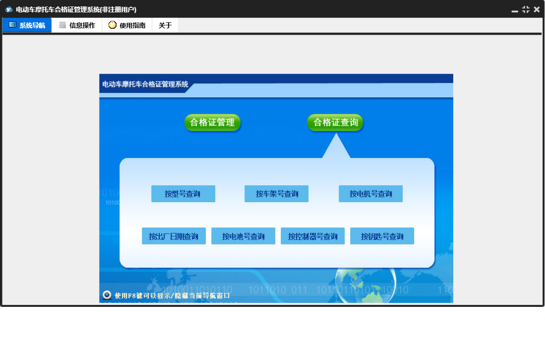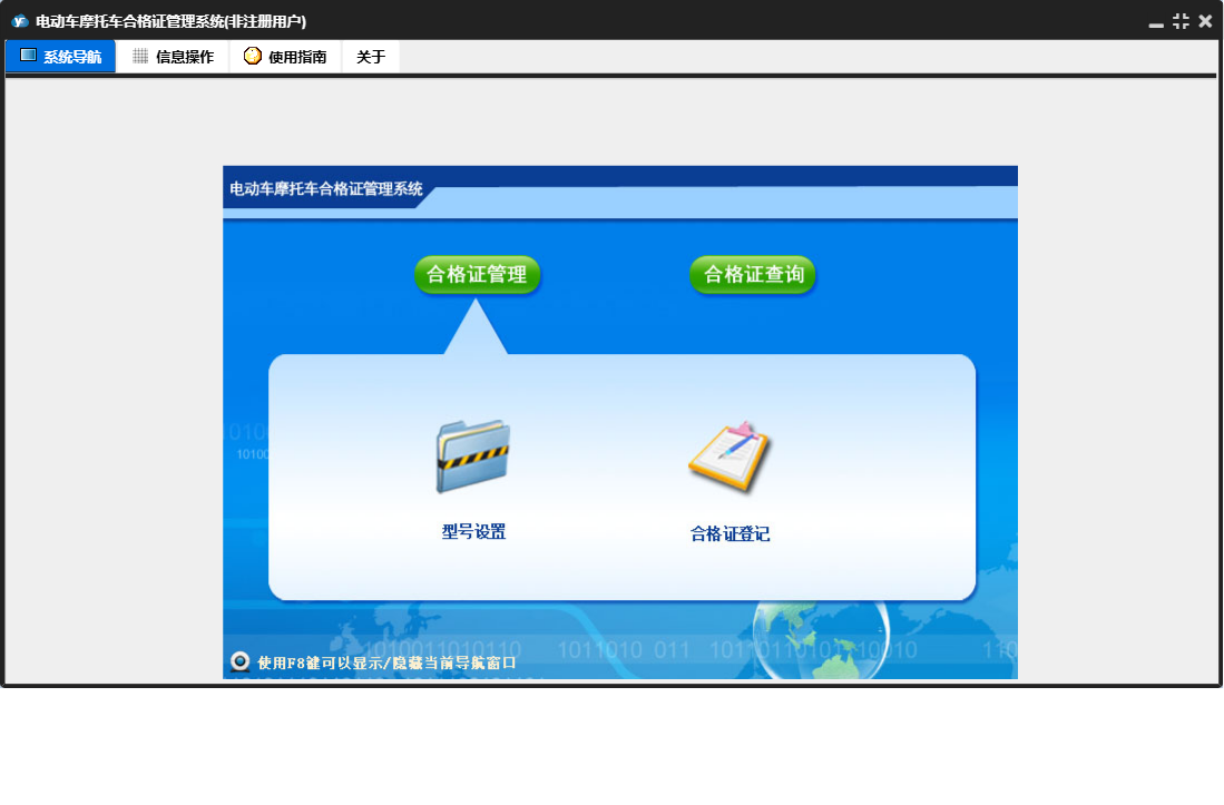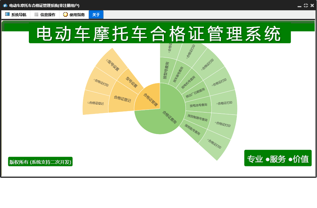 电动车摩托车合格证管理系统包含以下功能:合格证查询、日志、关于、权限设置、合格证管理、型号设置、合格证登记等