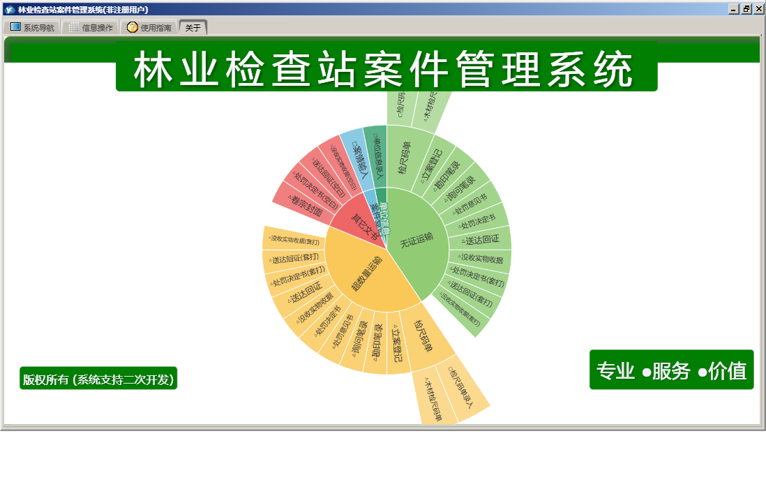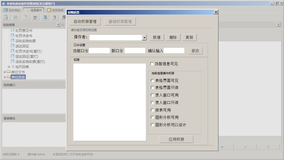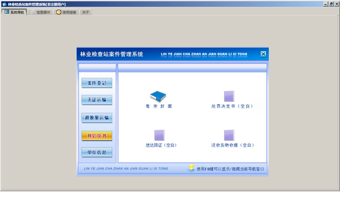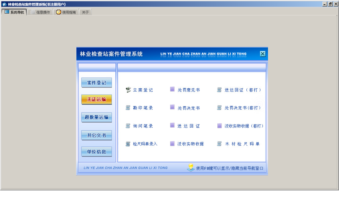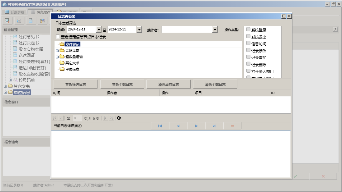 林业检查站案件管理系统包含以下功能:单位信息、其它文书、日志、案件登记、关于、权限设置、无证运输、超数量运输、检尺码单等