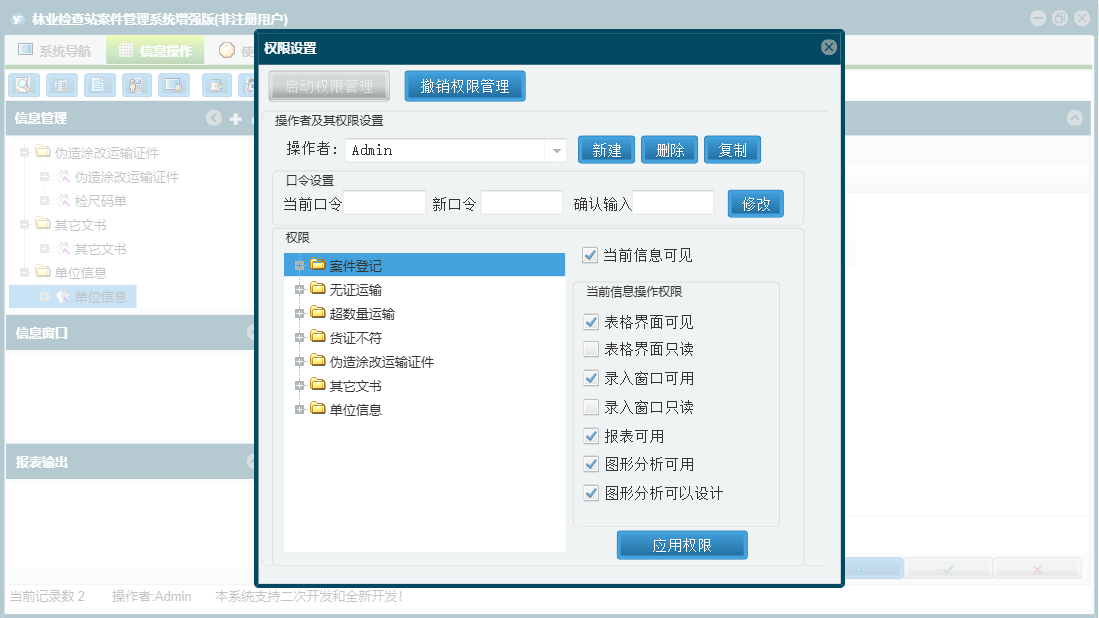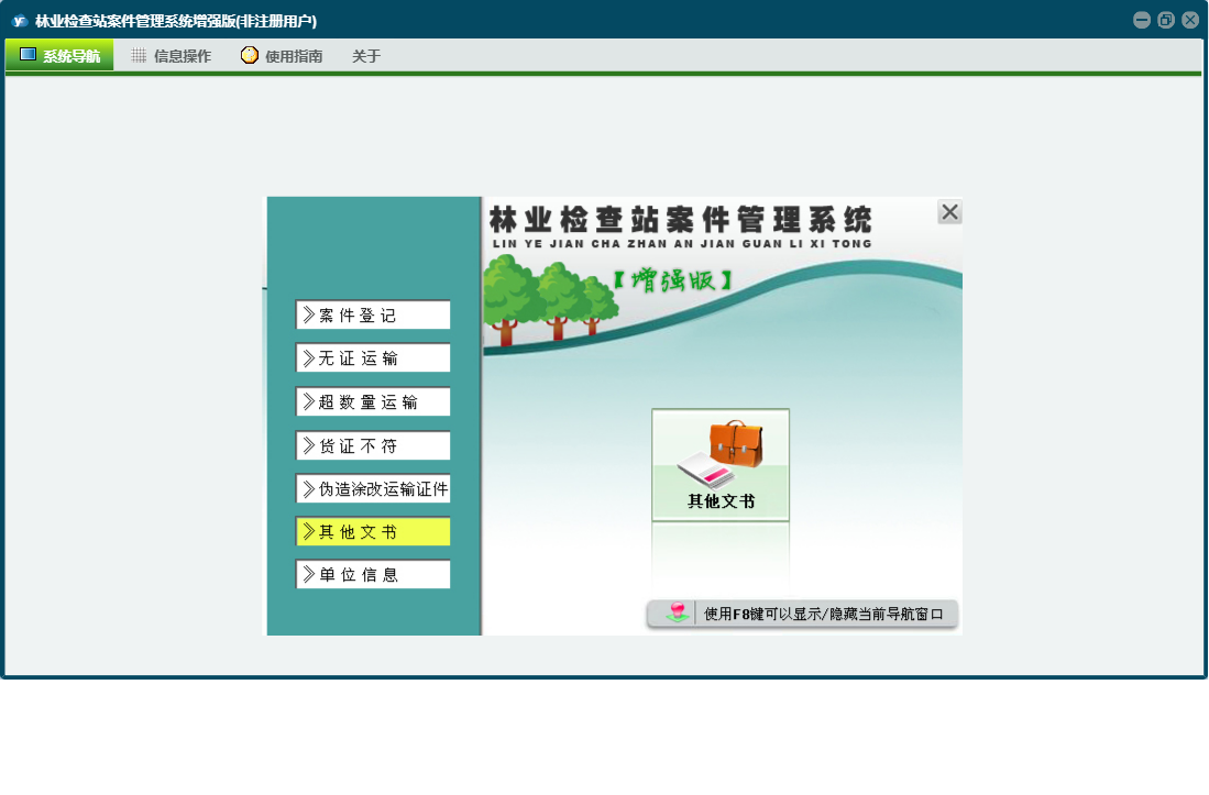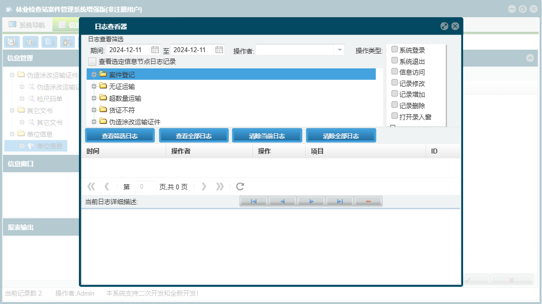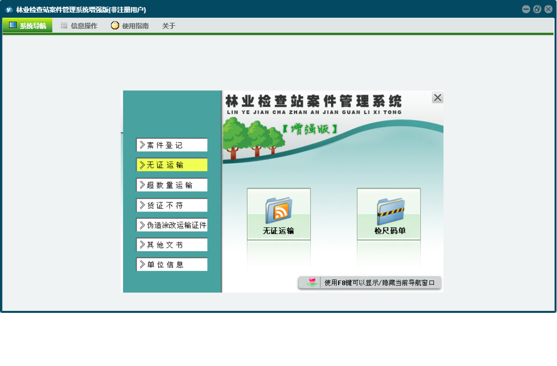 林业检查站案件管理系统增强版包含以下功能:单位信息、其它文书、货证不符、日志、案件登记、关于、权限设置、无证运输、超数量运输、伪造涂改运输证件、检尺码单等