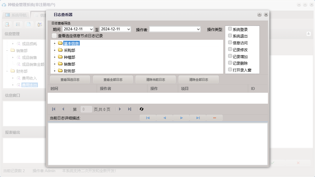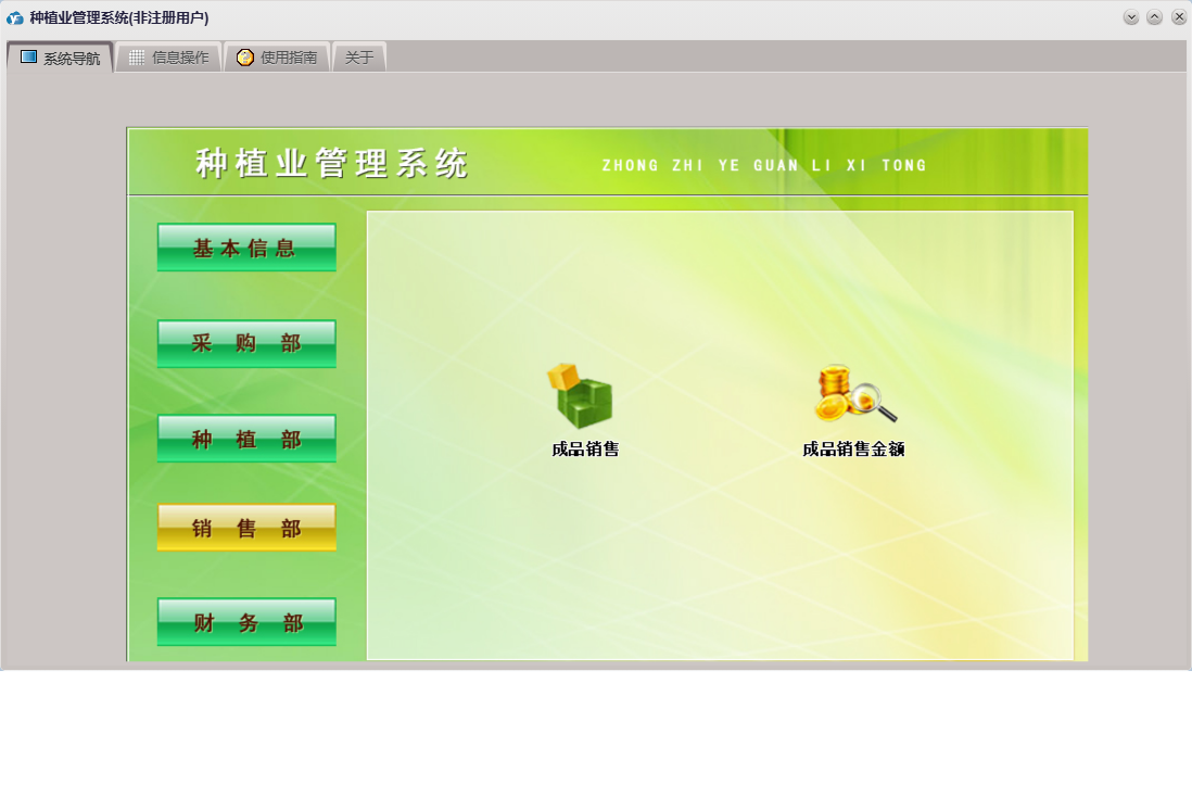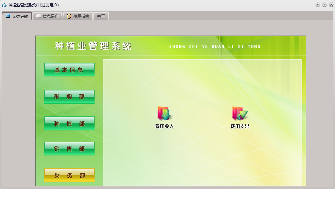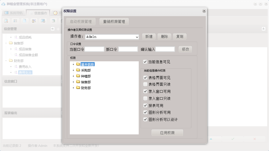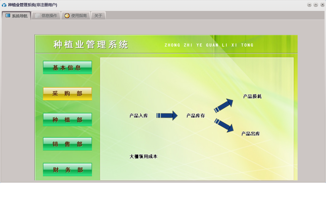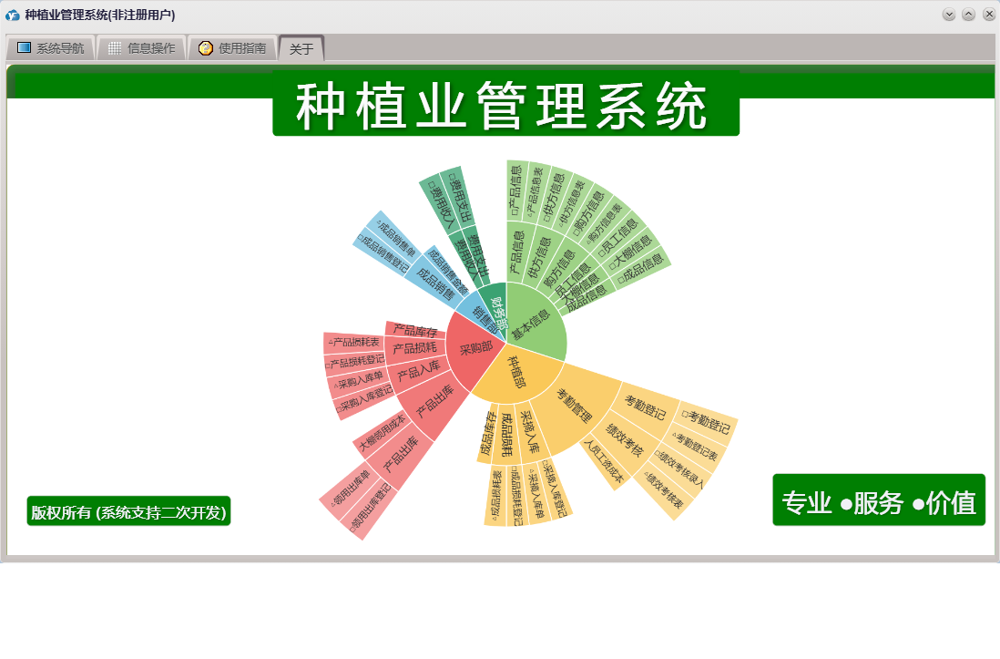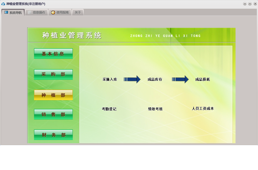 种植业管理系统包含以下功能:产品信息、产品损耗、成品信息、种植部、费用收入、成品销售、权限设置、采摘入库、费用支出、采购部、绩效考核、销售部、购方信息、考勤登记、关于、基本信息、成品损耗、大棚信息、财务部、供方信息、员工信息、产品入库、产品出库、日志等
