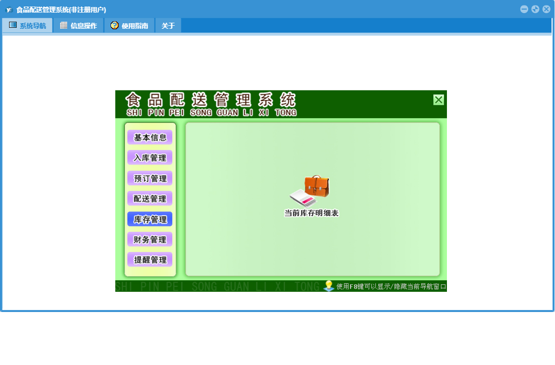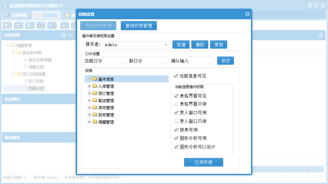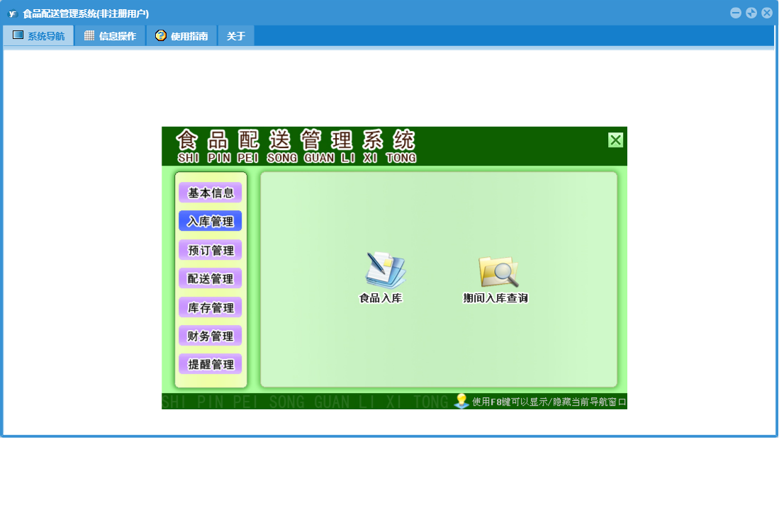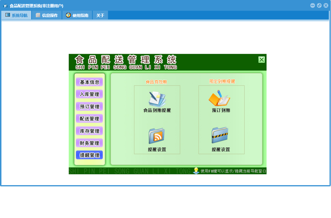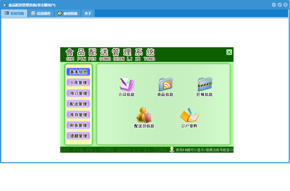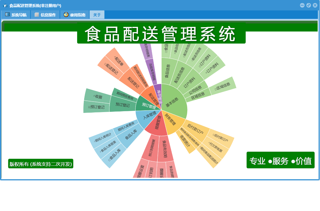 食品配送管理系统包含以下功能:入库管理、预订登记、提醒管理、配送员信息、配送登记、日志、库存管理、配送管理、订户资料、区域信息、食品信息、关于、后付款订户、基本信息、权限设置、预订管理、财务管理、食品入库等
