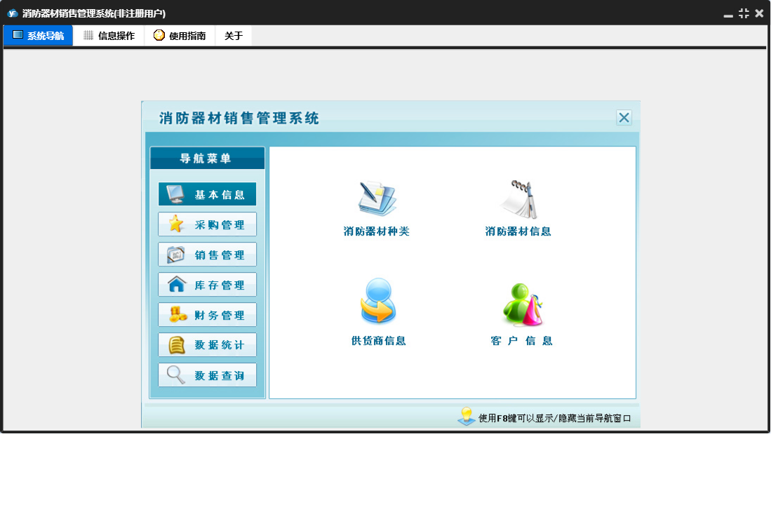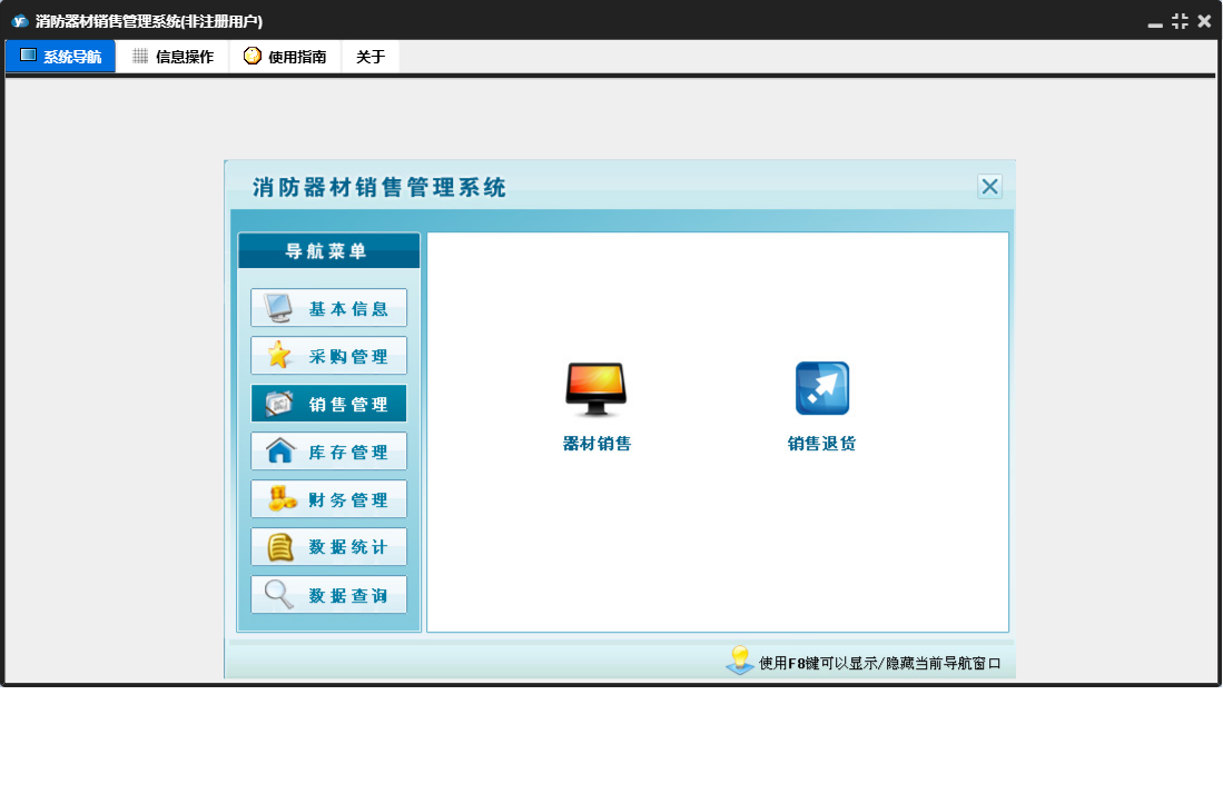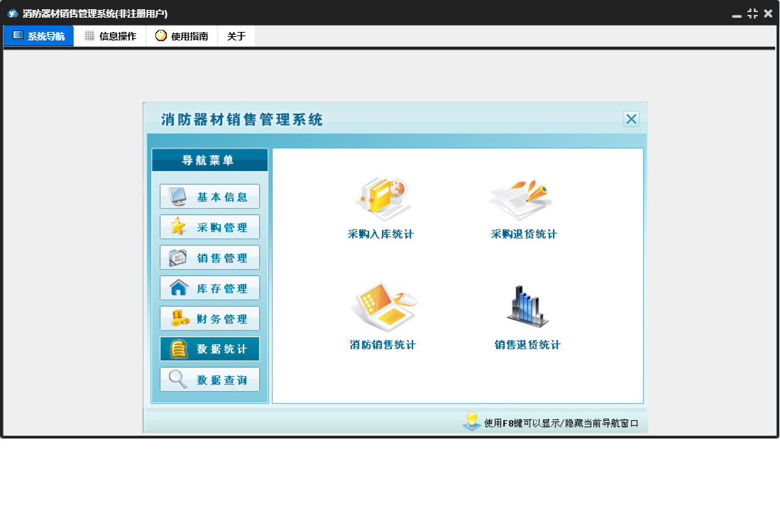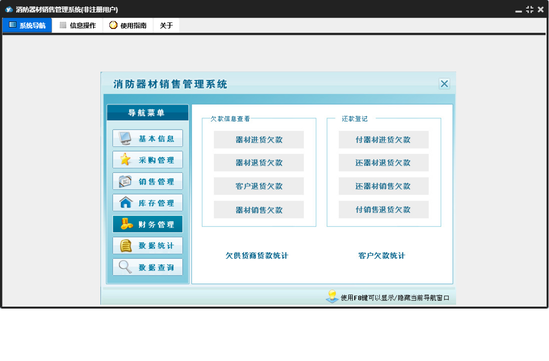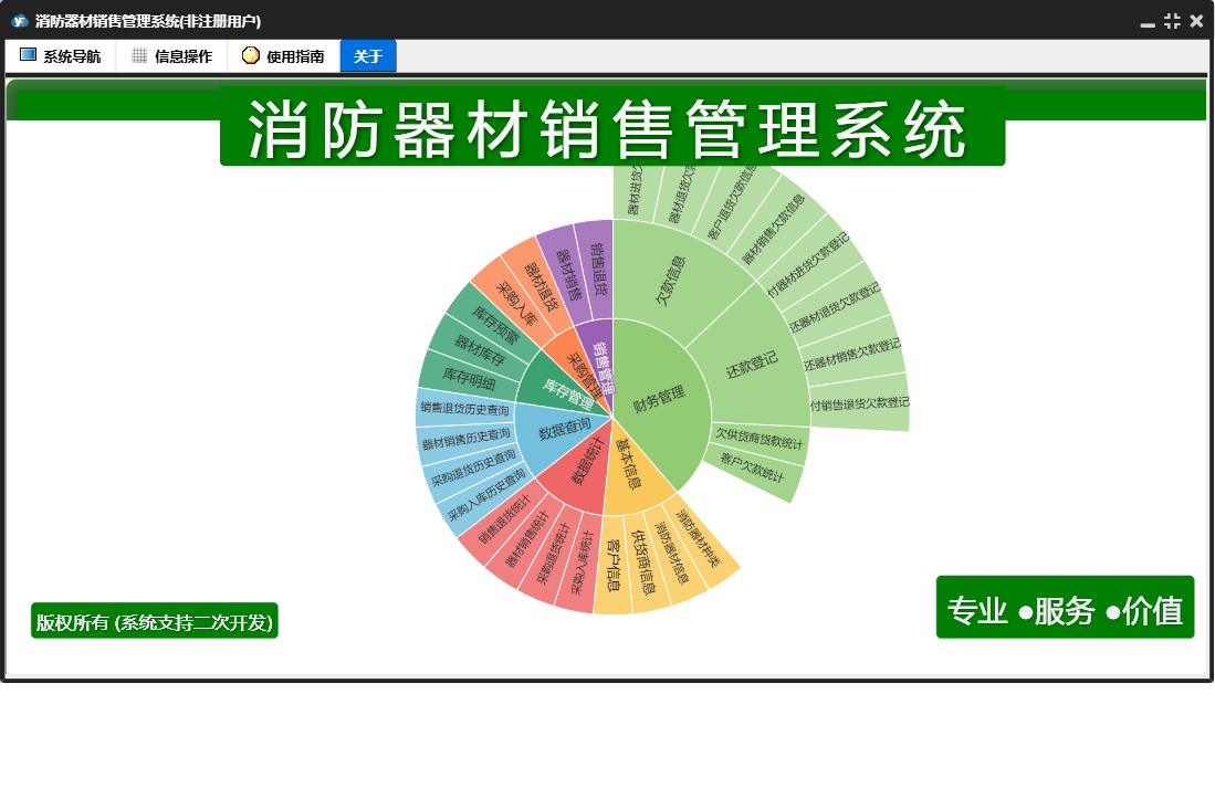 消防器材销售管理系统包含以下功能:数据统计、销售管理、还器材销售欠款登记、付销售退货欠款登记、还器材退货欠款登记、财务管理、器材退货、器材销售、销售退货、数据查询、权限设置、消防器材种类、消防器材信息、库存管理、关于、基本信息、客户信息、付器材进货欠款登记、供货商信息、日志、采购管理、采购入库等