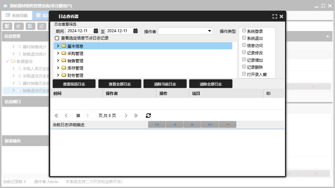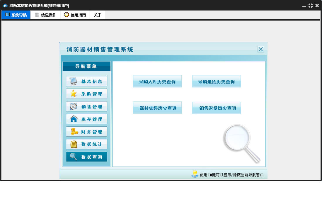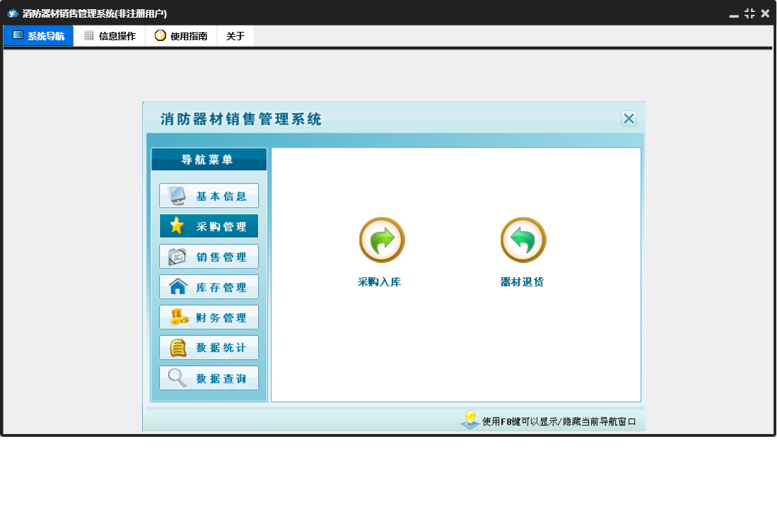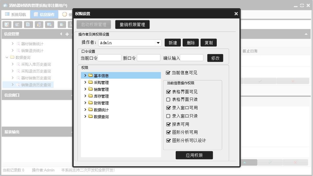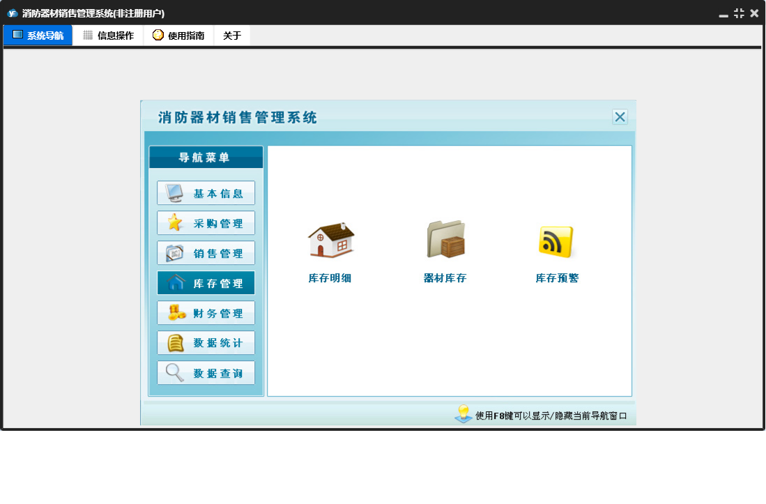 消防器材销售管理系统包含以下功能:数据统计、销售管理、还器材销售欠款登记、付销售退货欠款登记、还器材退货欠款登记、财务管理、器材退货、器材销售、销售退货、数据查询、权限设置、消防器材种类、消防器材信息、库存管理、关于、基本信息、客户信息、付器材进货欠款登记、供货商信息、日志、采购管理、采购入库等