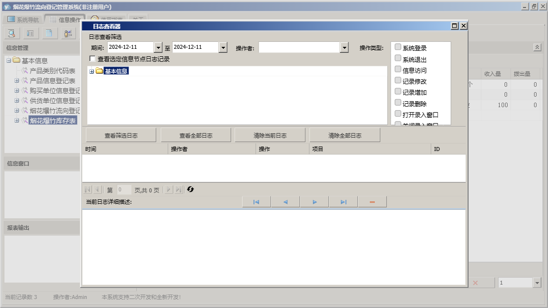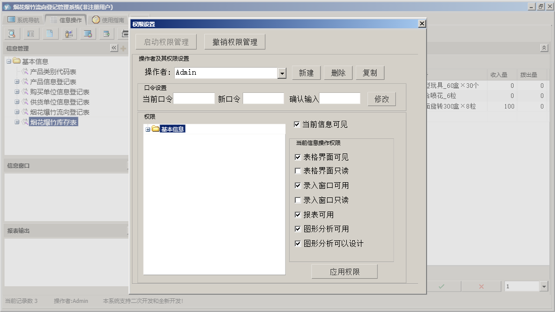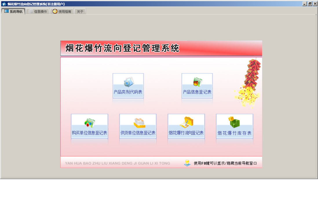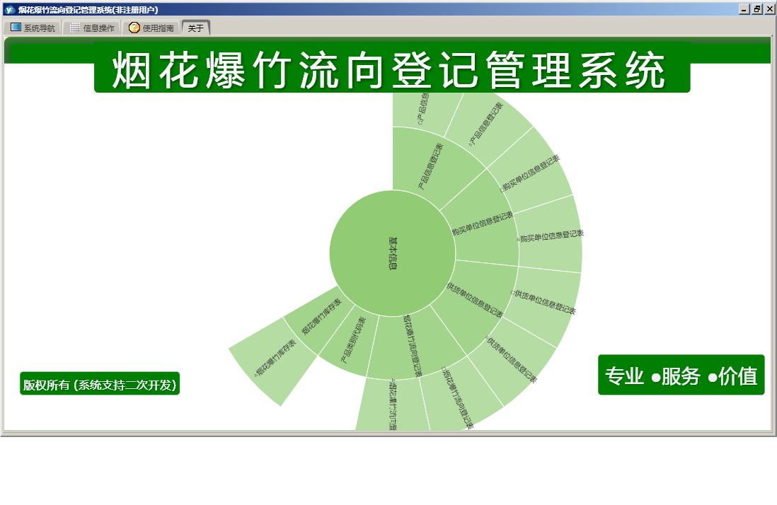 烟花爆竹流向登记管理系统包含以下功能:烟花爆竹流向登记表、供货单位信息登记表、日志、购买单位信息登记表、关于、权限设置、基本信息、产品信息登记表等