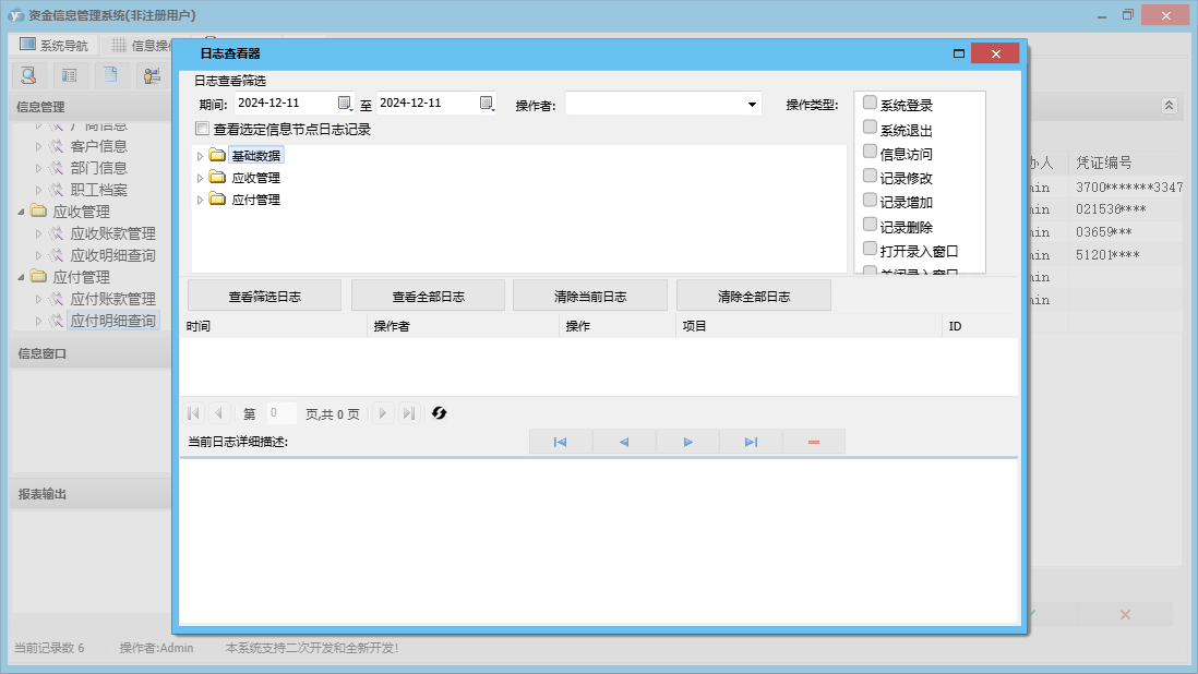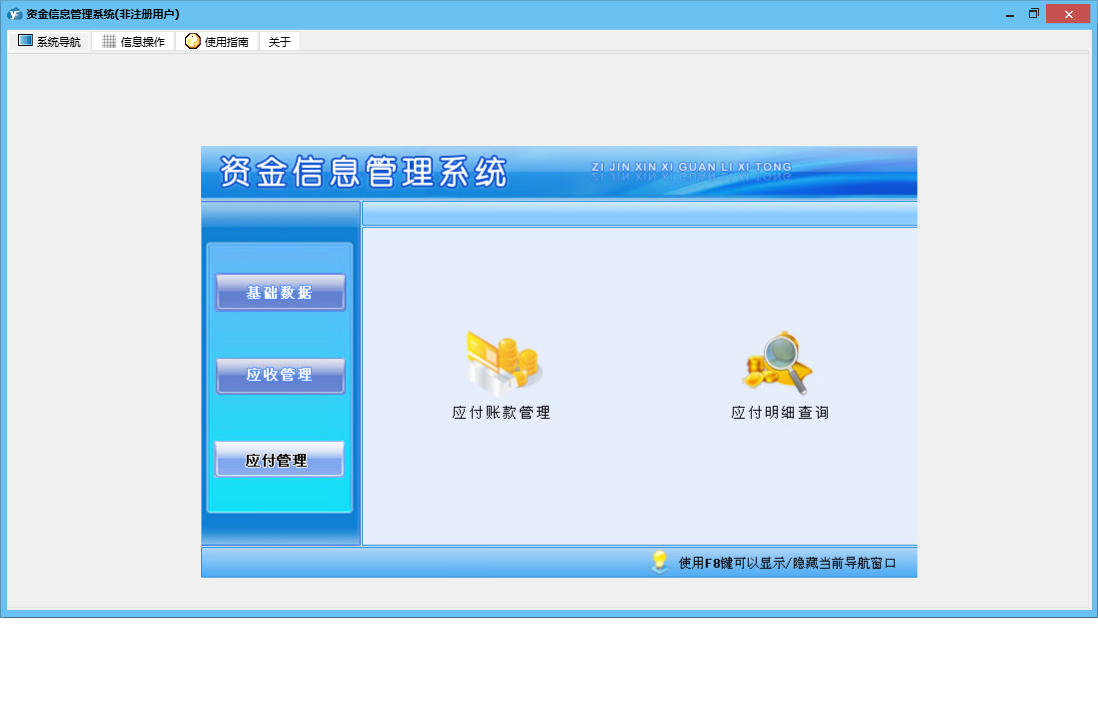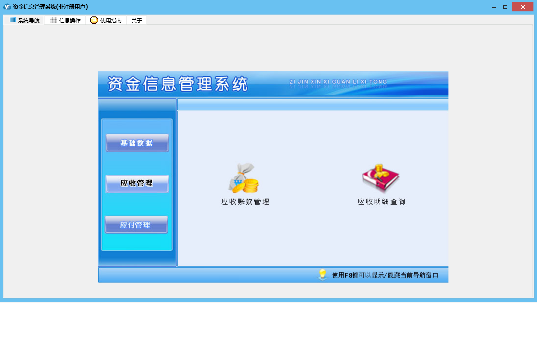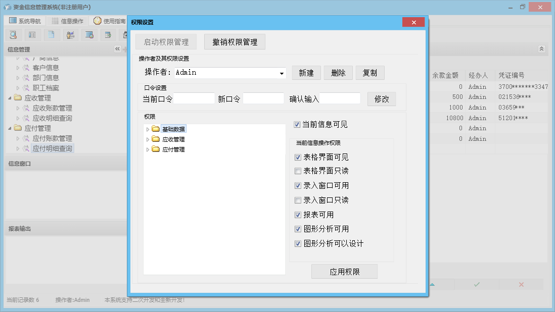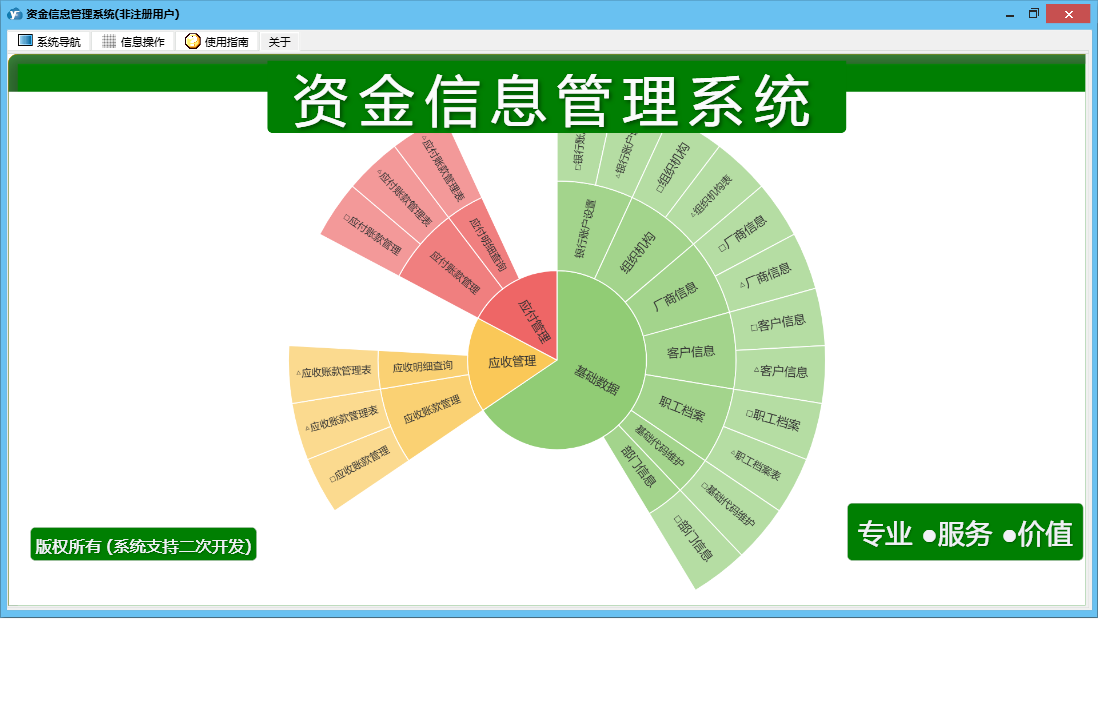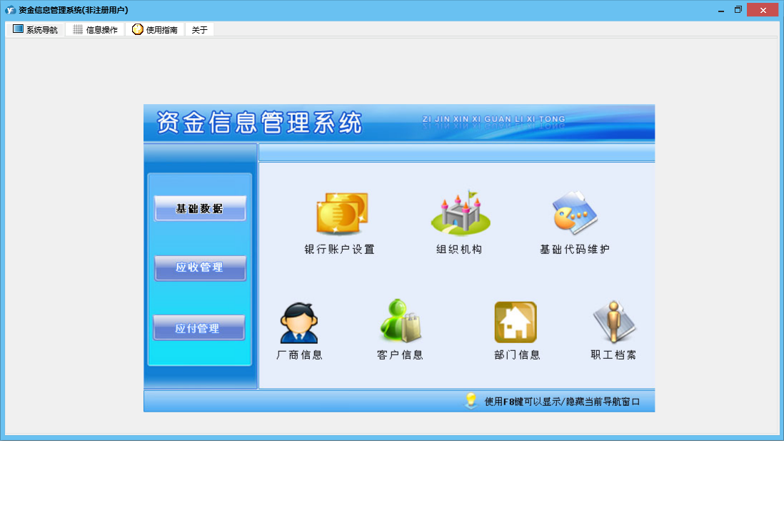 资金信息管理系统包含以下功能:基础数据、基础代码维护、应收账款管理、应收管理、应付账款管理、应付管理、职工档案、厂商信息、日志、关于、权限设置、组织机构、部门信息、银行账户设置、客户信息等