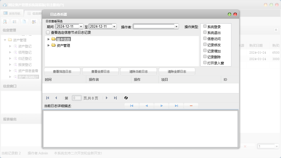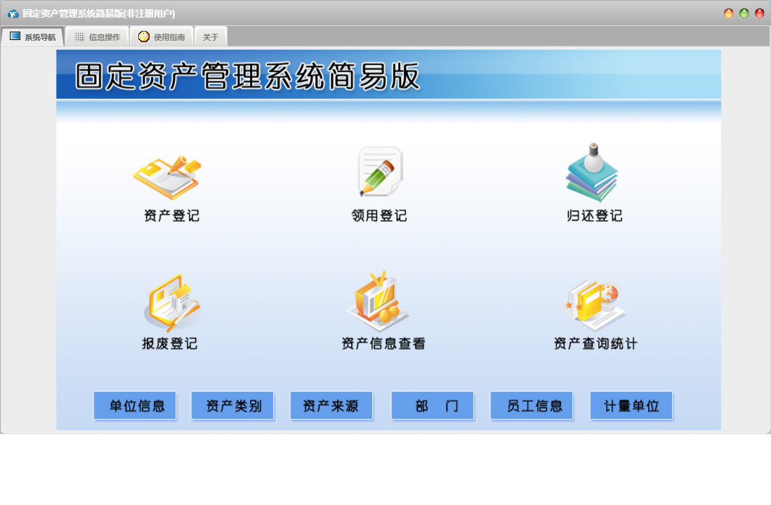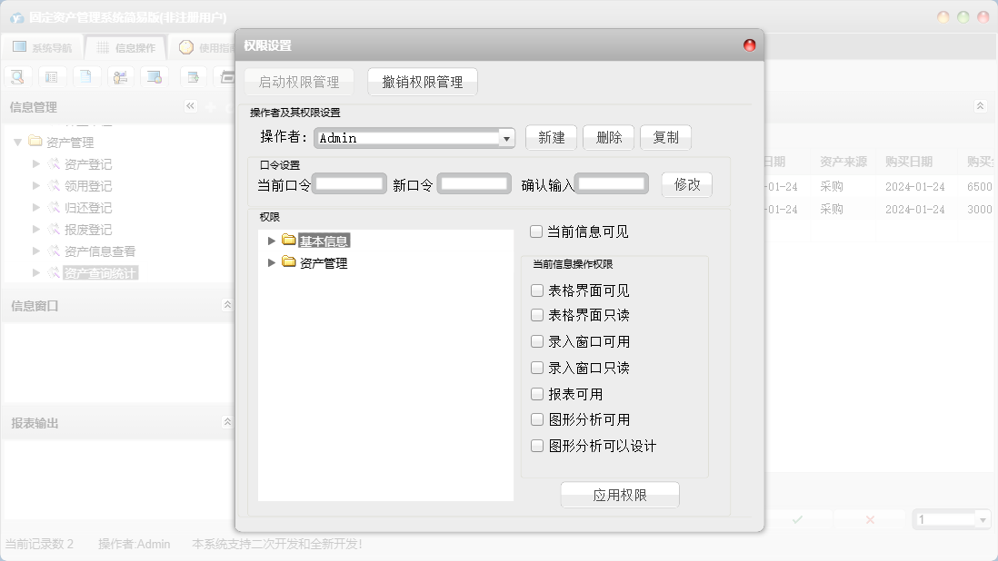 固定资产管理系统简易版包含以下功能:领用登记、面板、员工信息、日志、关于、权限设置、资产信息查看、资产登记、报废登记、归还登记等