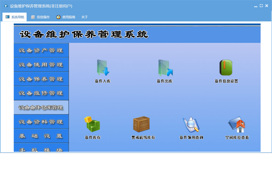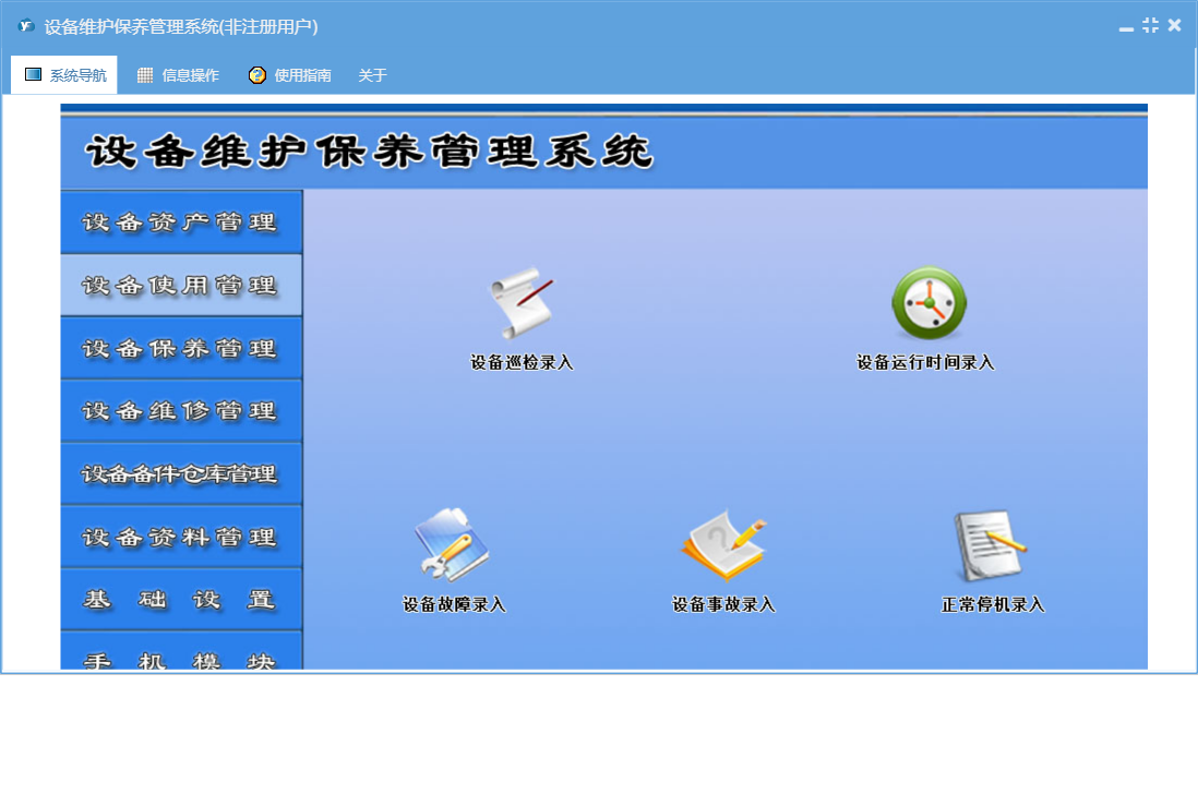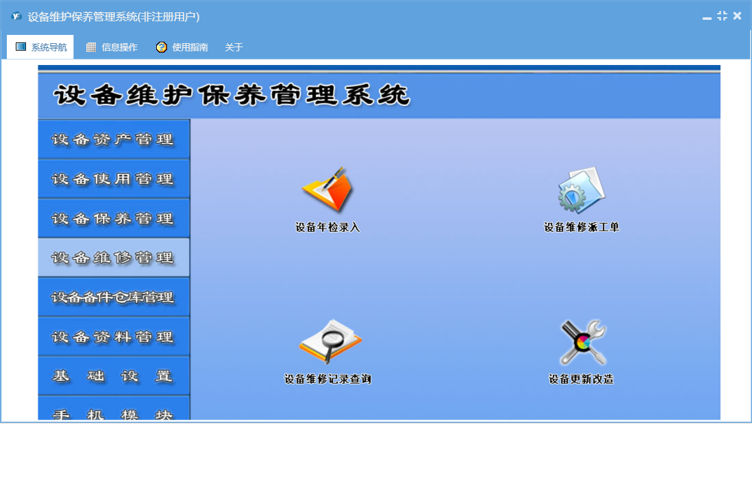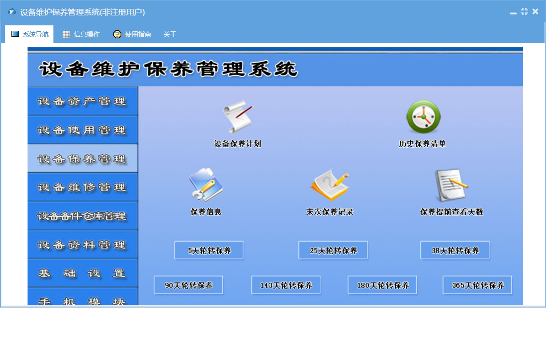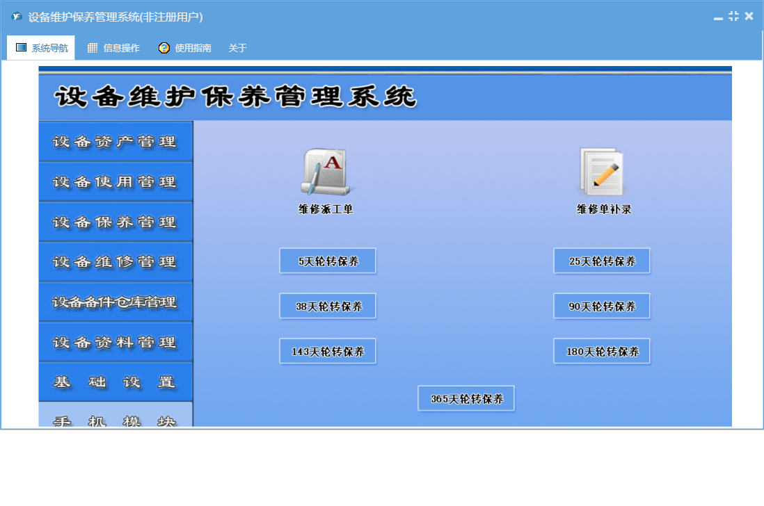 设备维护保养管理系统包含以下功能:365天保养、设备年检录入、设备台帐修改、5天轮转保养、90天保养、备件出库、保养管理、资料管理、其它资料上传、180天轮转保养、365天轮转保养、25天轮转保养、90天轮转保养、设备保养计划、设备台帐录入、保养信息、38天轮转保养、维修单补录、权限设置、使用管理、143天保养、设备报废、143天轮转保养、岗位设置信息、5天保养、单位信息、维修派工单、维修单位设置、25天保养、部门设置信息、设备故障录入、设备事故录入、维修管理、历史保养清单、关于、备件信息设置、180天保养、备件管理、38天保养、基础信息、设备维修记录查询、设备维修派工单、手机模块、设备运行时间录入、班组信息设置、维修资料上传、员工信息、备件领用查询、日志、正常停机录入、备件入库、设备巡检录入、资产管理、设备更新改造等