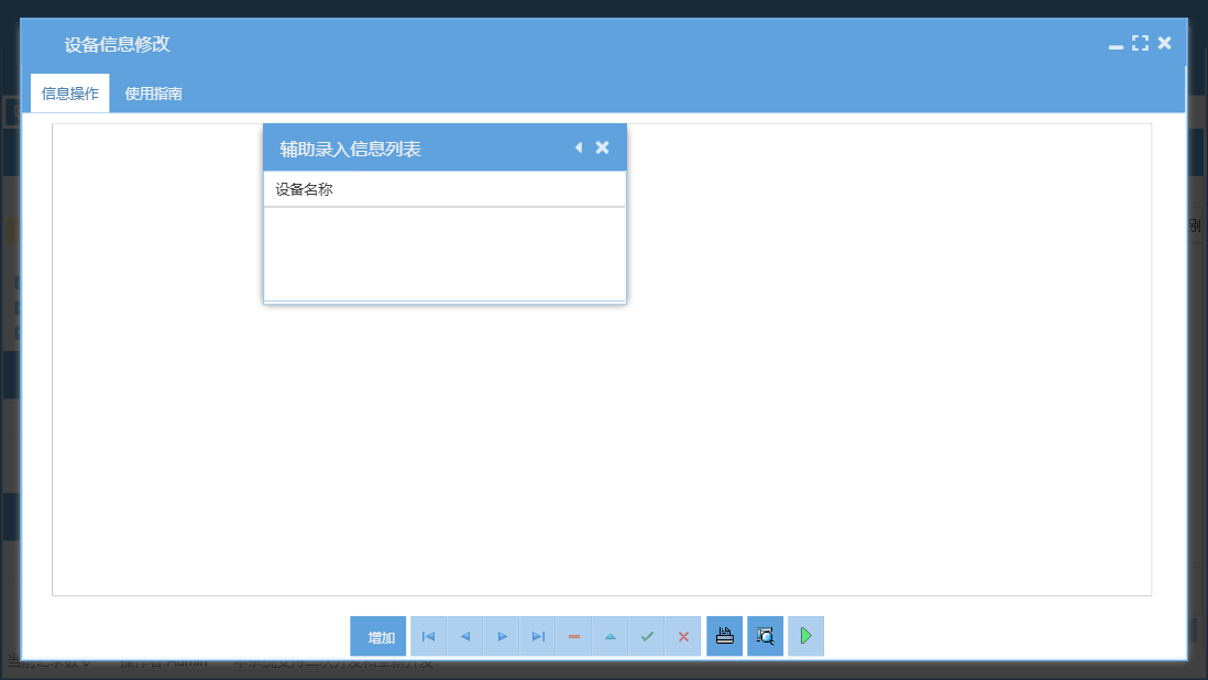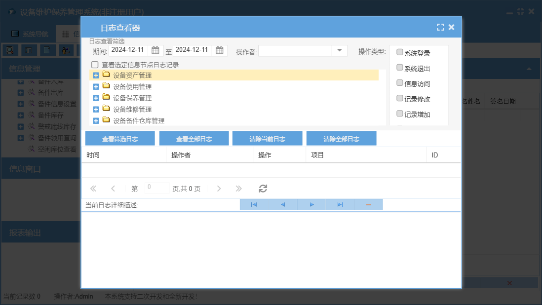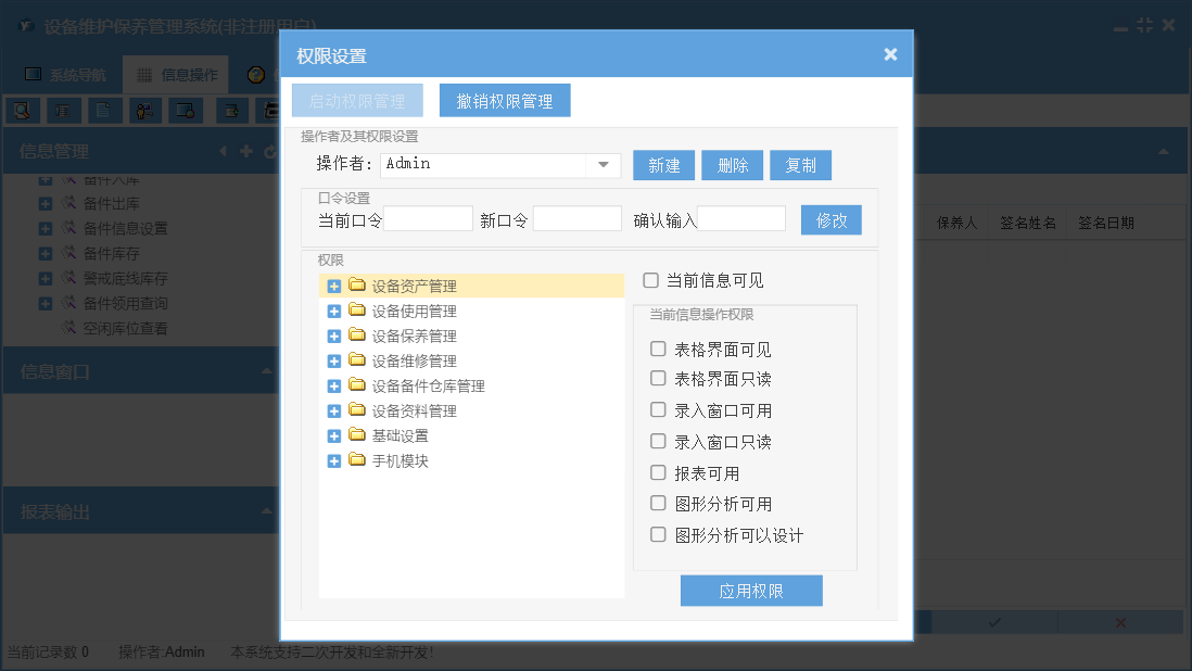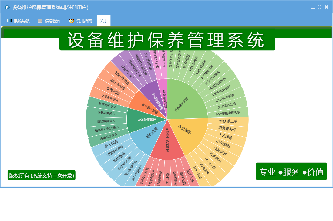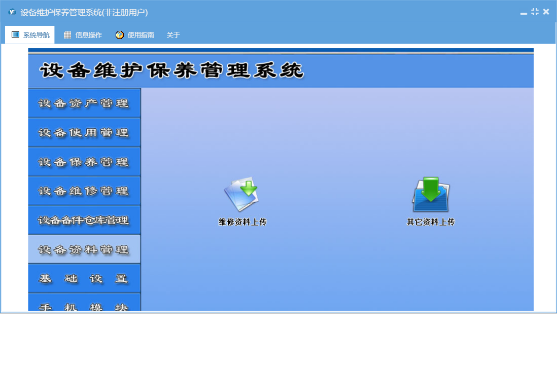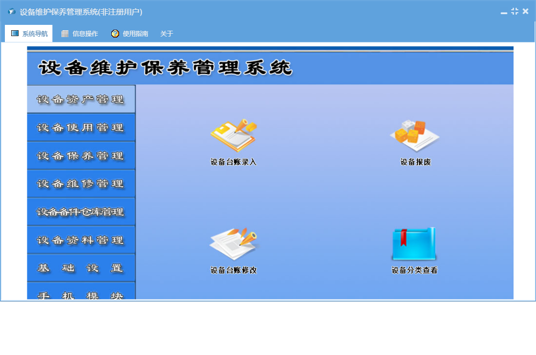 设备维护保养管理系统包含以下功能:365天保养、设备年检录入、设备台帐修改、5天轮转保养、90天保养、备件出库、保养管理、资料管理、其它资料上传、180天轮转保养、365天轮转保养、25天轮转保养、90天轮转保养、设备保养计划、设备台帐录入、保养信息、38天轮转保养、维修单补录、权限设置、使用管理、143天保养、设备报废、143天轮转保养、岗位设置信息、5天保养、单位信息、维修派工单、维修单位设置、25天保养、部门设置信息、设备故障录入、设备事故录入、维修管理、历史保养清单、关于、备件信息设置、180天保养、备件管理、38天保养、基础信息、设备维修记录查询、设备维修派工单、手机模块、设备运行时间录入、班组信息设置、维修资料上传、员工信息、备件领用查询、日志、正常停机录入、备件入库、设备巡检录入、资产管理、设备更新改造等