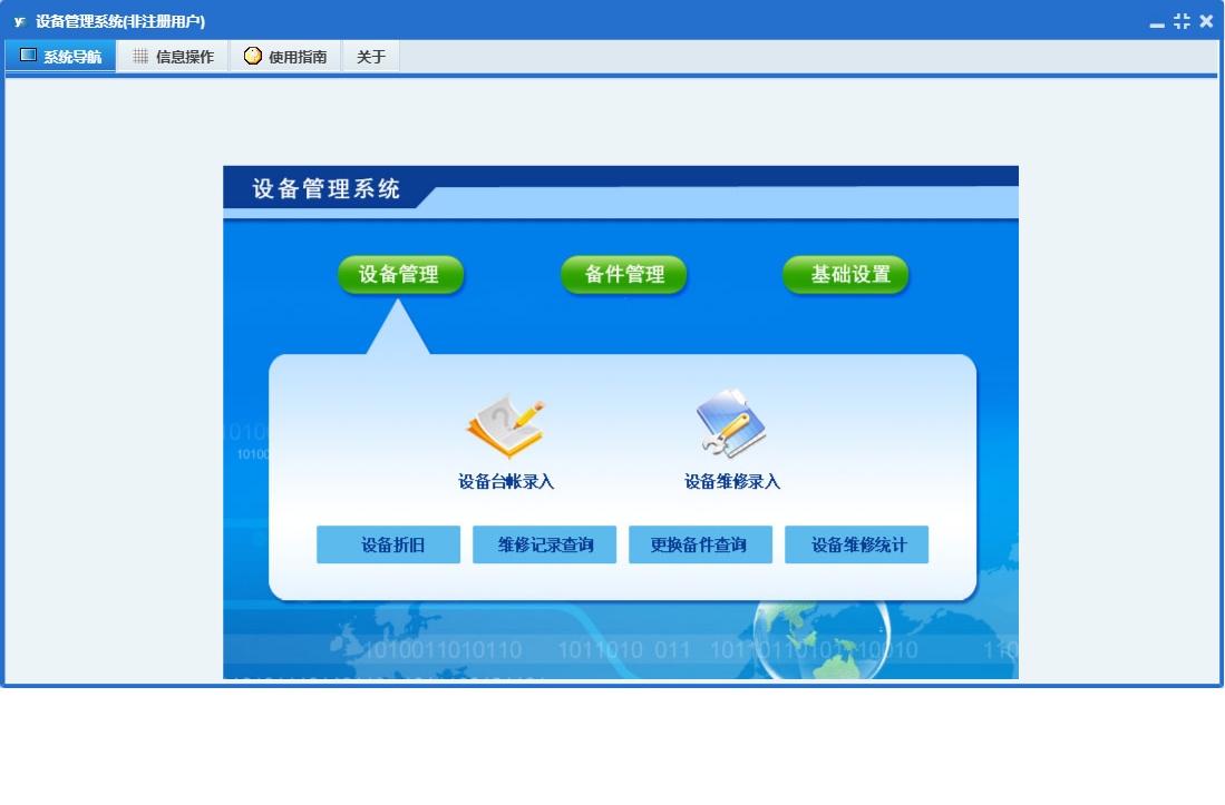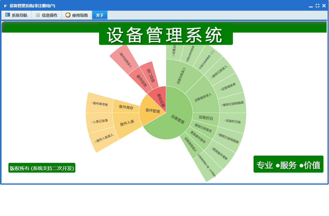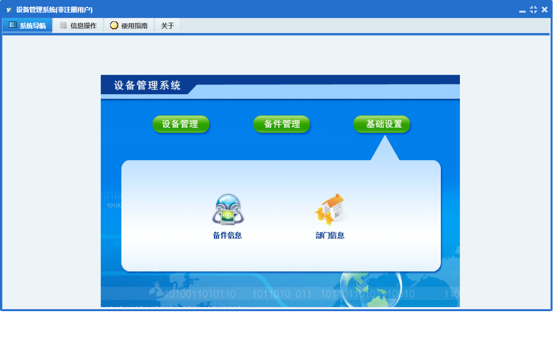 设备管理系统包含以下功能:关于、基础、设备、备件等