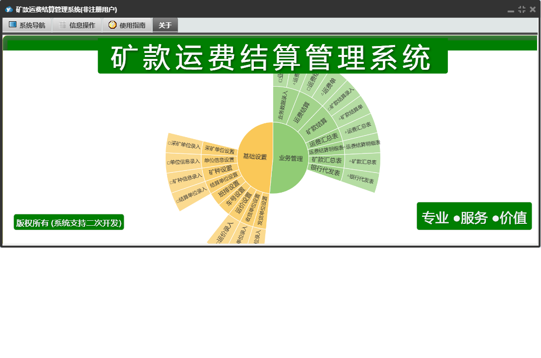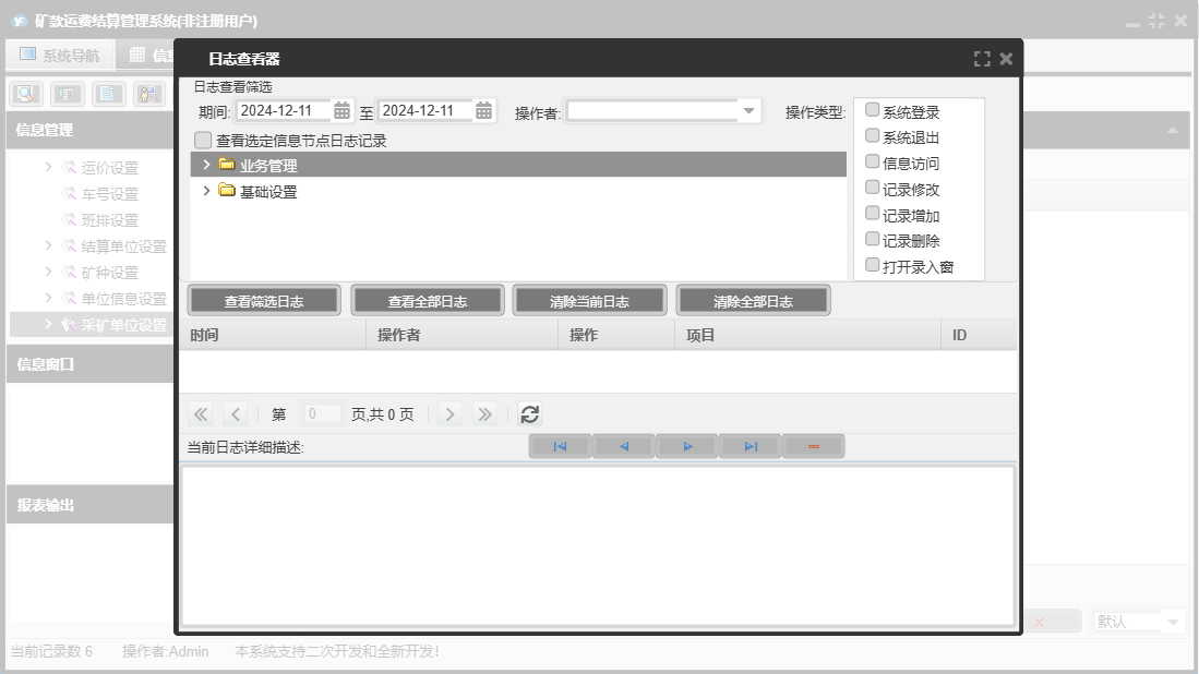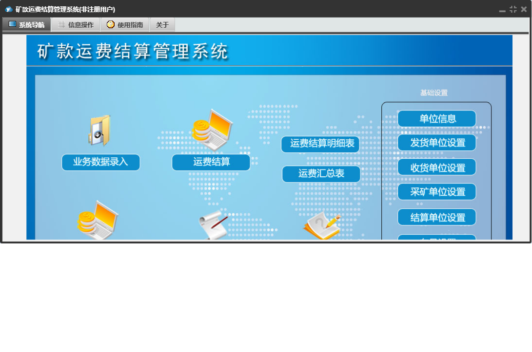 矿款运费结算管理系统包含以下功能:运费结算、面板、日志、结算单位设置、收货单位设置、关于、矿款结算、采矿单位设置、单位信息设置、权限设置、业务数据录入、发货单位设置、矿种设置、运价设置等