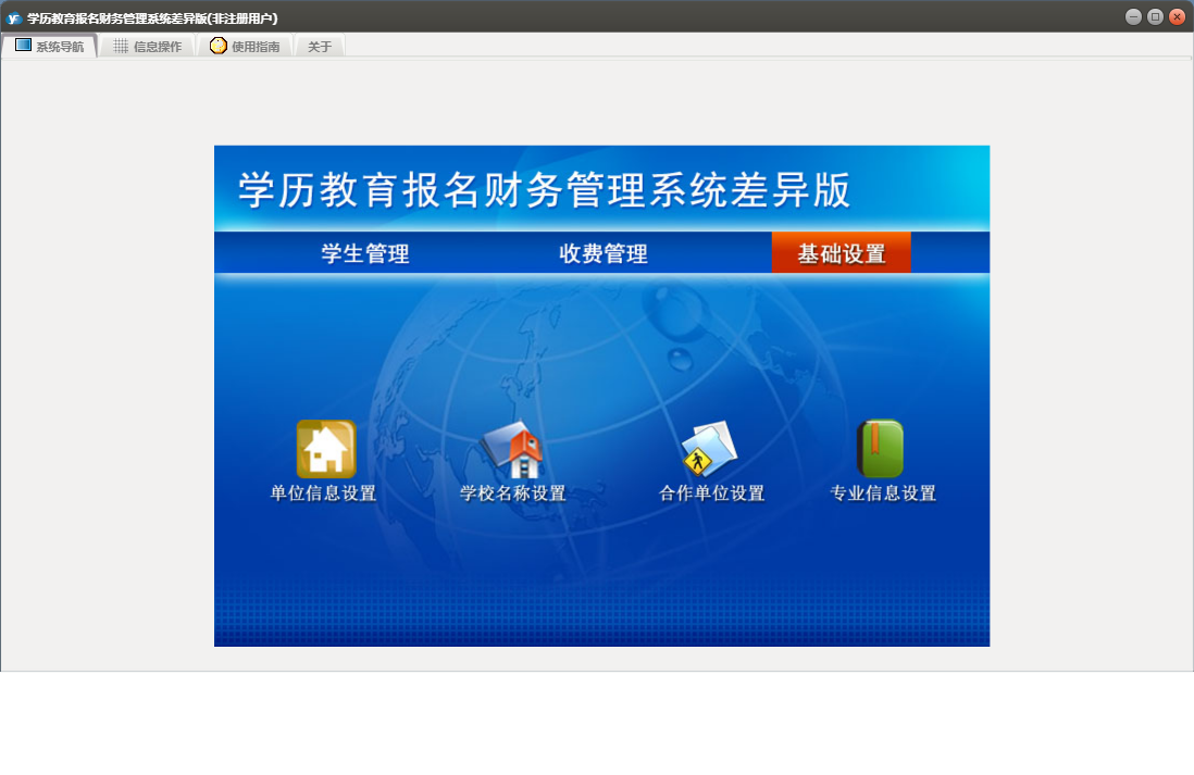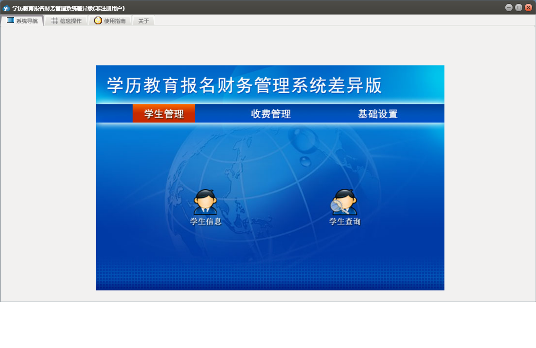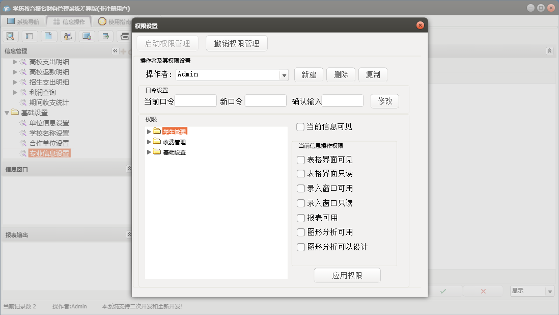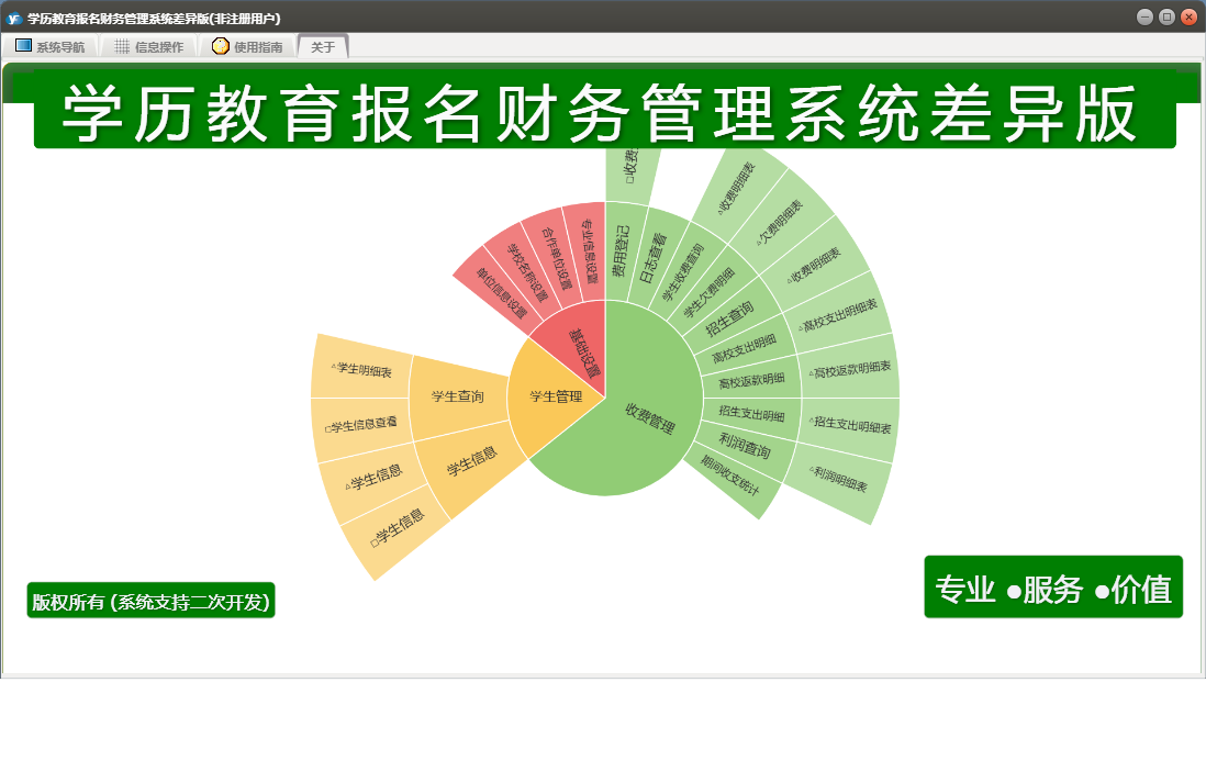 学历教育报名财务管理系统差异版包含以下功能:基础信息、学生管理、学生信息、日志、学生查询、关于、权限设置、费用登记、收费管理等