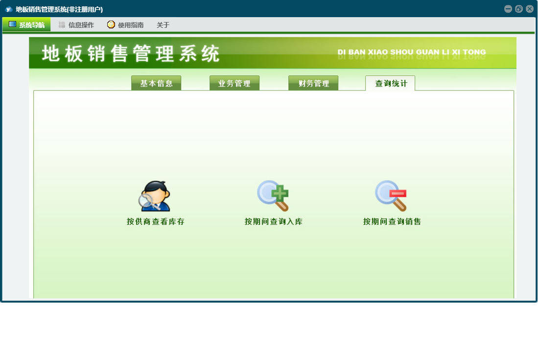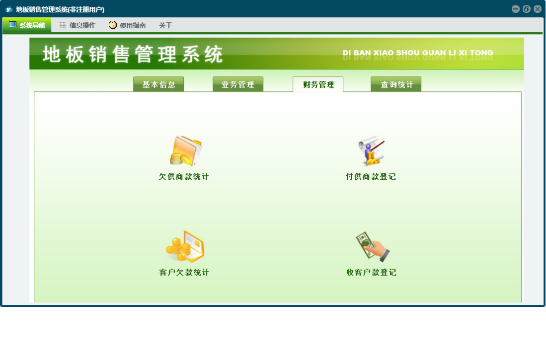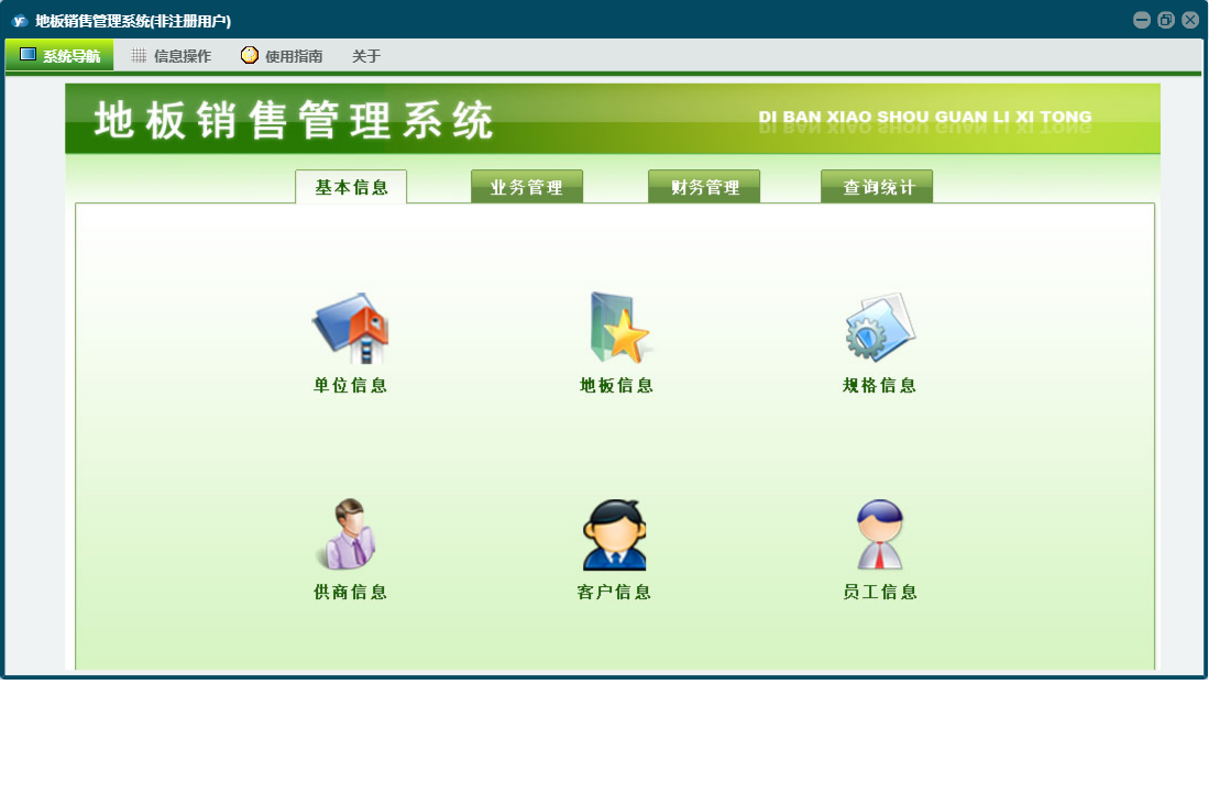地板销售管理系统包含以下功能:规格信息、单位信息、查询统计、日志、关于、权限设置、基本信息、财务管理、业务管理等