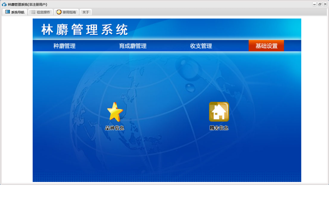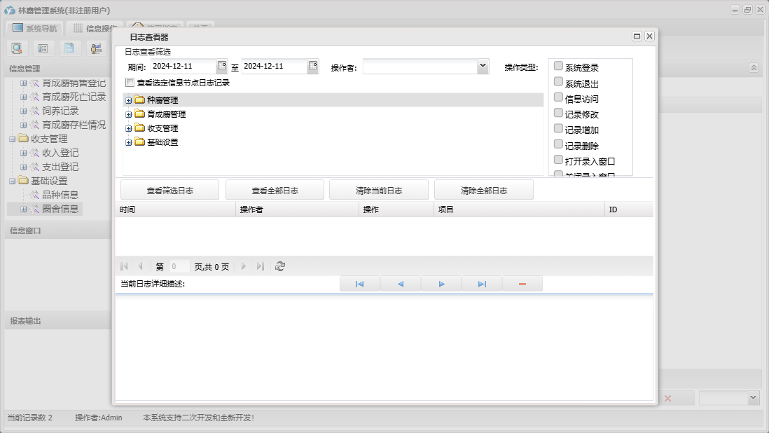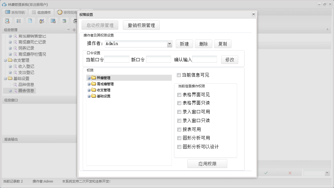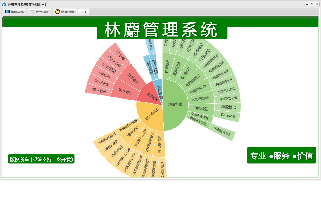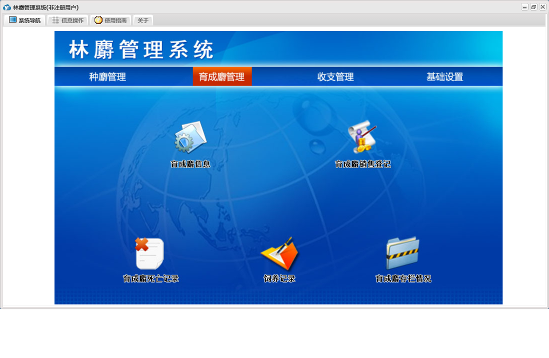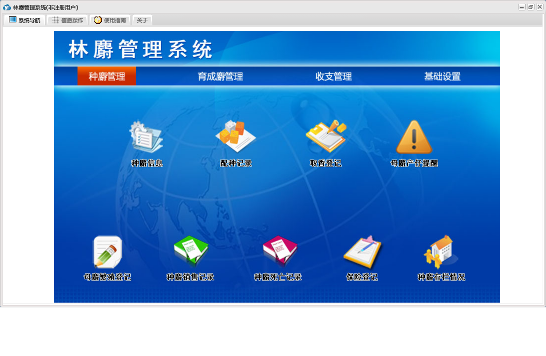 林麝管理系统包含以下功能:收入登记、保险登记、母麝繁殖登记、育成麝信息、收支管理、育成麝死亡记录、种麝管理、饲养记录、权限设置、育成麝销售登记、种麝死亡记录、配种记录、支出登记、种麝销售记录、关于、种麝信息、基础信息、育成麝管理、日志、圈舍信息、取香登记等