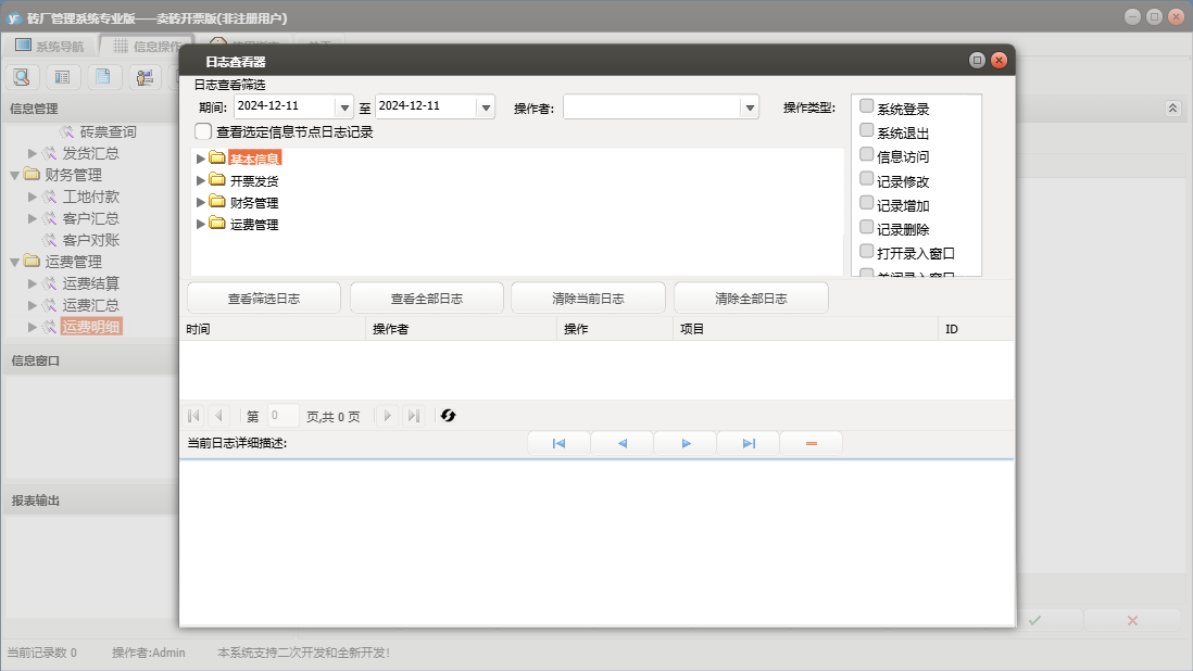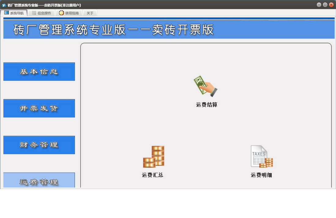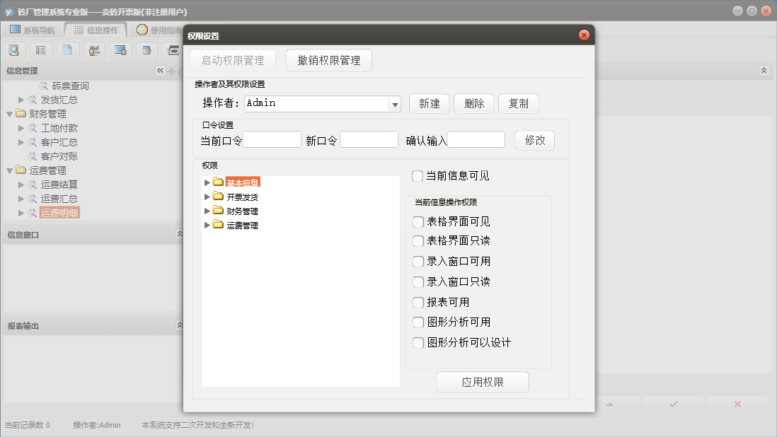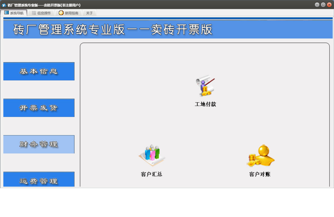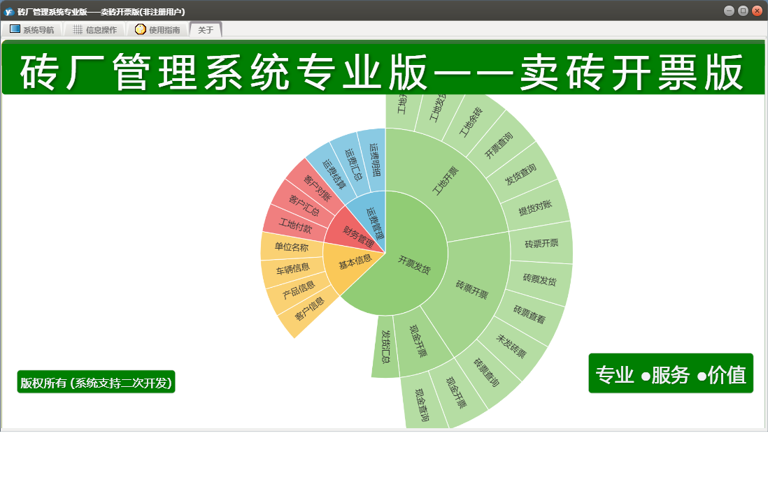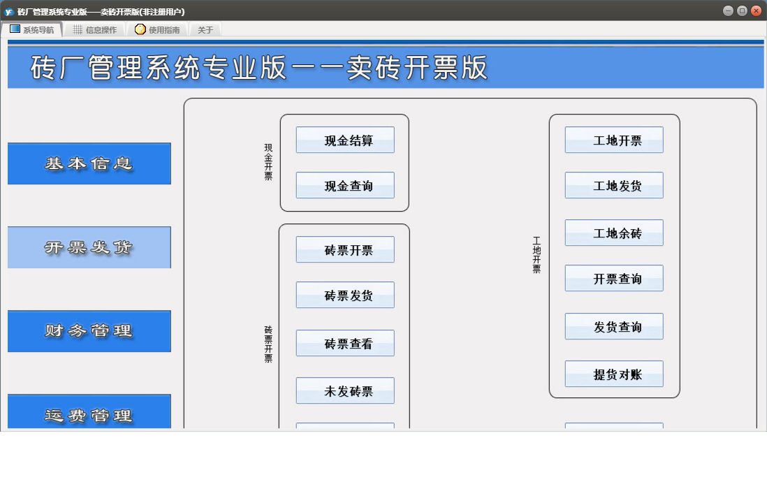 砖厂管理系统专业版——卖砖开票版包含以下功能:现金开票、工地发货、工地付款、砖票发货、日志、关于、开票发货、基本信息、权限设置、工地开票、客户信息、产品信息、砖票开票、财务管理、车辆信息、运费管理等