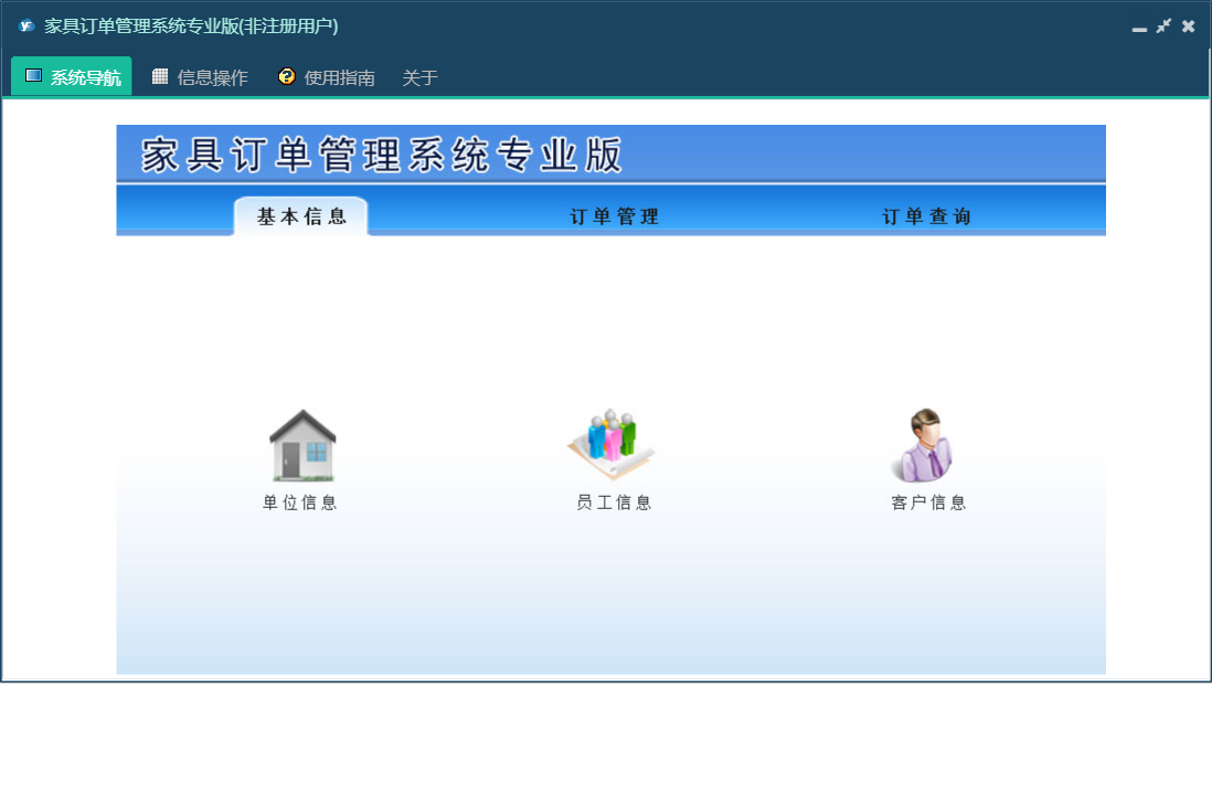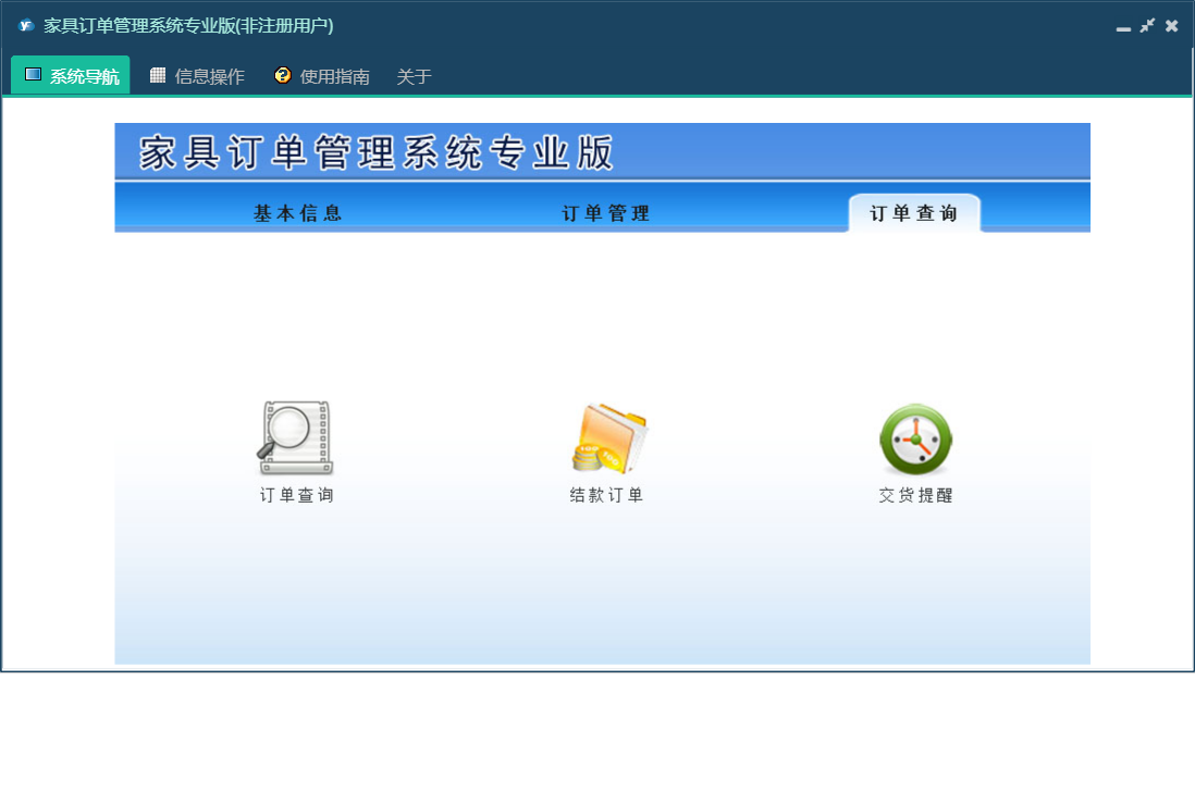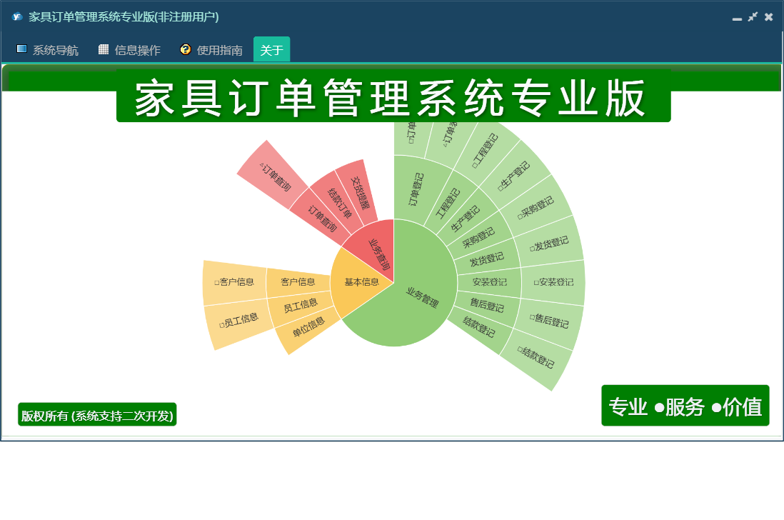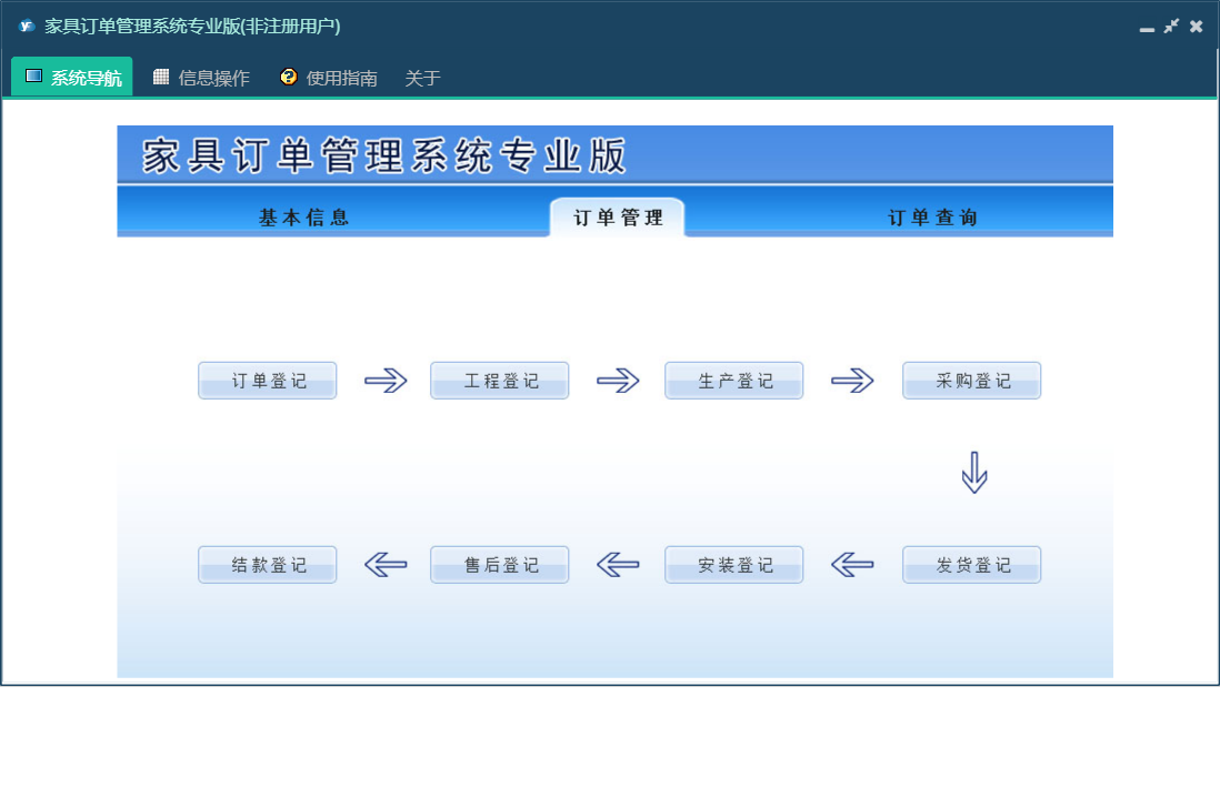 家具订单管理系统专业版包含以下功能:生产登记、工程登记、结款登记、订单查询、售后登记、员工信息、订单登记、安装登记、订单管理、日志、采购登记、关于、发货登记、权限设置、基本信息、客户信息等