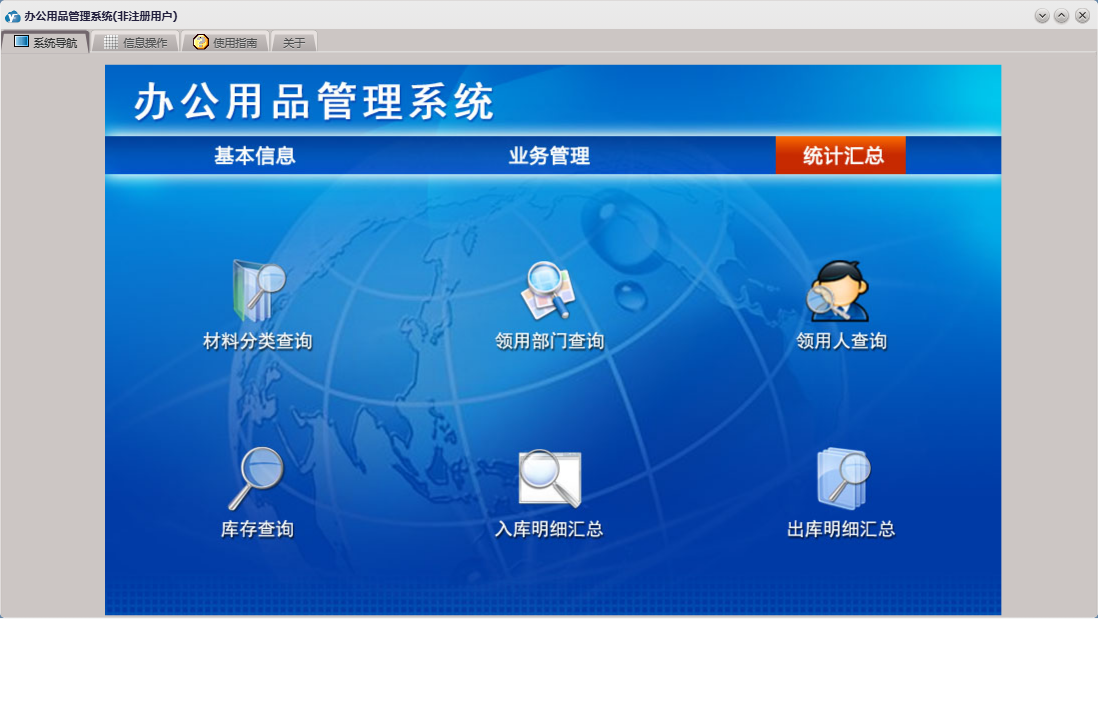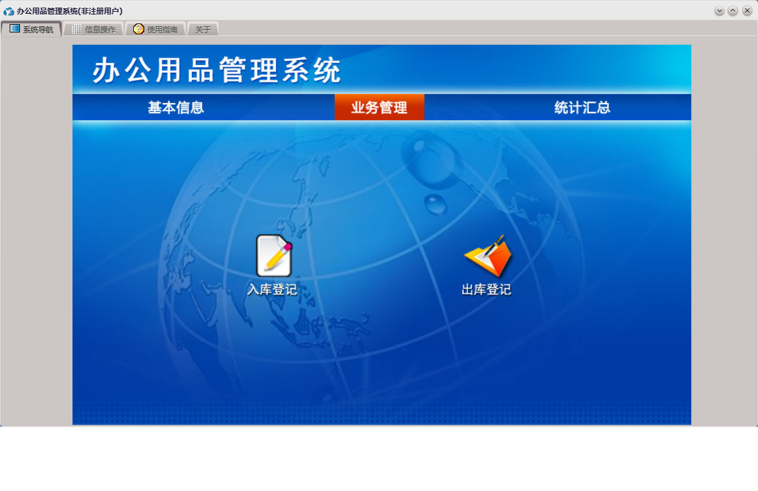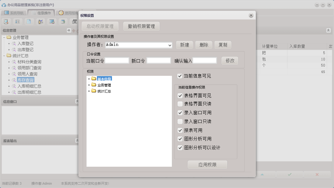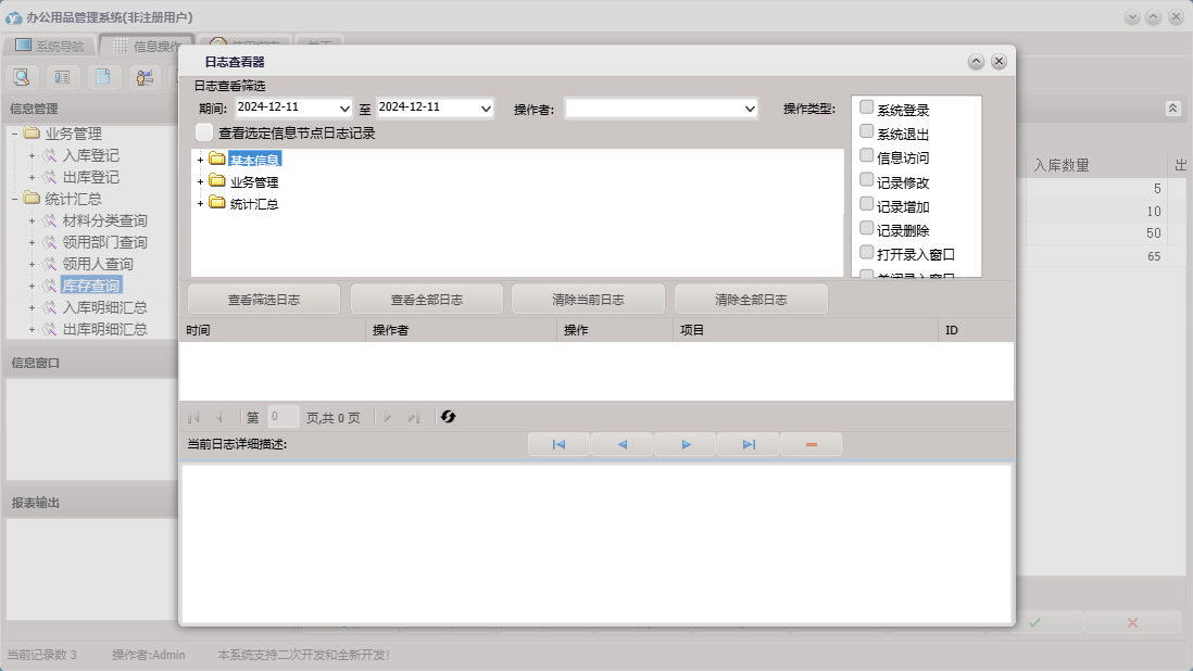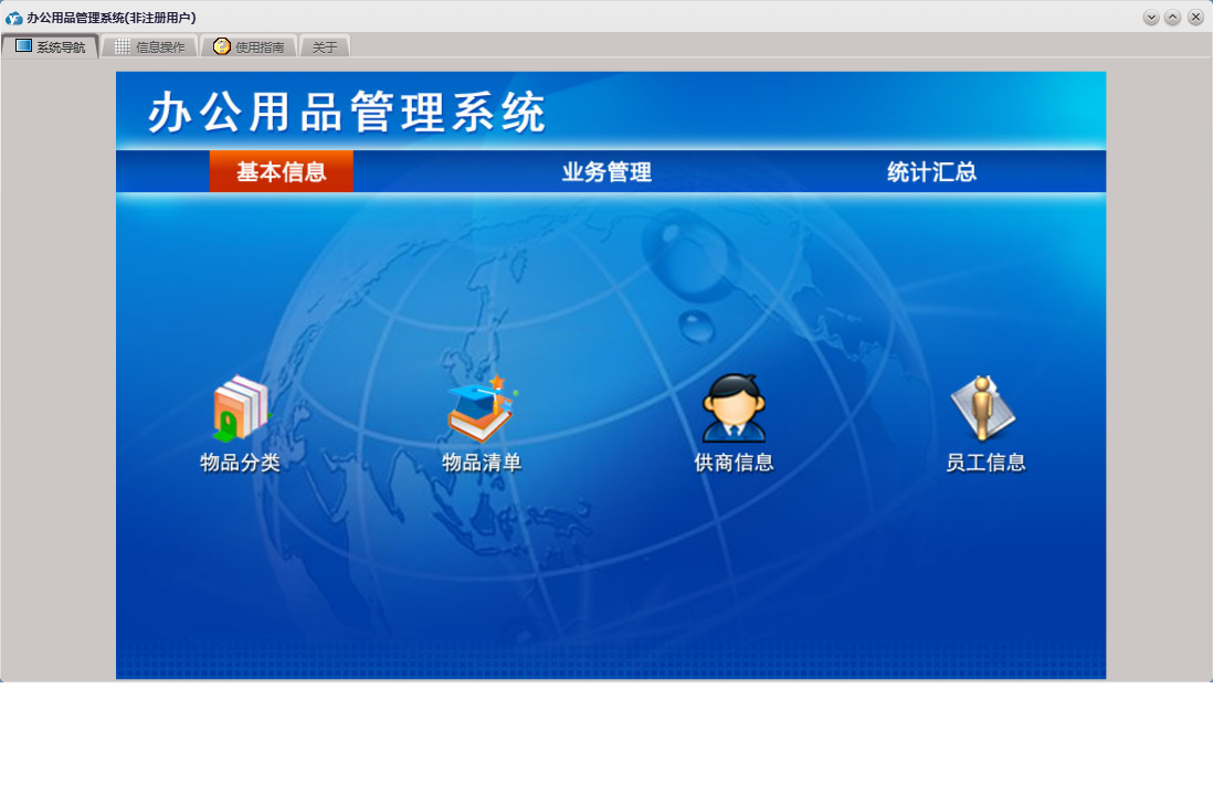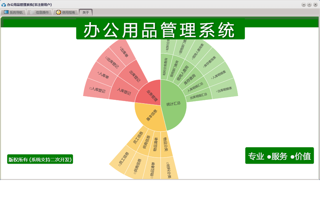 办公用品管理系统包含以下功能:物品分类、入库登记、员工信息、出库登记、日志、统计汇总、关于、权限设置、基本信息、物品清单、业务管理、供商信息等