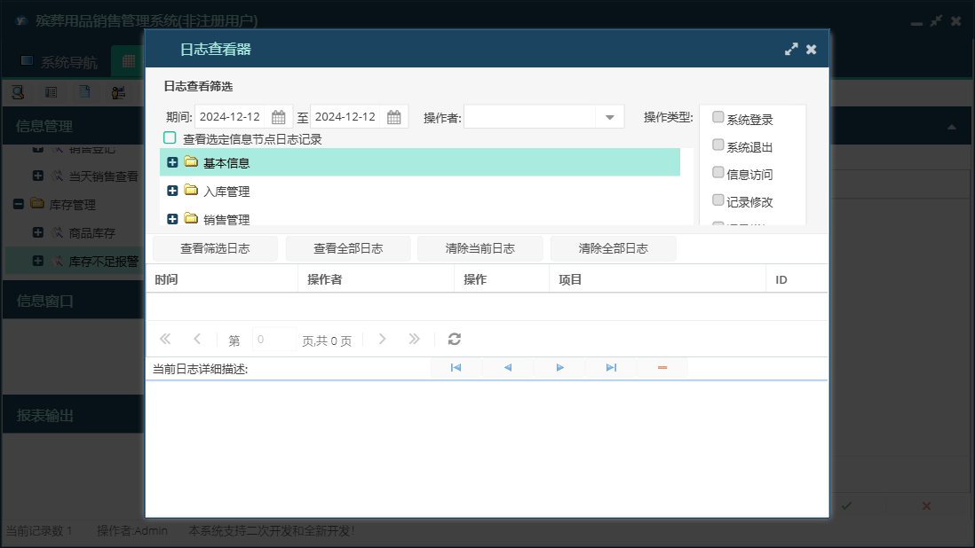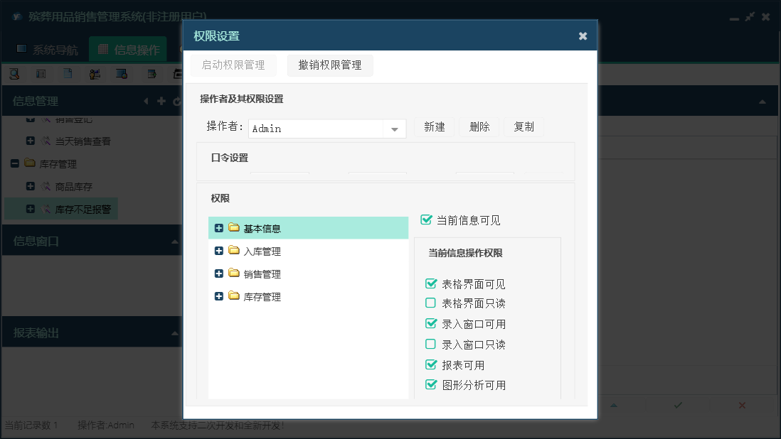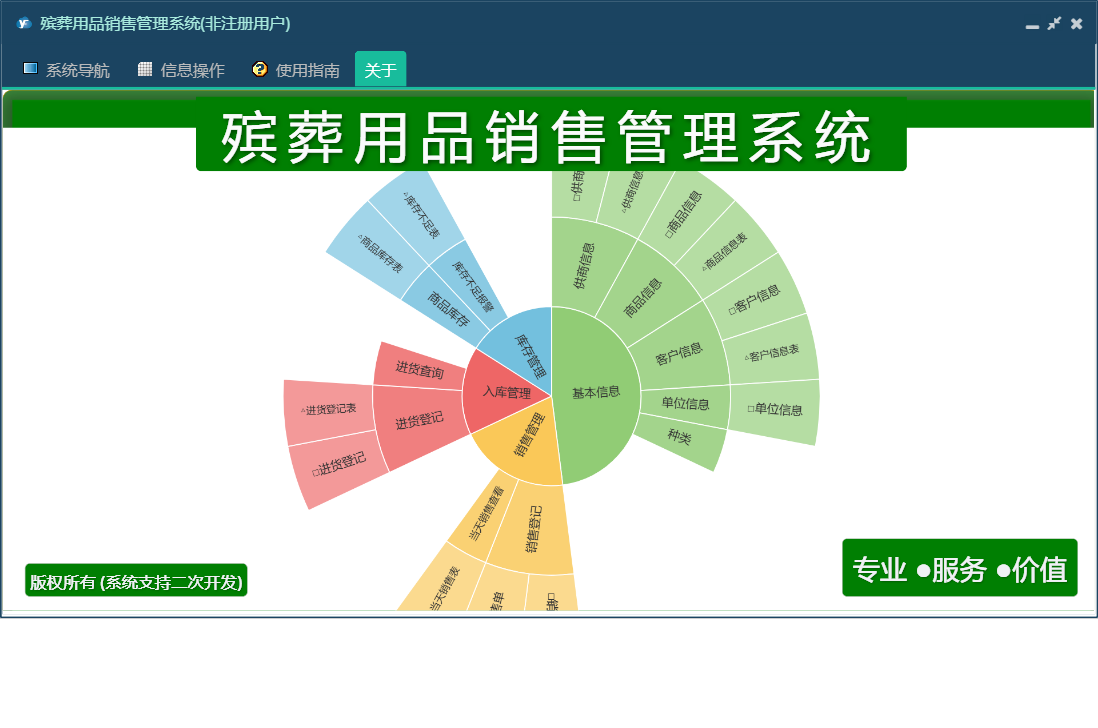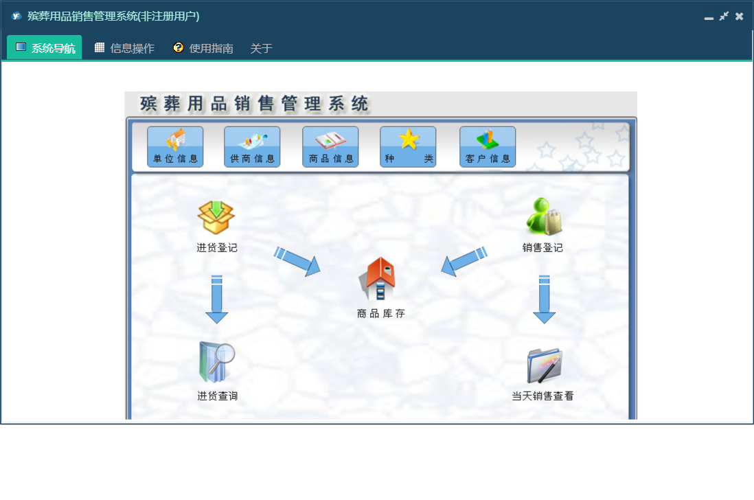 殡葬用品销售管理系统包含以下功能:单位信息、商品信息、供商信息、日志、关于、销售登记、权限设置、客户信息、主面板、进货登记等