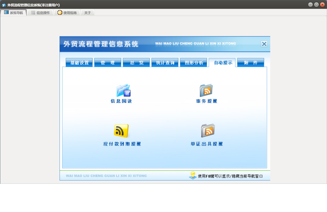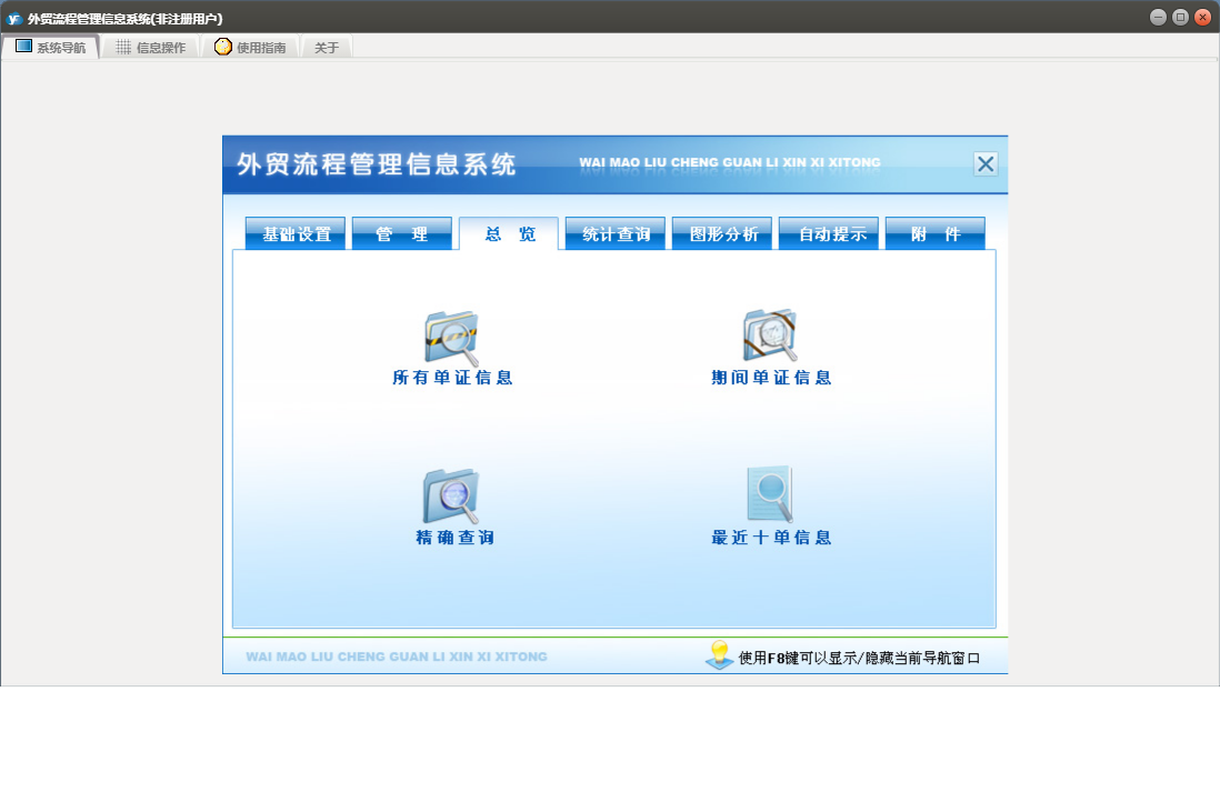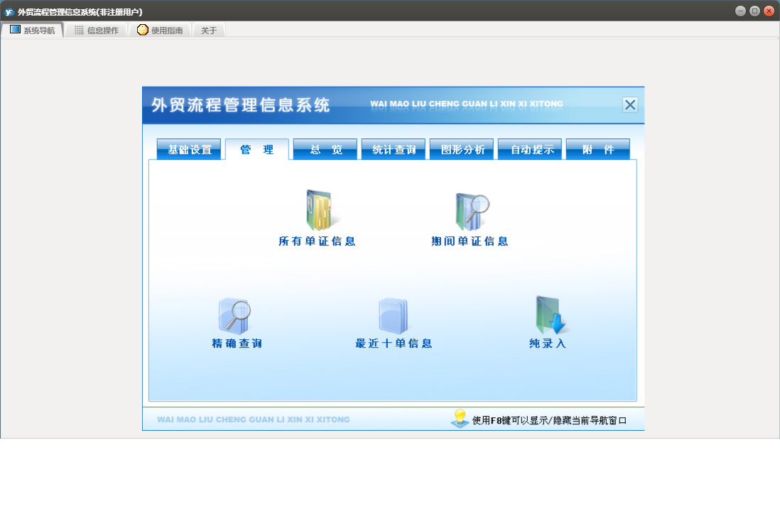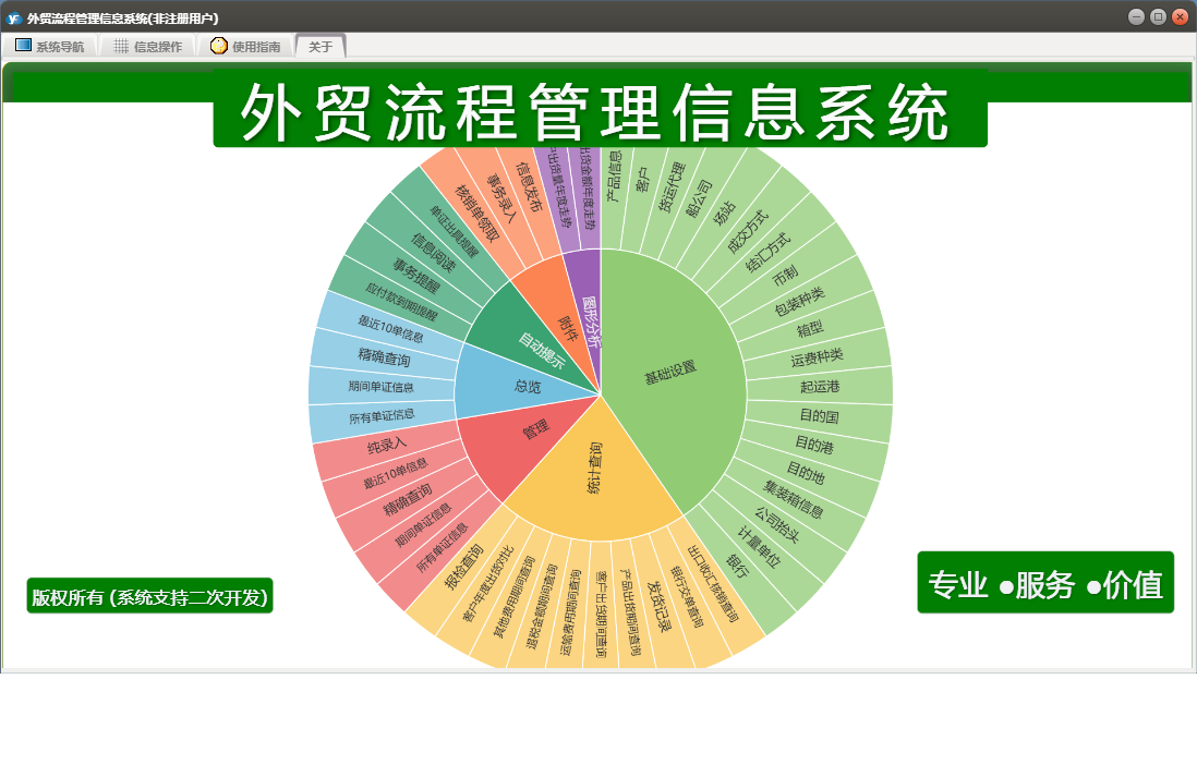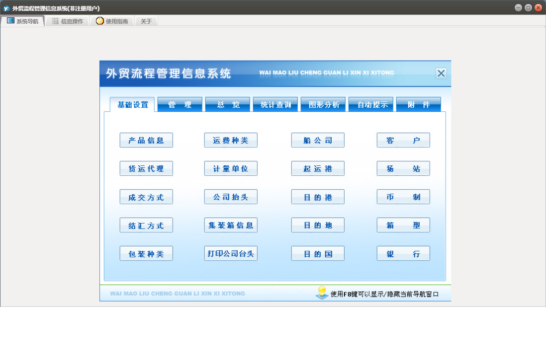 外贸流程管理信息系统包含以下功能:基本设置、币制、管理、产品信息、总览、最近10单信息、目的地、附件、船公司、目的港、场站、客户、事务录入、公司抬头、自动提示、权限设置、统计查询、期间单证信息、结汇方式、成交方式、起运港、包装种类、银行、运费种类、关于、纯录入、精确查询、图形分析、箱型、集装箱信息、信息发布、事务提醒、信息阅读、日志、所有单证信息、货运代理、目的国等